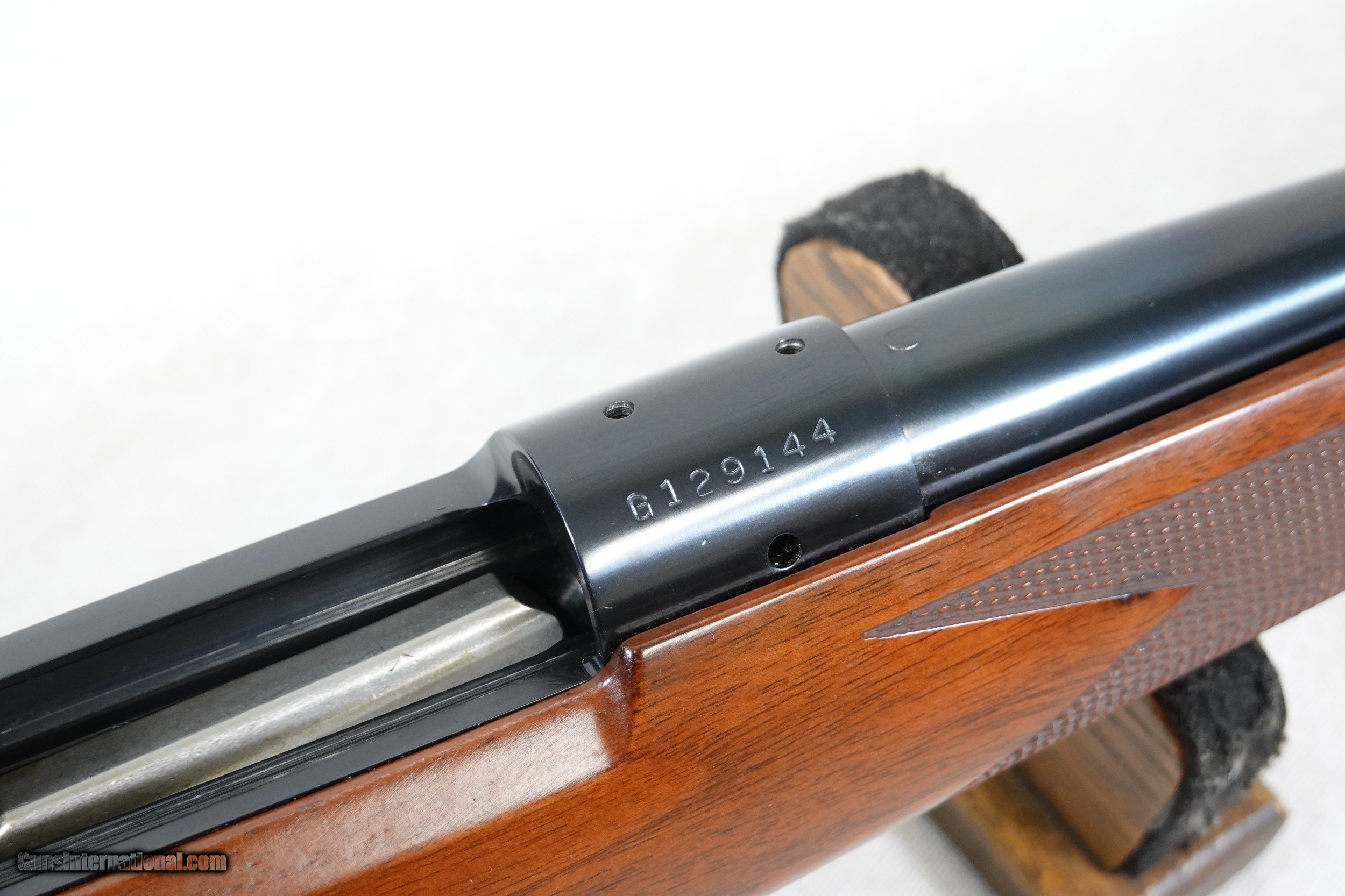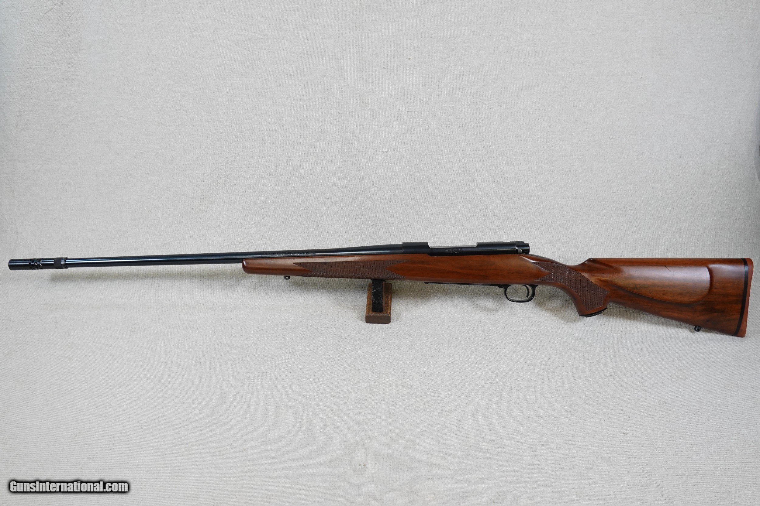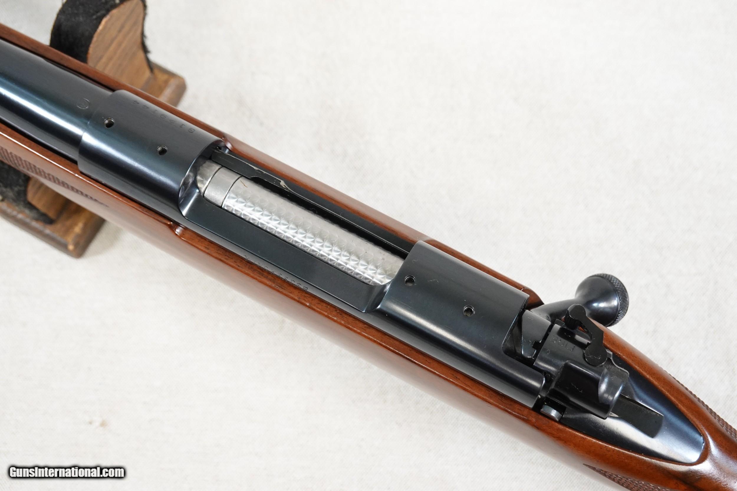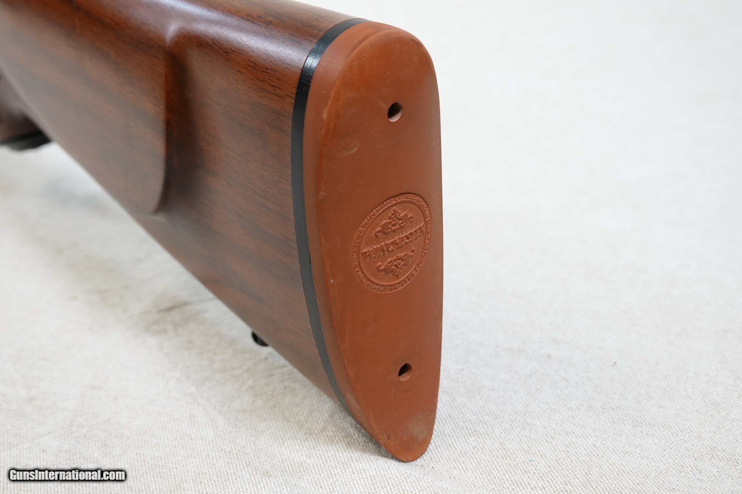 Description: This is a beautiful and rare factory test-fired only New Haven-made Winchester Model 70 Classic Sporter with a factory BOSS system chambered in rarest caliber for this model, the .270 Weatherby Magnum. This caliber was only offered for one year only in 1996, and very few were manufactured. Bought new by the original owner, this rifle was scoped and bore sighted and then put into a safe where it has remained ever since. It was never actually fired or carried afield, and it comes complete with it's original box complete with the serial-numbered factory end-label. This Winchester Model 70 Classic Sporter features a 26" inch barrel with the tunable factory-installed BOSS muzzle brake and the famous pre-64 style controlled round feed action with a Mauser-style extractor, well-known the world over for it's reliability and strength. The condition of the rifle is excellent. If not for a few tiny little safe dings/handling marks it would be pristine. The factory gloss blue finish rates 99%, and the bore is mirror-bright with like-new razor-sharp rifling. The satin-finished and checkered American Walnut stock is in excellent condition as well, free from any cracks, chips, repairs, or major dings/damage. The stock shows only a few tiny safe dings that are only visible under close inspection, and the factory stock hardware is in like-new condition. The buttstock was factory fit with a Winchester-branded recoil pad and the length of pull is 13.75" inches to the end of the pad, the factory original length. The action on this rifle is very slick and precise, and the bolt turns into battery with no grit or slop. All of the controls on this Winchester are in perfect working order, including the trigger which is excellent for a factory unit. If you have been looking for a American-made vintage Winchester Model 70 for your collection in a very rare caliber this is it! It would be all but impossible to upgrade from this beauty. Sorry no owner's manual, the box is empty other than a factory packing slip. SOLD Rifle Caliber: .270 Weatherby Magnum Manufacturer: Winchester (New Haven) Model: Model 70 Classic Sporter w/ Pre-64 Style Action & BOSS Serial Number: G129144 Barrel Length: 26" Inches Condition: Excellent Metal Condition: Excellent Wood Condition: Excellent Bore Condition: Mint Barrel Type: Standard Sporting Contour Action: Bolt Action Repeater Stock: Checkered Satin American Walnut Pistol Grip Stock Butt Pad: Factory Winchester Recoil Pad LOP: 13.75" Inches (Factory Length) Finish: Gloss Blue Sights: None Manufacture Date: 1996 Extras: w/ Original Box & Packing Slip |