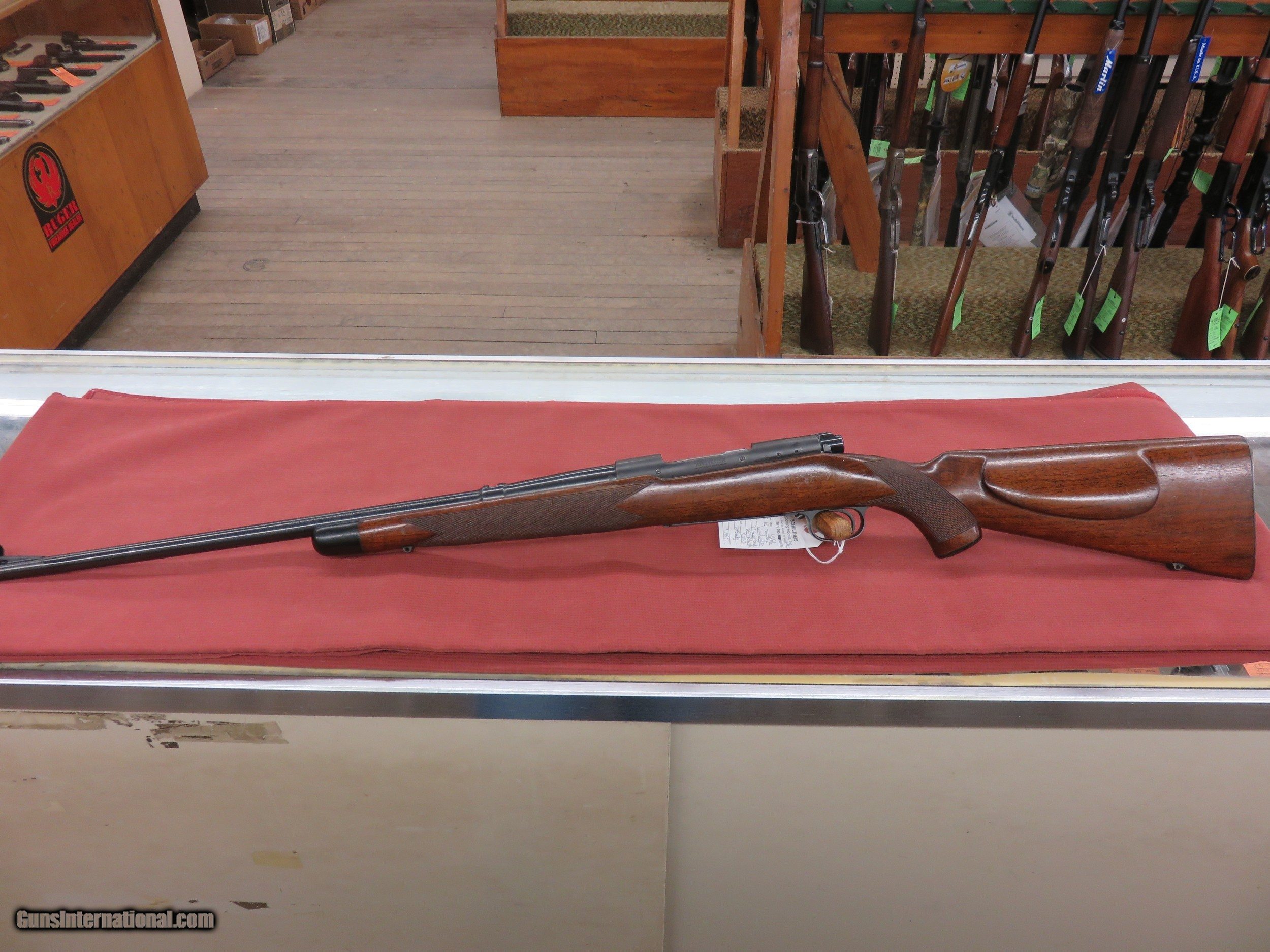 Description: Winchester Model 70 Super Grade, pre-64, 257 Roberts, #80XXX, 1948 mfg, transition gun with cloverleaf tang, and factory drilled rear bridge and pre-war safety, 93% blue and wood varnish, left side of receiver has 2 holes drilled for a side scope mount which has been removed, and about 3 1/2" of the stock on left side has been inletted for old scope mount, excellent bore, matching bolt, no alteration to the bolt handle, an excellent shooter. SOLD |