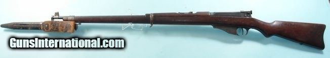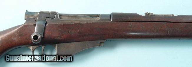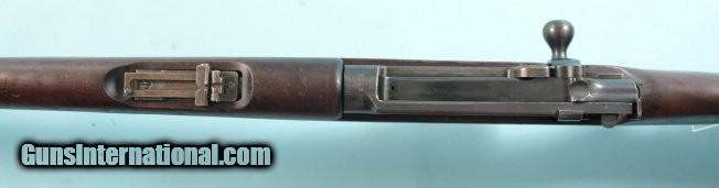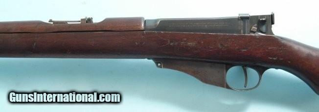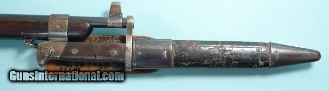 Description: SUPERB SPANISH-AMERICAN WAR FIRST CONTRACT PRE 1899 WINCHESTER-LEE U.S. NAVY STRAIGHT PULL 6MM RIFLE W/BAYONET AND SCABBARD. Serial numbered in the 6xxx range. All original and matching U.S. Marine Corps First Contract issued in time for the Spanish-American War Cuban campaign as well as the Boxer Rebellion. In top condition with 95% original blue and the original finish on stock and hand guard. Working order and excellent bright bore. Shows only modest use. Has the original U.S. Ordnance inspected bayonet (TRIANGLE/T) with scabbard and leather belt attachment also in excellent condition. Nicest one we have had. Rarely seen in such nice condition. SOLD Antique: Yes Rifle Caliber: 6mm Lee Navy |