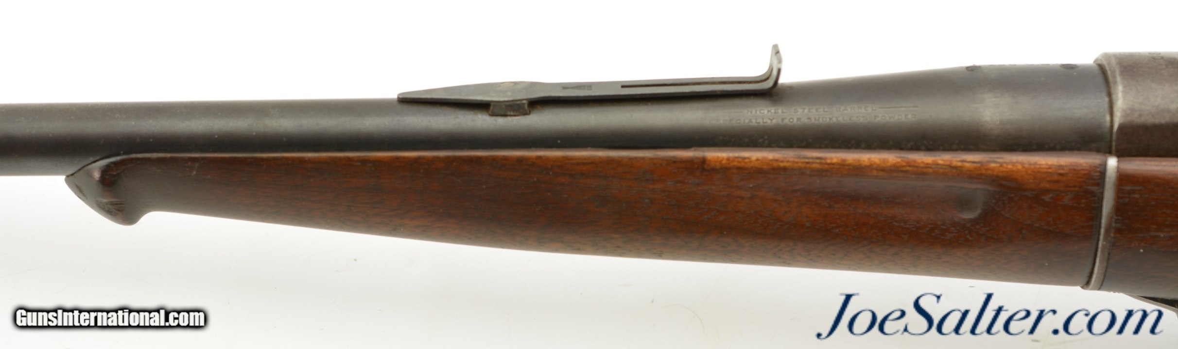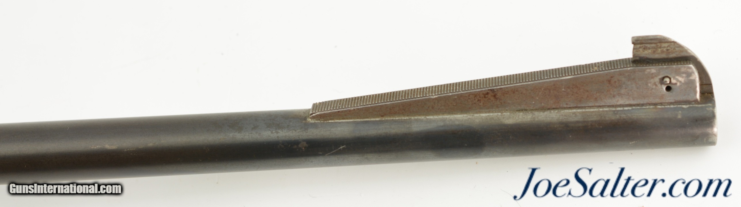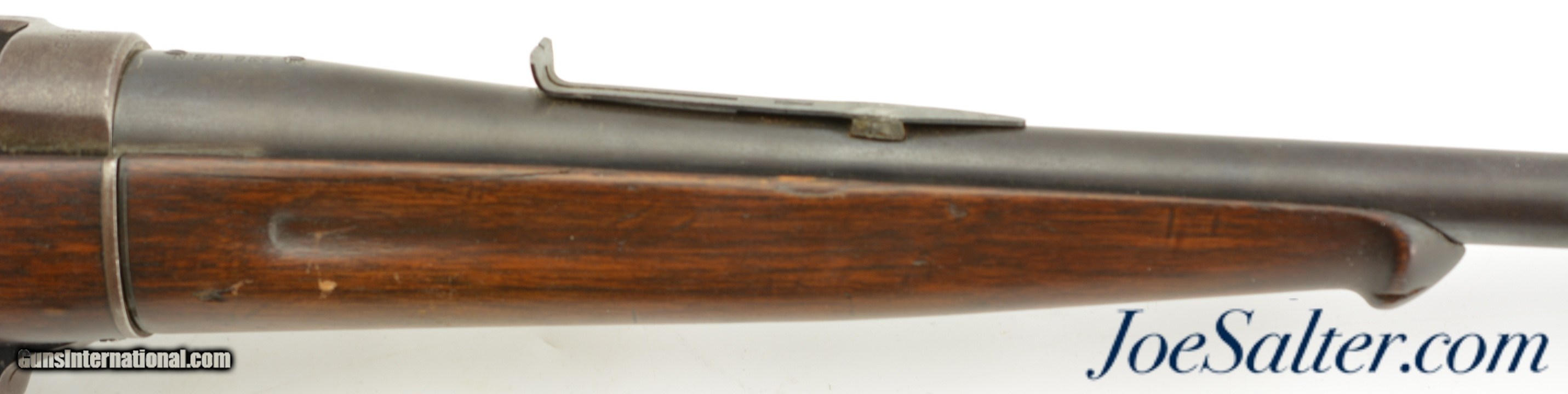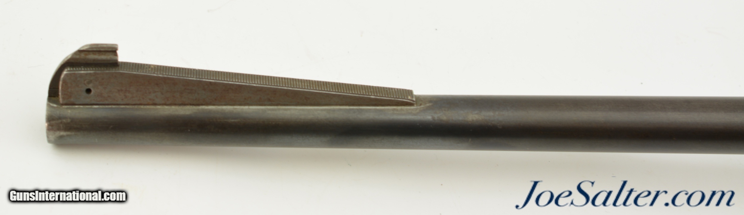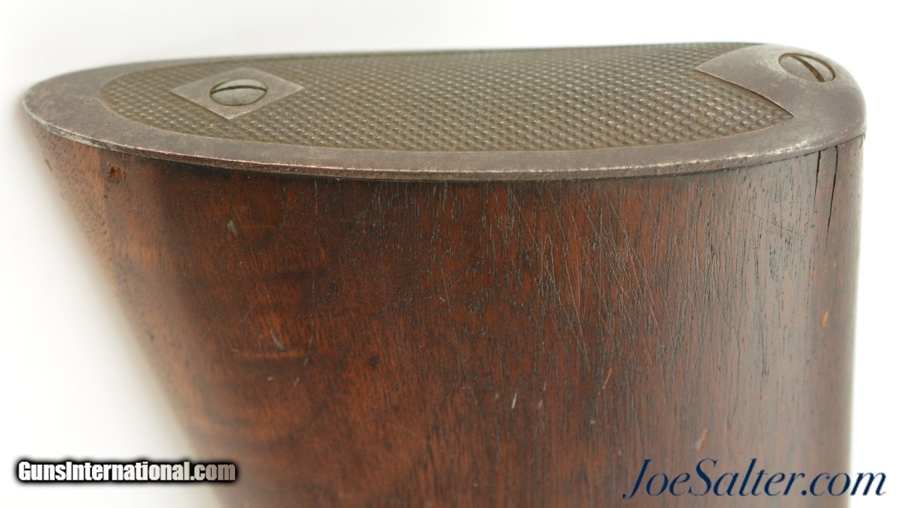 Description: Serial #10895, 6mm Lee (.263 Caliber), 24" barrel with a fine, bright bore that has a very small amount of freckling within the grooves at the muzzle. This is an 1898-made rifle that has about 60-70% of the original blue remaining on the barrel and receiver, with silvering at the muzzle, along the sides of the front sight ramp, and a plum-brown patina on the balance. The bolt is correct for a sporting rifle (two gas escape vents instead of one) and retains about 80-85% of the original blue, with some fading and freckling on the handle. The left side of the receiver has two later addition screw holes for what was probably a side scope mount, and two additional screw holes added to the top of the barrel breech. Light, but fully legible William Sheard retailer markings are present above the Winchester roll marking: "FROM W.F. SHEARD TACOMA, WASH." William F. Sheard (1861 - 1932) was a gunsmith and designer, most famous for his sight designs. He was active in the gun trade in Montana from 1884 - 1895, after which he moved to Tacoma, WA. Guns retailed by his shop were often marked in this manner. The walnut stock has a schnabel-tipped, grooved forend and checkered pistol grip with hard rubber Winchester grip cap. Numerous small handling marks and surface blemishes are present, as well as some wood repairs on the left side where the scope mount was once installed, along the left rear of the barrel channel, and another repair at the toe of the butt. A finely checkered original steel buttplate is present. At some point, the stock was converted to two-piece with the addition of a contoured steel plate just ahead of the magazine housing. The rifle has a non-original, period sporting front sight blade, a BSA rear barrel sight (missing the elevation riser), and the rear of the bolt has a period dovetail plate added in order to mount an aperture rear sight. The action requires some attention as the bolt will not lock closed unless the trigger is depressed. The rifle is accompanied by 2019 Cody Data Sheet that confirms the rifle was built as a sporter and lists reception in the warehouse on June 6, 1898. The rifle was eventually shipped on January 15, 1908 as order number 136453. Original Winchester-Lee sporting rifles are not often encountered, especially examples marked with W.F. Sheard's retail stamp, and this example rates good-near very good condition overall. Antique; SOLD Antique: Yes |