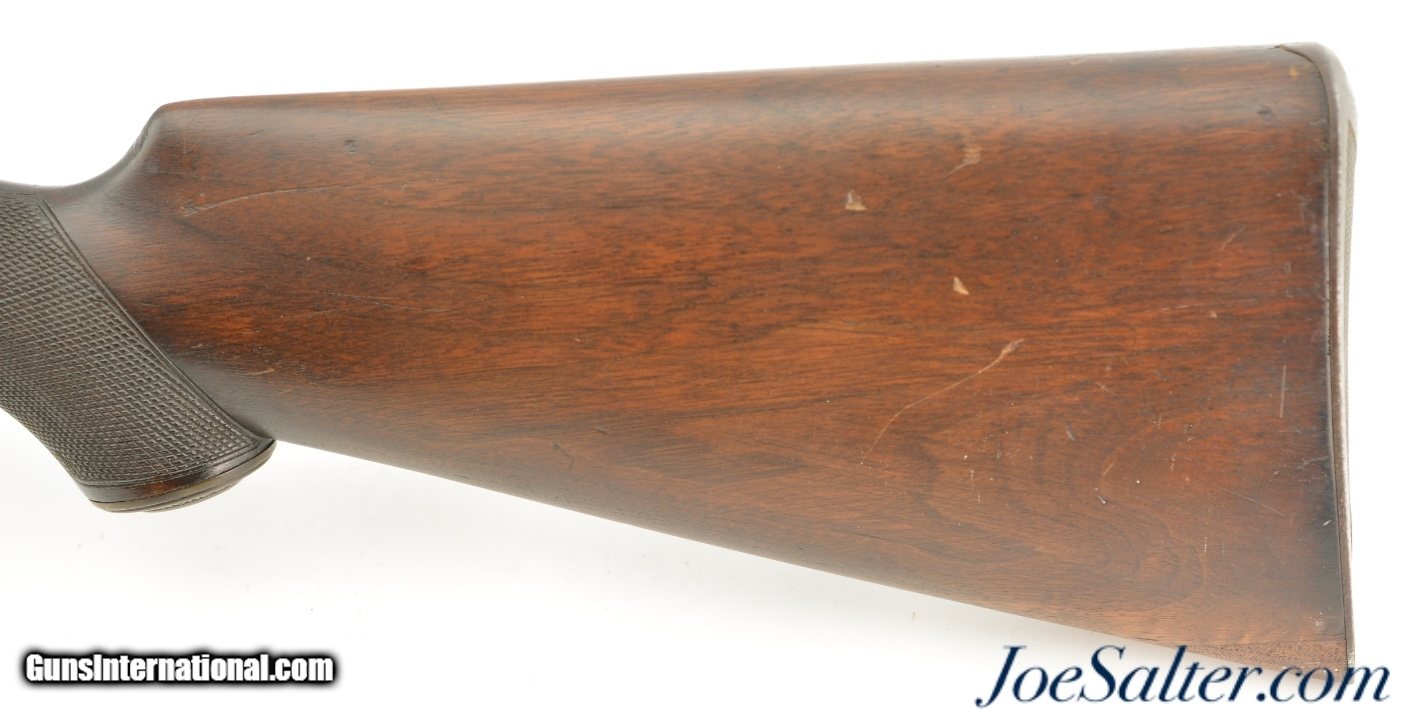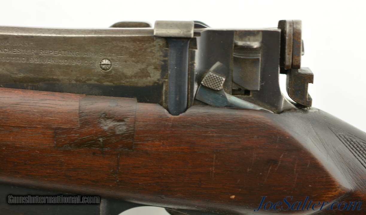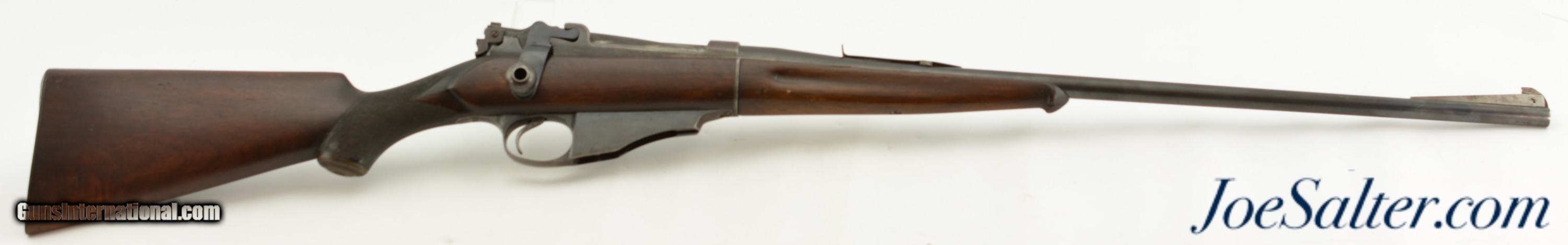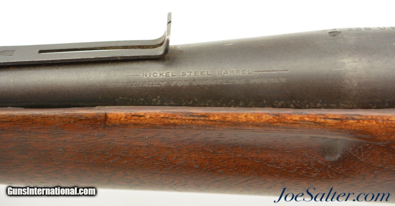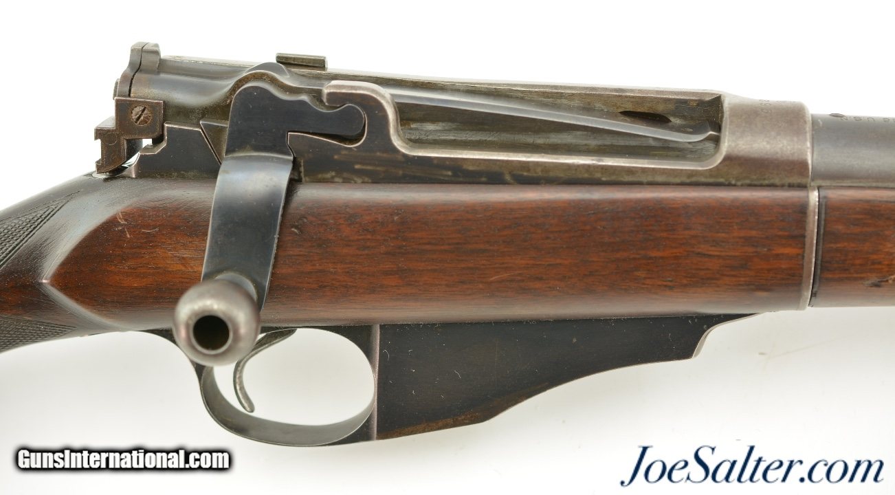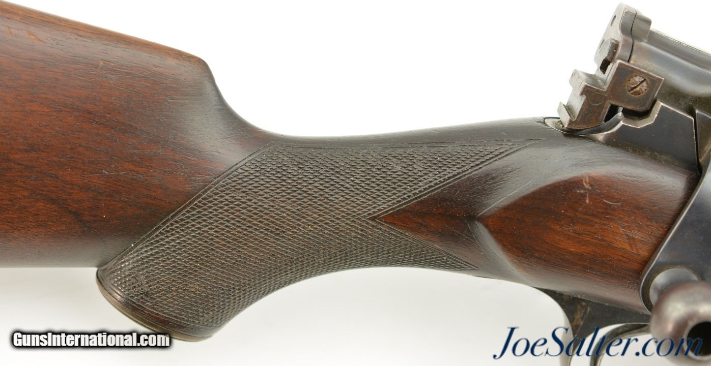 Description: Serial #10895, 6mm Lee (.263 Caliber), 24" barrel with a fine, bright bore that has a very small amount of freckling within the grooves at the muzzle. This is an 1898-made rifle that has about 60-70% of the original blue remaining on the barrel and receiver, with silvering at the muzzle, along the sides of the front sight ramp, and a plum-brown patina on the balance. The bolt is correct for a sporting rifle (two gas escape vents instead of one) and retains about 80-85% of the original blue, with some fading and freckling on the handle. The left side of the receiver has two later addition screw holes for what was probably a side scope mount, and two additional screw holes added to the top of the barrel breech. Light, but fully legible William Sheard retailer markings are present above the Winchester roll marking: "FROM W.F. SHEARD TACOMA, WASH." William F. Sheard (1861 - 1932) was a gunsmith and designer, most famous for his sight designs. He was active in the gun trade in Montana from 1884 - 1895, after which he moved to Tacoma, WA. Guns retailed by his shop were often marked in this manner. The walnut stock has a schnabel-tipped, grooved forend and checkered pistol grip with hard rubber Winchester grip cap. Numerous small handling marks and surface blemishes are present, as well as some wood repairs on the left side where the scope mount was once installed, along the left rear of the barrel channel, and another repair at the toe of the butt. A finely checkered original steel buttplate is present. At some point, the stock was converted to two-piece with the addition of a contoured steel plate just ahead of the magazine housing. The rifle has a non-original, period sporting front sight blade, a BSA rear barrel sight (missing the elevation riser), and the rear of the bolt has a period dovetail plate added in order to mount an aperture rear sight. The action requires some attention as the bolt will not lock closed unless the trigger is depressed. The rifle is accompanied by 2019 Cody Data Sheet that confirms the rifle was built as a sporter and lists reception in the warehouse on June 6, 1898. The rifle was eventually shipped on January 15, 1908 as order number 136453. Original Winchester-Lee sporting rifles are not often encountered, especially examples marked with W.F. Sheard's retail stamp, and this example rates good-near very good condition overall. Antique; SOLD Antique: Yes |