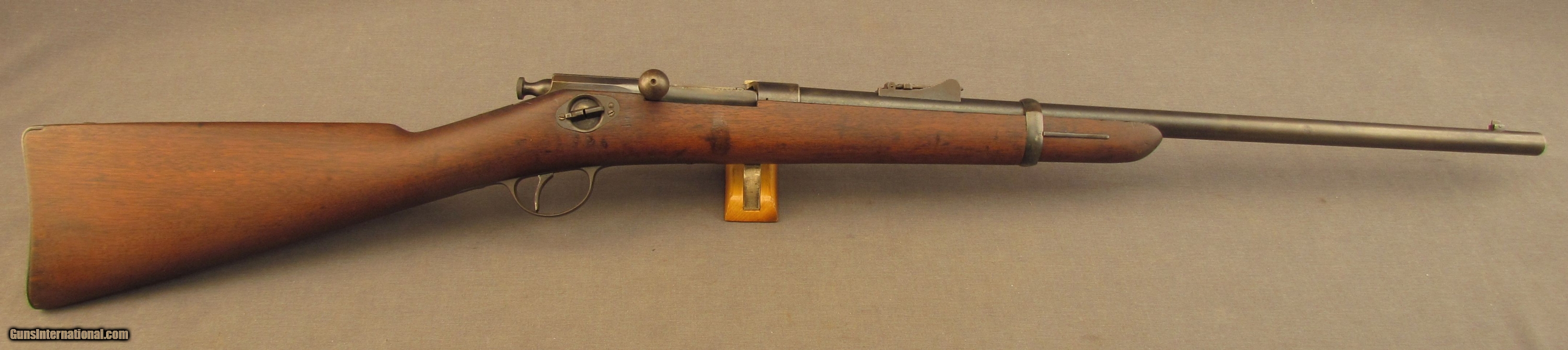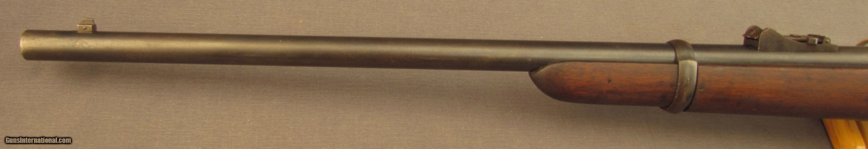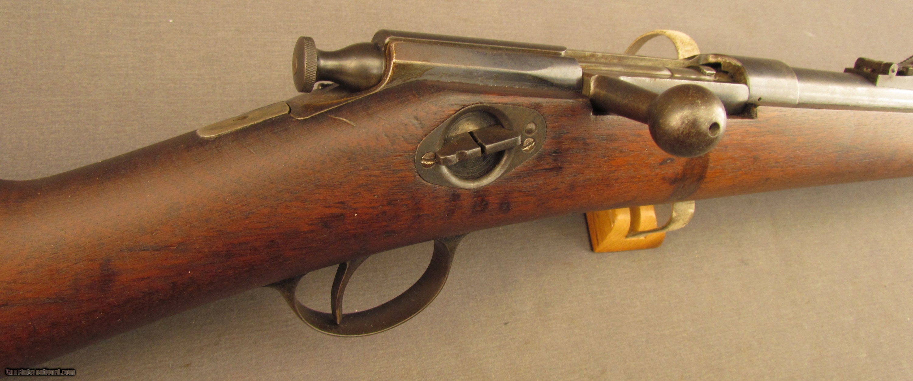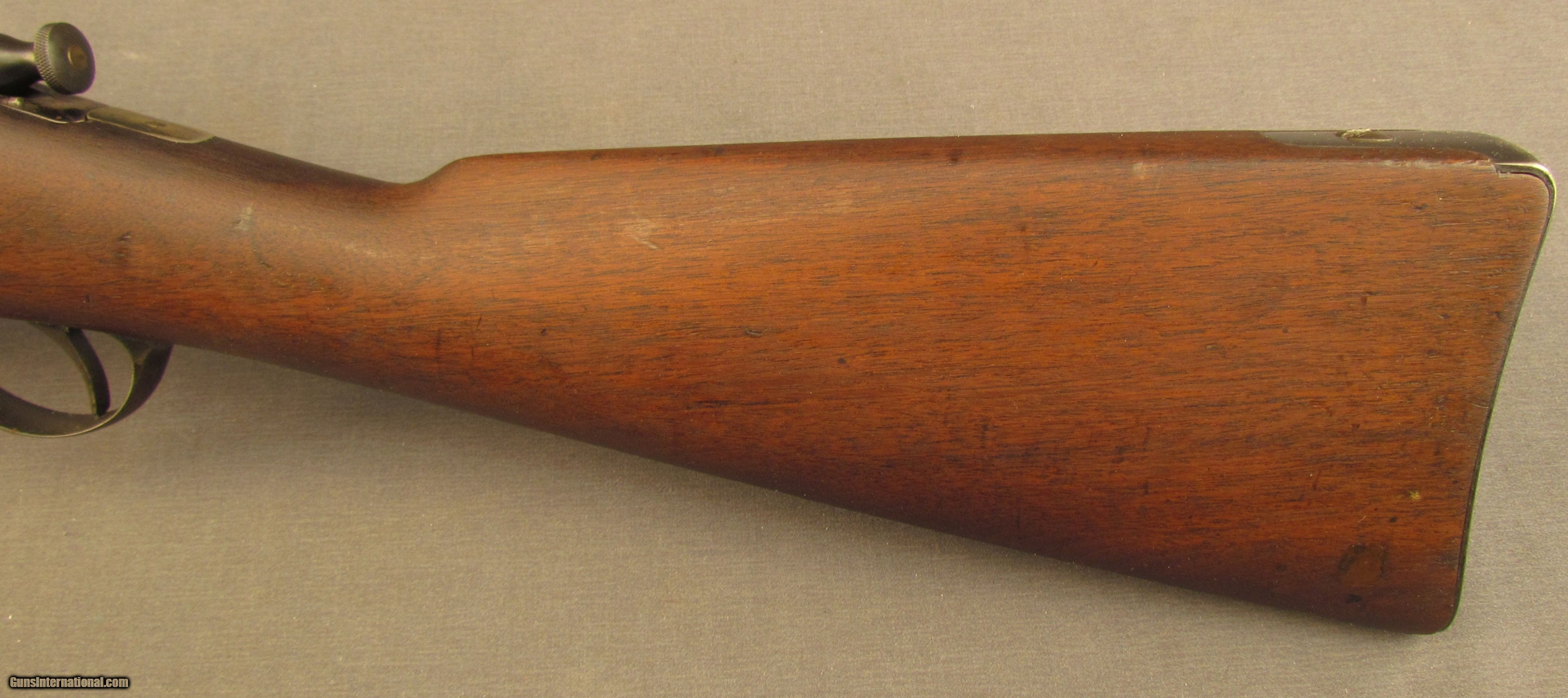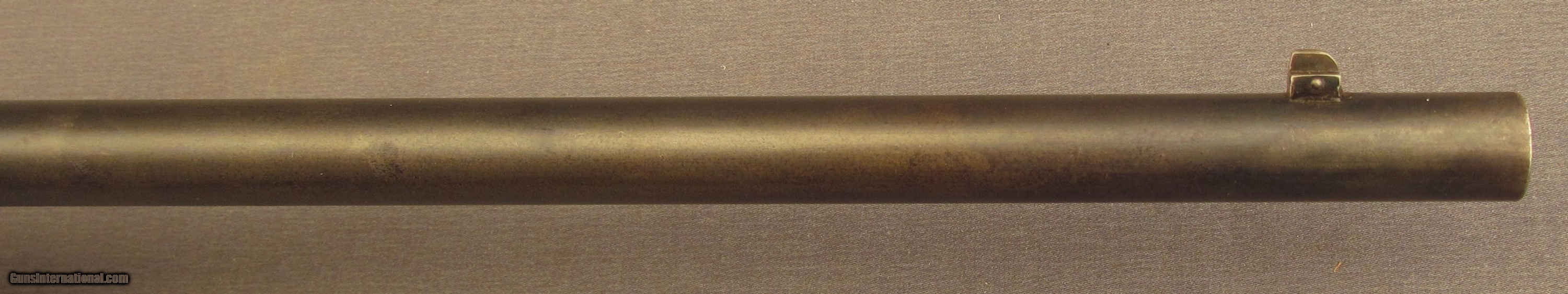 Description: Serial #12284, .45-70, 24” barrel with a fine, bright bore. This is a handsome carbine that has approximately 80-85% of the original blue finish that has blended smoothly with a gray-brown freckled patina on the balance. The bolt has an armory bright finish along the body with dark plum-brown on the handle and some original blue on the cocking-piece. The walnut stock has been sanded and refinished to excellent condition with very nice textured grain, and there are no cracks or breaks at the wrist, unlike most other 1st Model examples. The saddle ring loop is still present and the carbine rates fine condition overall. Antique SOLD Antique: Yes Manufacturer: Winchester Model: Hotchkiss Serial Number: 12284 Caliber Info: .45-70 Gauge Info: .45-70 |