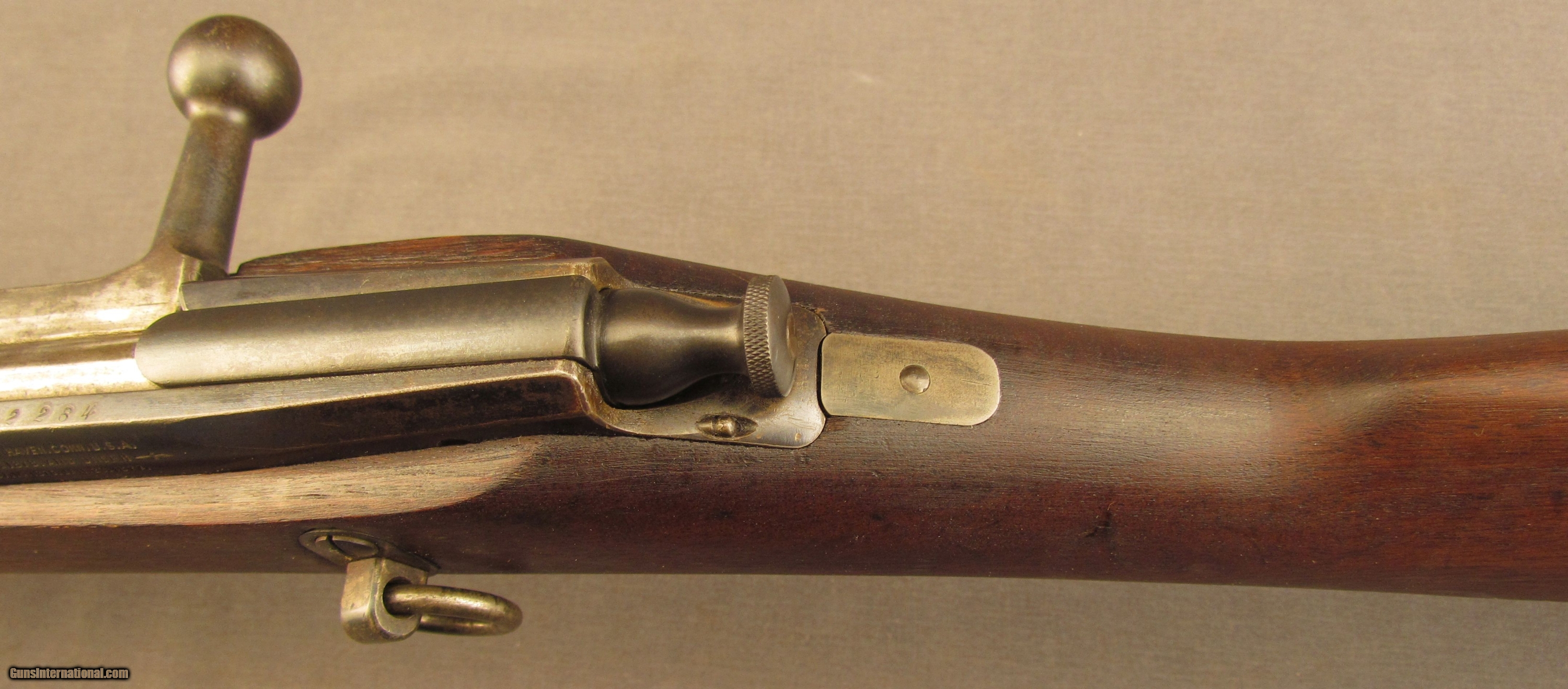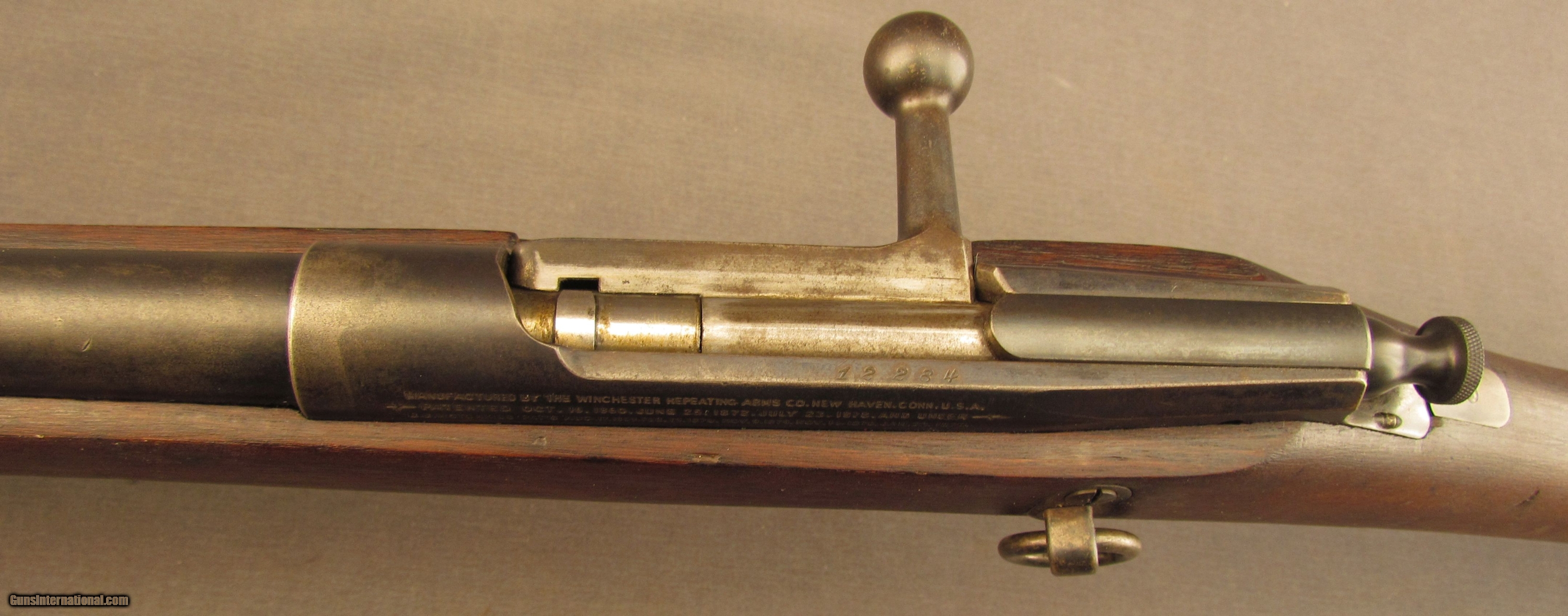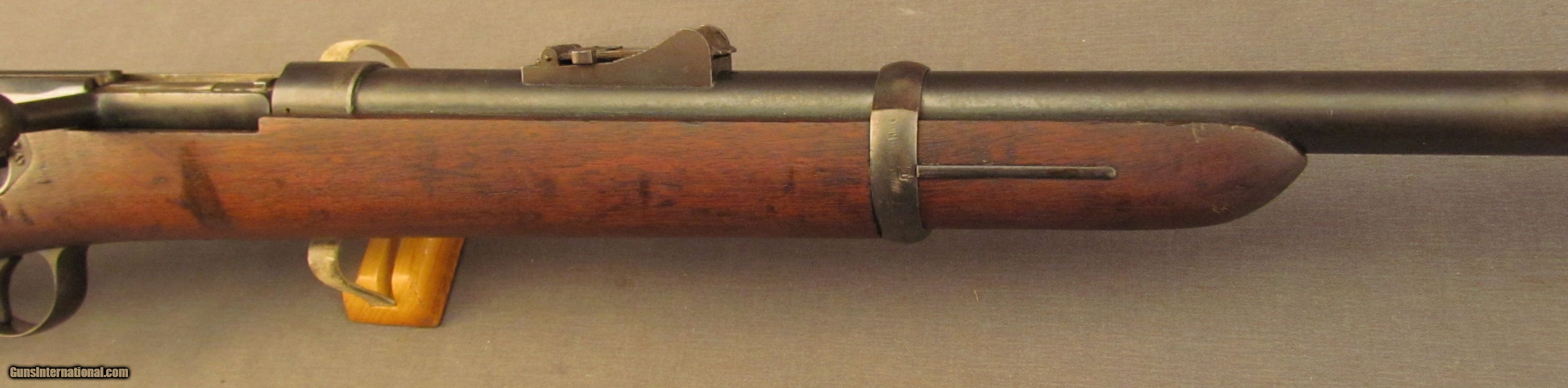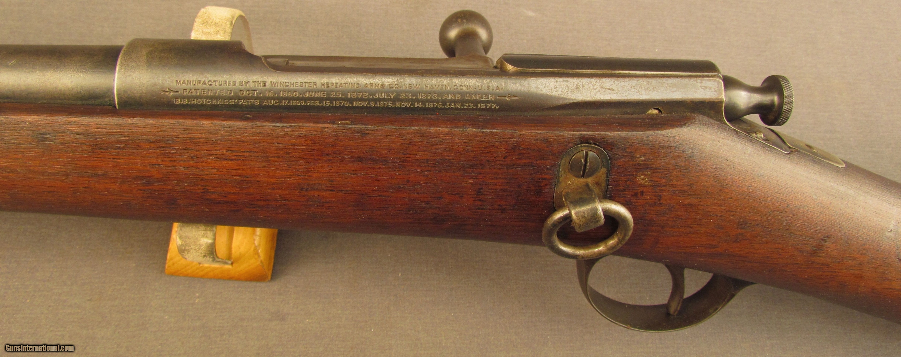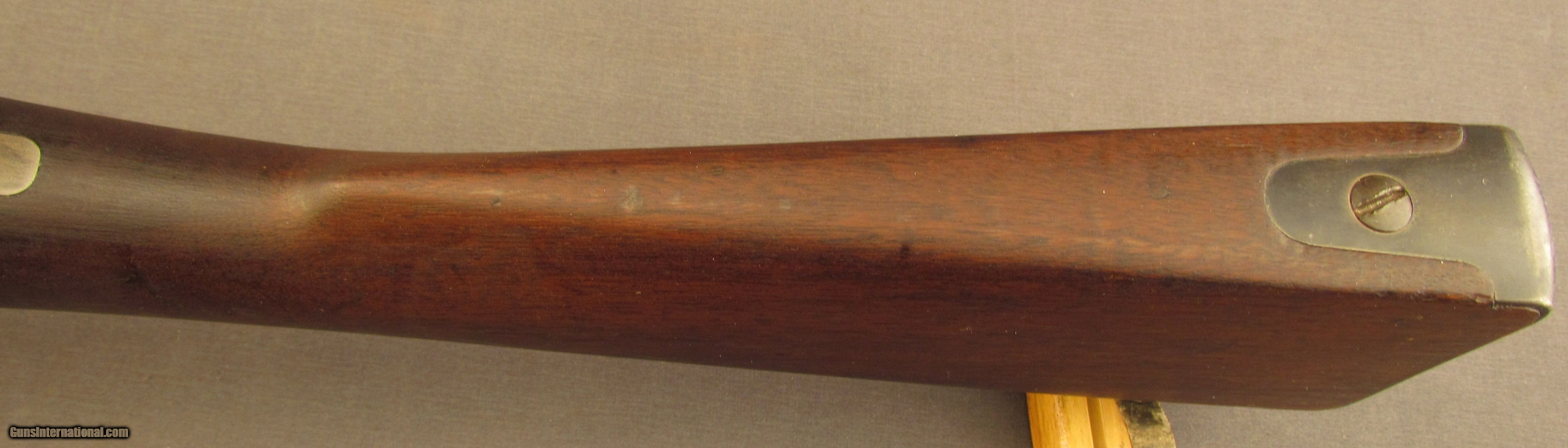 Description: Serial #12284, .45-70, 24” barrel with a fine, bright bore. This is a handsome carbine that has approximately 80-85% of the original blue finish that has blended smoothly with a gray-brown freckled patina on the balance. The bolt has an armory bright finish along the body with dark plum-brown on the handle and some original blue on the cocking-piece. The walnut stock has been sanded and refinished to excellent condition with very nice textured grain, and there are no cracks or breaks at the wrist, unlike most other 1st Model examples. The saddle ring loop is still present and the carbine rates fine condition overall. Antique SOLD Antique: Yes Manufacturer: Winchester Model: Hotchkiss Serial Number: 12284 Caliber Info: .45-70 Gauge Info: .45-70 |