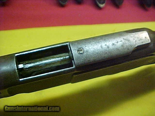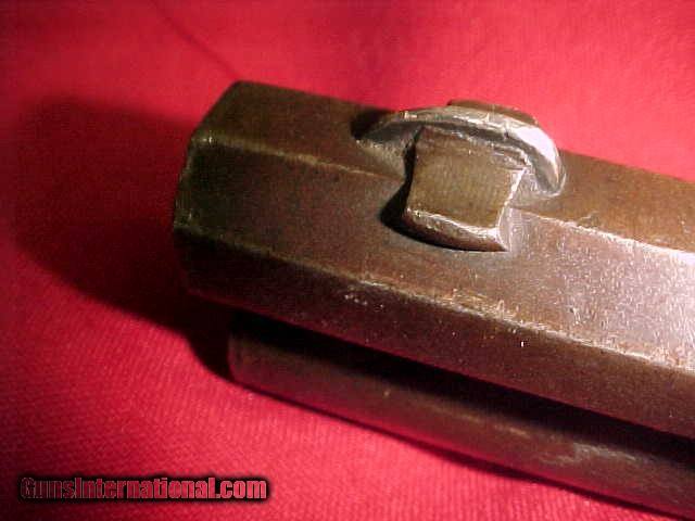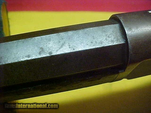 Description: #3893 Winchester 1873 OBFMCB over-length 26” barrel length and standard trigger, 44WCF, and being a mid-to-late 3rd Variation in the 112XXX range (1884) with a smooth, tight action and a 6+/7 bore that looks like it will clean to be a solid 7 to 7-1/2 (on a scale of 10). This handsome rifle still has the unmarked brass cartridge caliber elevator and unmarked barrel breech that was common on these early 44-caliber Model 1973s and it also has the 2nd Model style short based rear barrel sight. The metal is VG+ with only light mottling of the patina, but nothing objectionable. The G/G+wood has medium bumps, scrapes, and bruises as well as some minor forearm “dishing” from being carried over a saddle. (…Oh, and a lightly scratched “K” on the left side of the buttstock wrist). The metal has a thin plum brownish-grey patina with some original blue-brown on the lower flats, and a few very light patina spots on the frame sides, but no mentionable rust or pitting. The edges and markings are all VG. A very nice ’73, at least VG+. $2395. SOLD Antique: Yes |