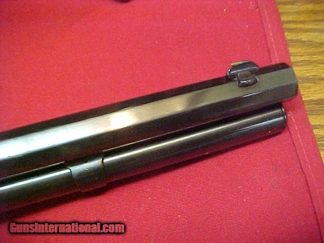 Description: #4824 Winchester 1894 rifle, OBFMCB 30WCF, with a VG+ bore (about a 7+ on a scale of 10), 51XXX serial range (1896), smooth tight solid action. The exterior retains 99% coverage of a 95% density total refinish blue on the frame, barrel and magazine and all metal parts (…which is incorrect, as the lever, hammer, and buttplate should have been case colored. There is some minor “rounding” to the barrel edges due to a somewhat over-zealous buffing during the refinishing, but basically it has fine metal. Fine markings, and fitted with the correct rear tang flip-up peep-sight as well as the scarce three leaf Express rear barrel sight, and Rocky Mountain open blade front. Excellent wood with absolutely no mentionable deficits. Overall, just a nice and VERY handsome antique 122 year old Winchester in a VERY desirable caliber that is being available almost anywhere that ammunition is sold. Excellent, as refinished. $1465 SOLD Antique: Yes |
