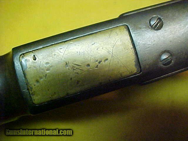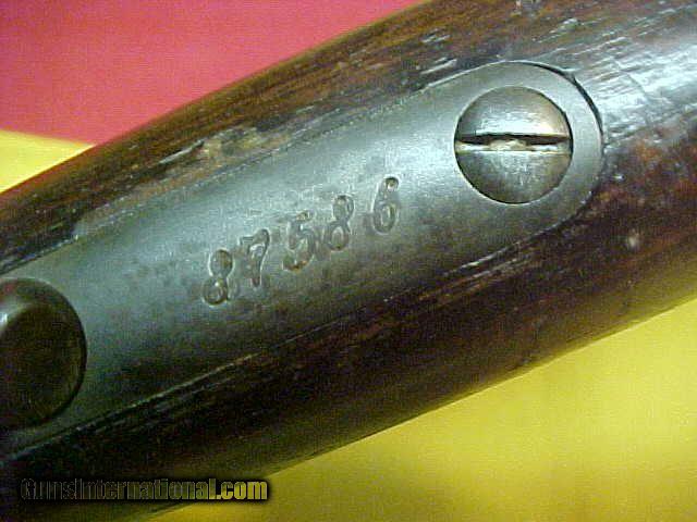 Description: #4910 Winchester 1873-SRC (Saddle Ring Carbine), 3rd Variation, 87XXX(1882 mfgr), 44WCF with VG bore (for one of these hard-used carbines, about a “6” on a scale of 10) and smooth tight action. Carbine sights with the elevated ladder rear barrel sight being the scarce reversed ladder style, original dust cover. Overall a grey-brown patina with some minor crustiness build up, most being between the barrel and magazine but does not appear to be heavily pitted anywhere, and should clean better, if desired. Very decent wood, just some usual gouges and dents from 135+ years of use and a strong barrel address. It is getting very difficult to find almost ANY ‘73 Winchester carbine in any usable condition these days and this one is a decent original specimen. VG $2450 SOLD Antique: Yes |