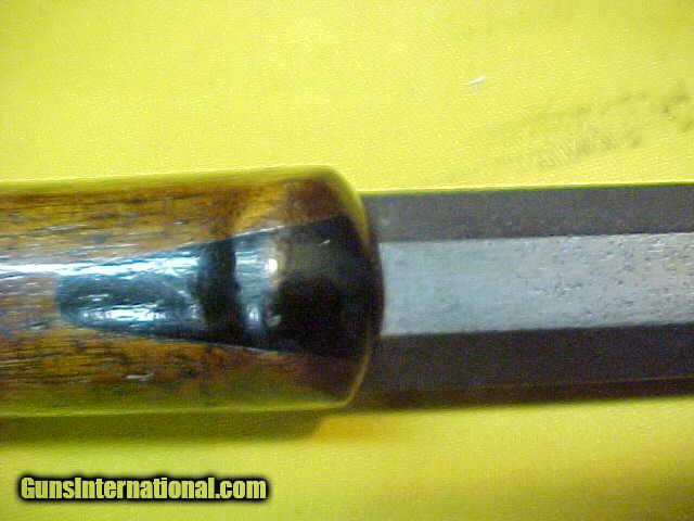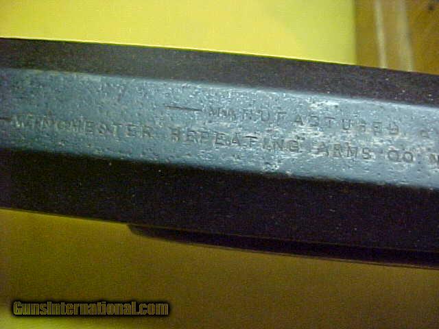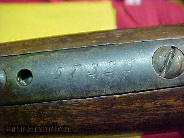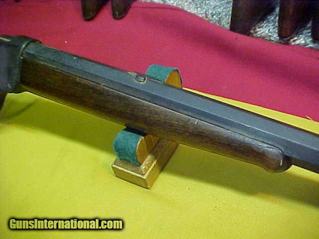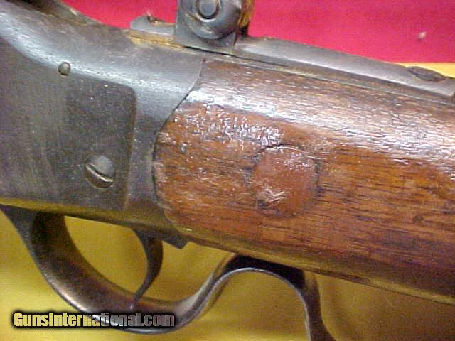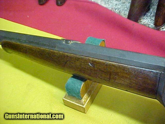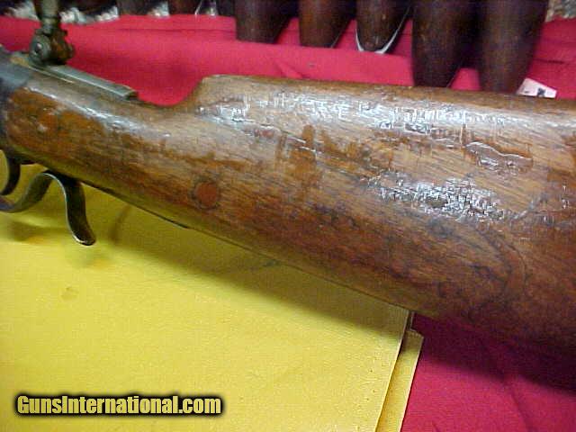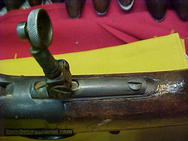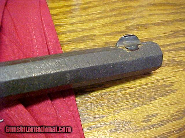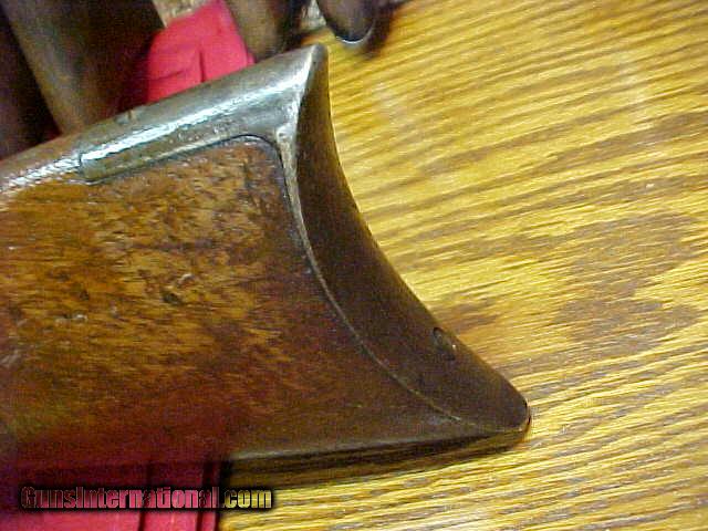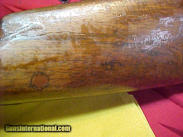 Description: #4931 Winchester 1885 Hi-Wall, serial range 57xxx (1892), No.3x28”x32/40 with about a “6+ to 7” bore on a scale of 10 and a smooth tight action, and having a post style tang peep sight and factory barrel plug. What this gun lacks most is exterior condition. Basically it looks to be an old ranch gun that was not carefully handled and cared for like a target rifle (which most 32/40 Hi-Walls seemed to have been used for). This looks like a gun that was just stuck out in the woodshed and grabbed on the way out to shoot a deer for next weeks meal ..and then placed back in the woodshed without wiping down the exterior, but simply pushing a patch through the bore. The buttstock has a plug repair to a large split, and while it isn’t all THAT bad of a repair, it could be made much better with a better refinish; the forearm is VG. It has overall light pitting on the barrel, being heavier toward the muzzle, and a crustiness to the patina that has mixed with what looks to be a VERY old reblue. Still looks like it has some good years left as a shooter, but as a collector piece, it will certainly need some cosmetic upgrading. About Good/VG $1295 SOLD Antique: Yes |