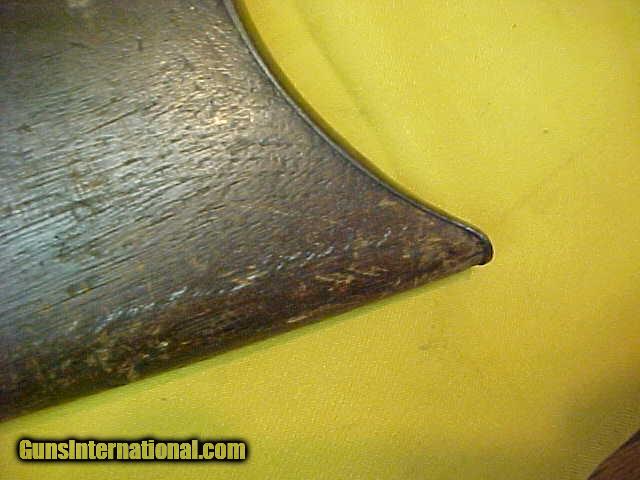 Description: #4937 Winchester 1886 OBFMCB 45/70, 36XXX range (1889), Ex.Fine-Excellent bore and action (about a 9+ on a scale of 10) with no bad spots except for having some light black powder residue in the grooves. Decent wood with no nasty slivers or serious dings but does have scuffing and minor dings mainly on the buttstock, much of which should steam out and clean up quite a bit with some time and effort, otherwise having a fine tight fit to the metal. VG crisp-edged metal and just a thin mottled grey-grown patina on the frame and 95% coverage of a 95% density blue on the barrel with the magazine being about 95% coverage and 70% density. Open front sight and low semi-buckhorn rear. This handsome old Winchester looks to have had VERY decent care in its 127 years of life and is WELL above the “average” 1886 that can be found in all but the better high-end gun shows. A nice gun with a great bore in a very popular caliber. Okay….so much for the “used car salesmans hype”. In MY opinion, this really nice looking gun has either had some really well done cosmetic upgrading by fogging on barrel and mag blue, or the barrel might have even been replaced by a better one. There just seems (to me) to have way TOO much barrel and mag finish when compared to the browned out frame case color and minor pitting on the forearm nose cap. Therefore, one should probably value this rifle MAINLY for its shooting possibilities and antique nostalga value and apply less importance to the high-end collector value. Still, all-in-all it is a NICE rifle. $3250 SOLD Antique: Yes |