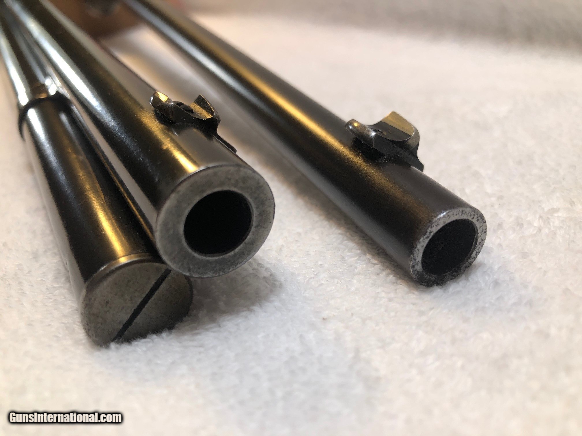 Description: MOD 1894 Pencil Barrel in 38-55 - early gun with front sight still doved tail into the barrel. Excellent bore. Nice wood that retains all it's original varnish. Metal shows good blue, but toning ,clean screws, tight wood to metal fit and tight action. This is a great configuation in a very desirable caliber with cody letter - Antique - No FFL required. Very cool piece!!! Buy um' when you can find them !!! SOLD Antique: Yes |