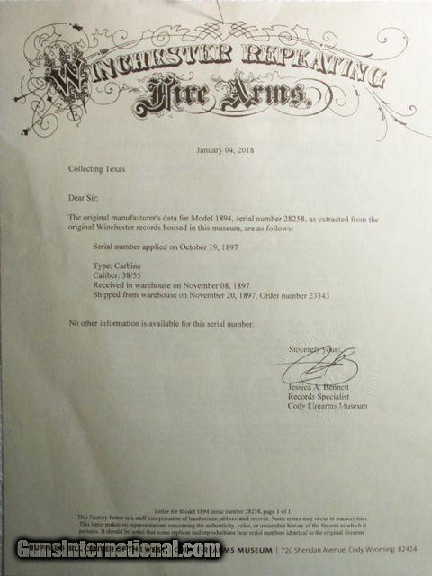 Description: Winchester Model 1894; SN. 28258; Made in 1895 & shipped in 1897; 38/55 Standard Saddle Ring Carbine; 20” Barrel; Western used condition with some Original Blue & some Original Varnish; some exterior pitting; Original Sights; Good screws; Perfect Action; fairly strong bore with some pitting; Good Original Condition 123 Year Old Winchester Carbine; antique, no FFL/C&R required for shipping; from my own personal collection; Long guns shipped by FedEx in a hard case $65; all other items shipped fully insured Priority Mail; - -Hand guns $30 -- Spurs $30-- Knives, Swords & Sabers $30—Grips $20; return policy: three days inspection from the date the item is received; full refund of shipping both ways ONLY IF THE ITEM IS MISREPRESENTED. SOLD Antique: Yes Manufacturer: Winchester Model: 1894 Serial Number: 28258 |