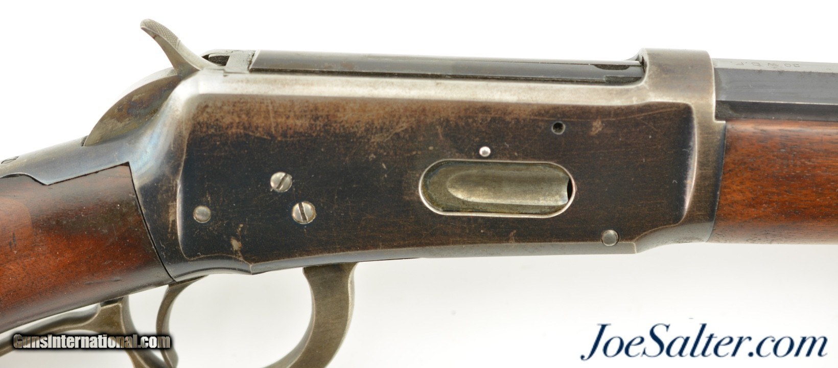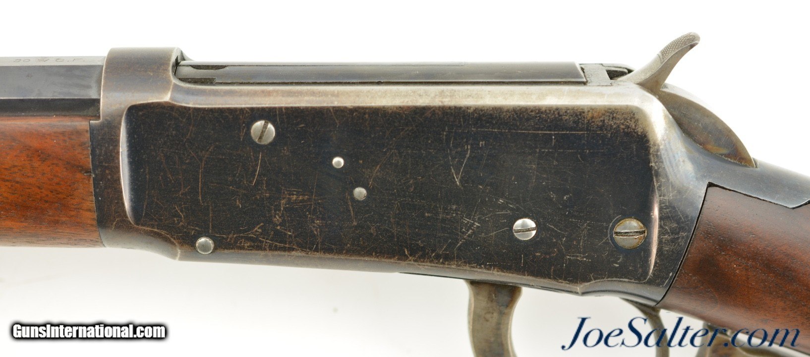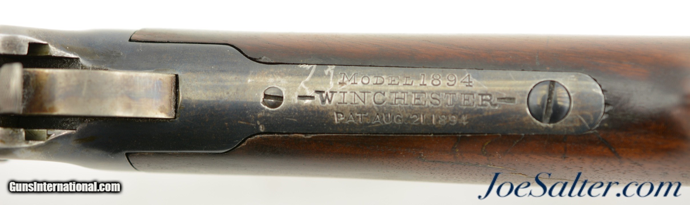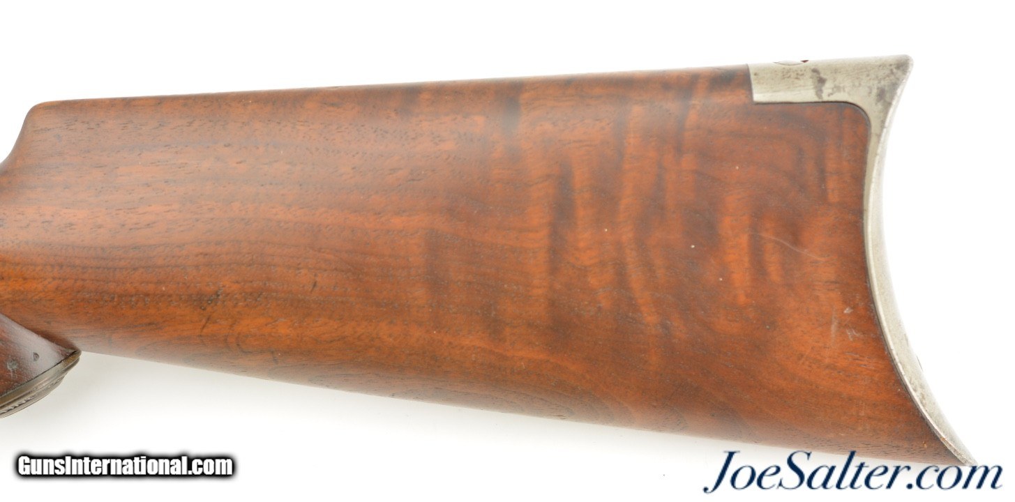 Description: Serial #32518, .30 WCF (.30-30), 26" octagon barrel with a very good bore that has some dark freckling within the grooves. This is a handsome rifle, made in 1897, that has retained 90-92% of the original blue along the barrel and magazine tube, and about 75-80% original blue on the frame. There is some silvering at the muzzle, along the edges of the barrel facets, and some minor scratches along the exposed portion of the underside of the magazine as well. The edges of the frame have faded to gray, with a sprinkling of plum-brown freckling on either side. Most of the original color case-hardening is still visible on the hammer, while the lever has muted color case-hardening and a pewter gray patina on the balance. The walnut forend has some attractive feathering in the grain towards the nosecap on the right side, with a few surface scratches and blemishes opposite, and some further minor handling marks scattered about. The plain pistol-grip buttstock has been professionally repaired at the wrist at some point. The repair is very very solid. The stock has minor handling marks scattered throughout, with some further attractive grain feathering at the heel of the butt on both sides. The rifle is accompanied by a 2016-dated Cody data sheet that confirms the rifle’s configuration, lists a serial application date of December 20, 1897, with a shipping date of April 23, 1898. This is a great-looking, well-preserved 1894 rifle, and is in very good-near fine condition overall. Antique; SOLD Antique: Yes |
