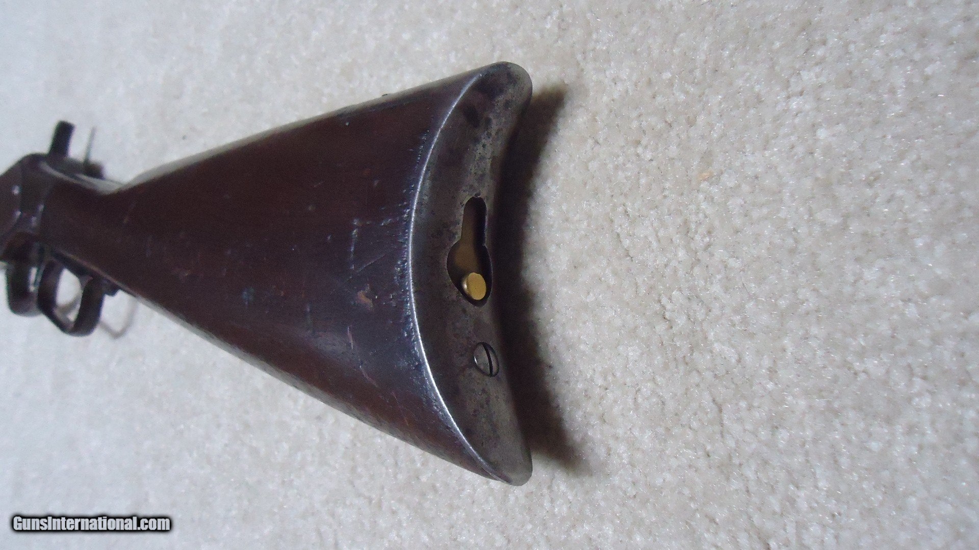 Description: EARLY 1873 3RD MODEL ROUND BARREL RIFLE, .44-40 CALIBER WITH SPECIAL ORDER SET TRIGGER, #128XXX, MADE 1883. Nice frontier era example that came out of here in Montana. Mostly an uncleaned gray/brown receiver, barrel and magazine with some blue in protected areas. Dust cover intact and fitted with a Rocky Mountain blade front sight with folding leaf rear sight (middle leaf broken). Excellent markings on barrel and upper tang. Correctly NOT caliber marked as the Model 1873 was only caliber marked after the .38-40 and later .32-20 calibers were introduced after this one was made. Generally excellent stock and forend with only some minor handling marks and very tight wood to metal fit. Butt plate has the correct brass sliding trap door for cleaning rods- none come with this rifle. Tight action and half cock notch holds well. The set trigger functions correctly and retains the small adjustment screw. Bore is surprisingly good for such an early black powder rifle that shows fine rifling all the way through, but is a little dark and lightly frosted, but not heavily pitted or damaged in any way- much better than usually encountered on 1883 vintage 1873s. 139 year old 1873 with nice, un-messed with appearance. SOLD Antique: Yes Rifle Caliber: .44-40 Winchester Manufacturer: WINCHESTER Model: 1873 RIFLE Serial Number: 128XXX Barrel Length: 24 Condition: VG |