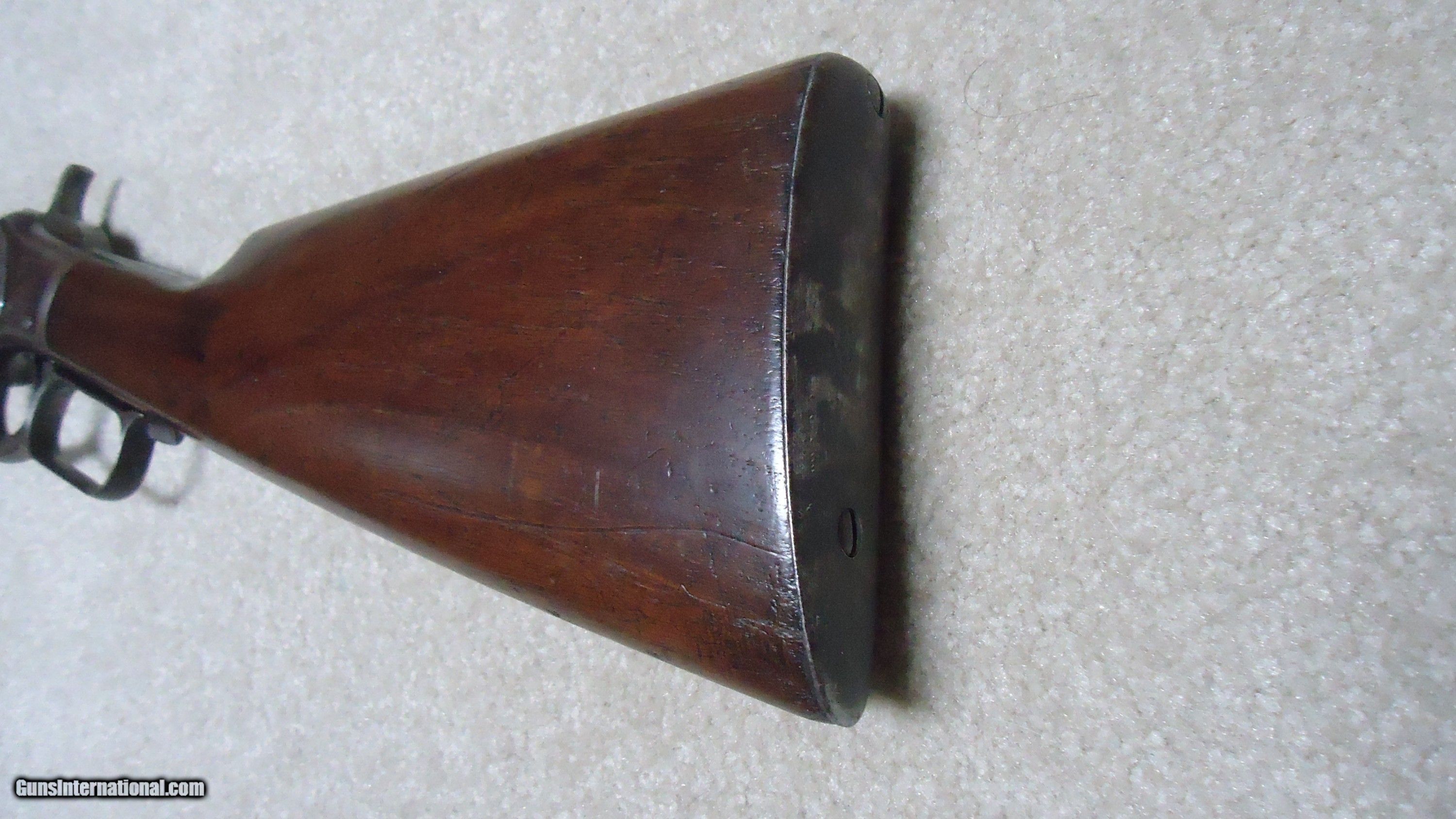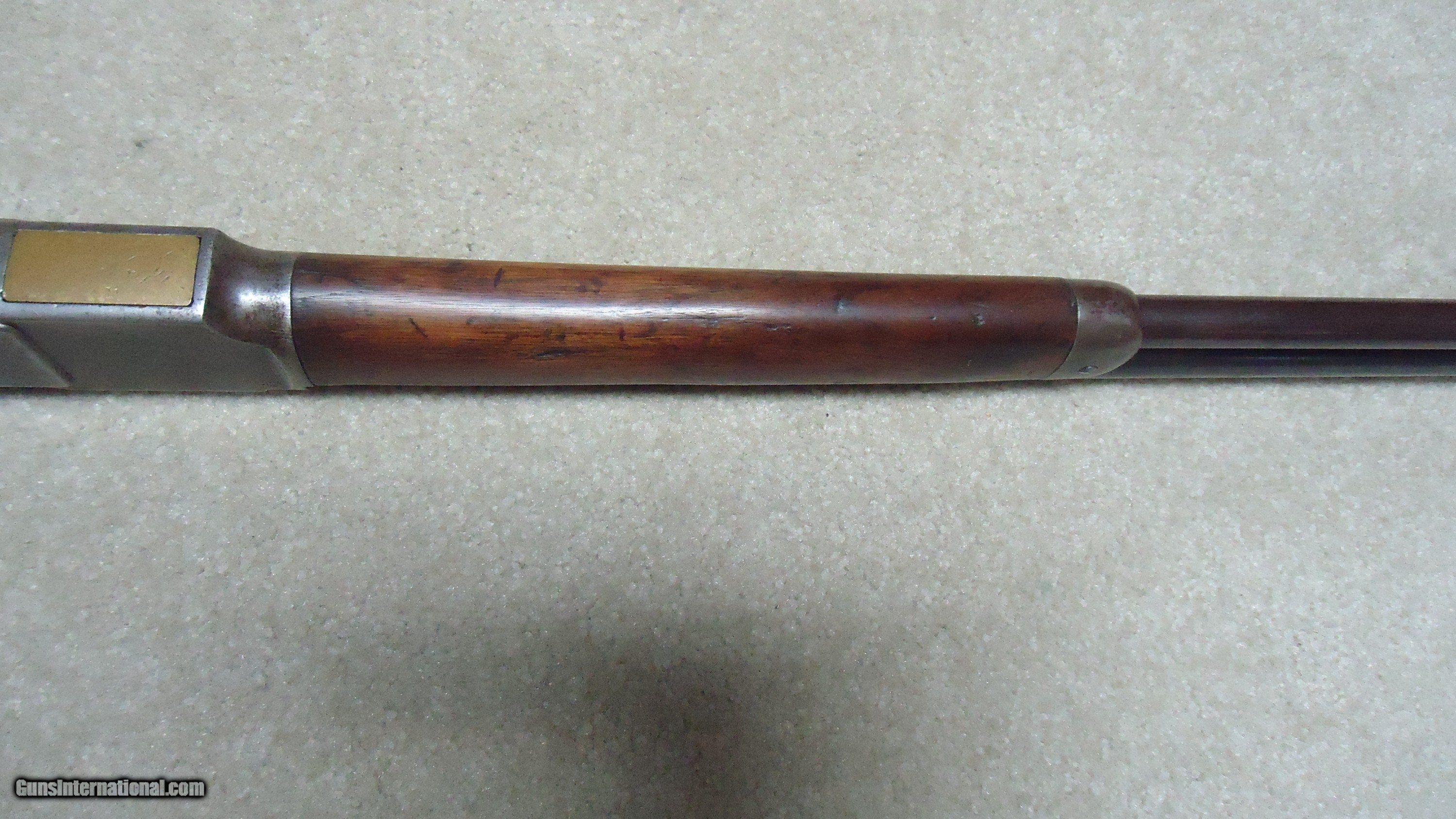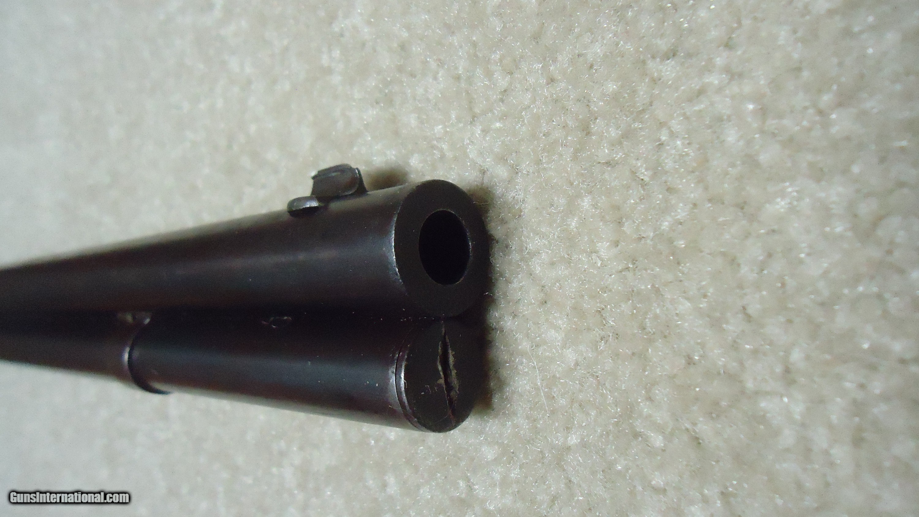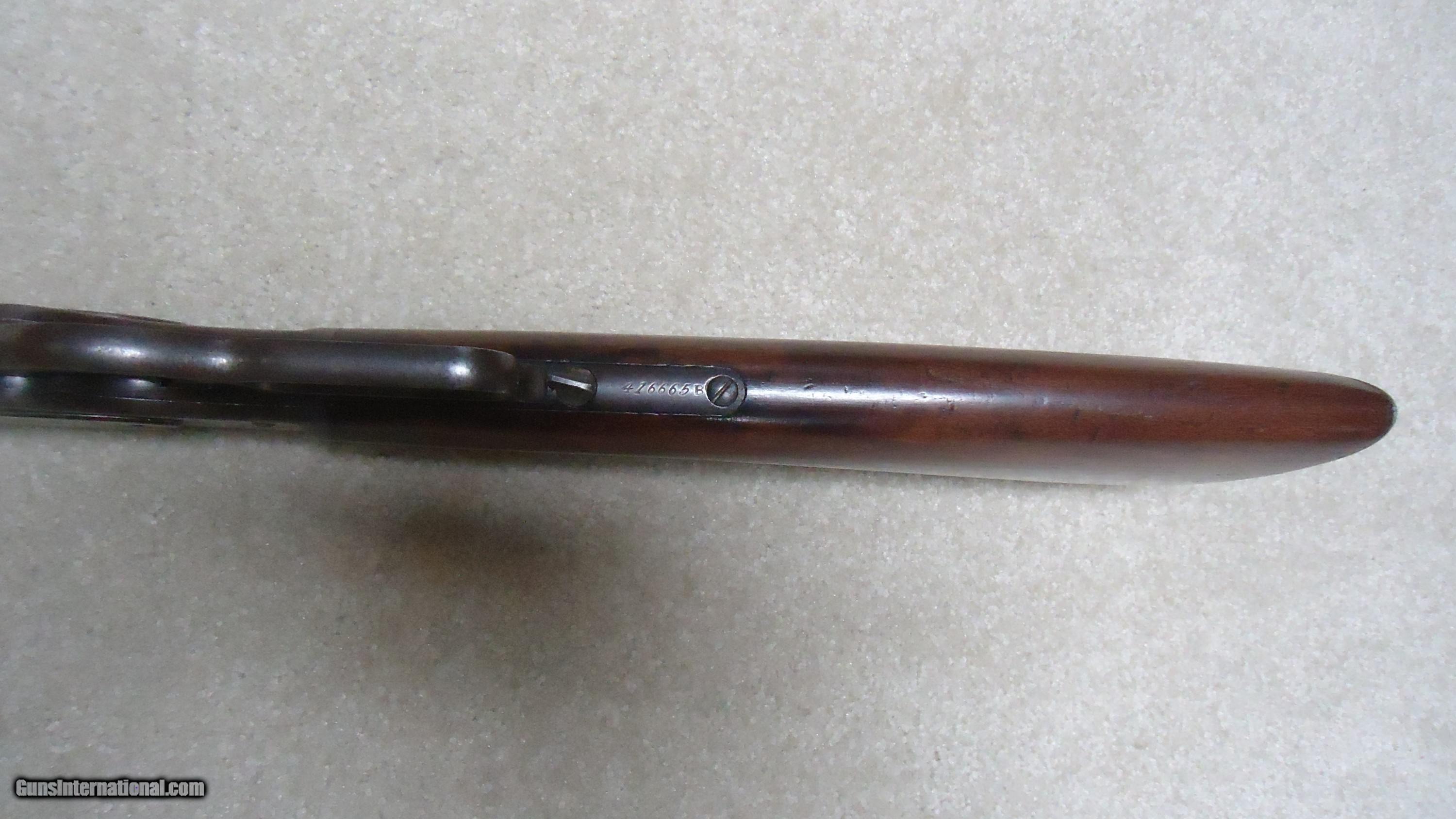 Description: UNUSUAL AND EXTREMELY RARE 1873 SPECIAL ORDER .38-40 22" SHORT RIFLE, SHOTGUN BUTT, SPECIAL SIGHT, LETTER, #416XXX, SHIPPED 1892. All 1873 short rifles are scarce, but almost all I've seen have been 20." The factory info on this one states it has a 22" round barrel, Winchester Express Sight and Shotgun Butt. Interestingly, it is British Proofed which only adds to the intrigue and history of this one- might have gone to India or Australia or simply stayed in England/Scotland. Nice uncleaned and unmessed with condition with aged blue/brown receiver with good blue in the protected areas and loading gate, fine screw heads, original dust cover, mellow brass lifter, fine aged/dulled barrel and mag blue, correct 1" shorter than standard forend, generally fine+ stock and forend showing only normal light handling and tight wood to metal fit, smooth steel shotgun butt plate, original (mentioned in letteer!) three leaf express sight with all leaves intact and small blade with ivory bead front sight. Fine+ bore with good rifling all the way through and only a little dark with any roughness very surface and minor. Really nice appearance and super rare. SOLD Antique: Yes Rifle Caliber: .38-40 Winchester Manufacturer: WINCHESTER Model: 1873 SHORT RIFLE Serial Number: 416XXX Barrel Length: 22 Condition: FINE Bore Condition: FINE |