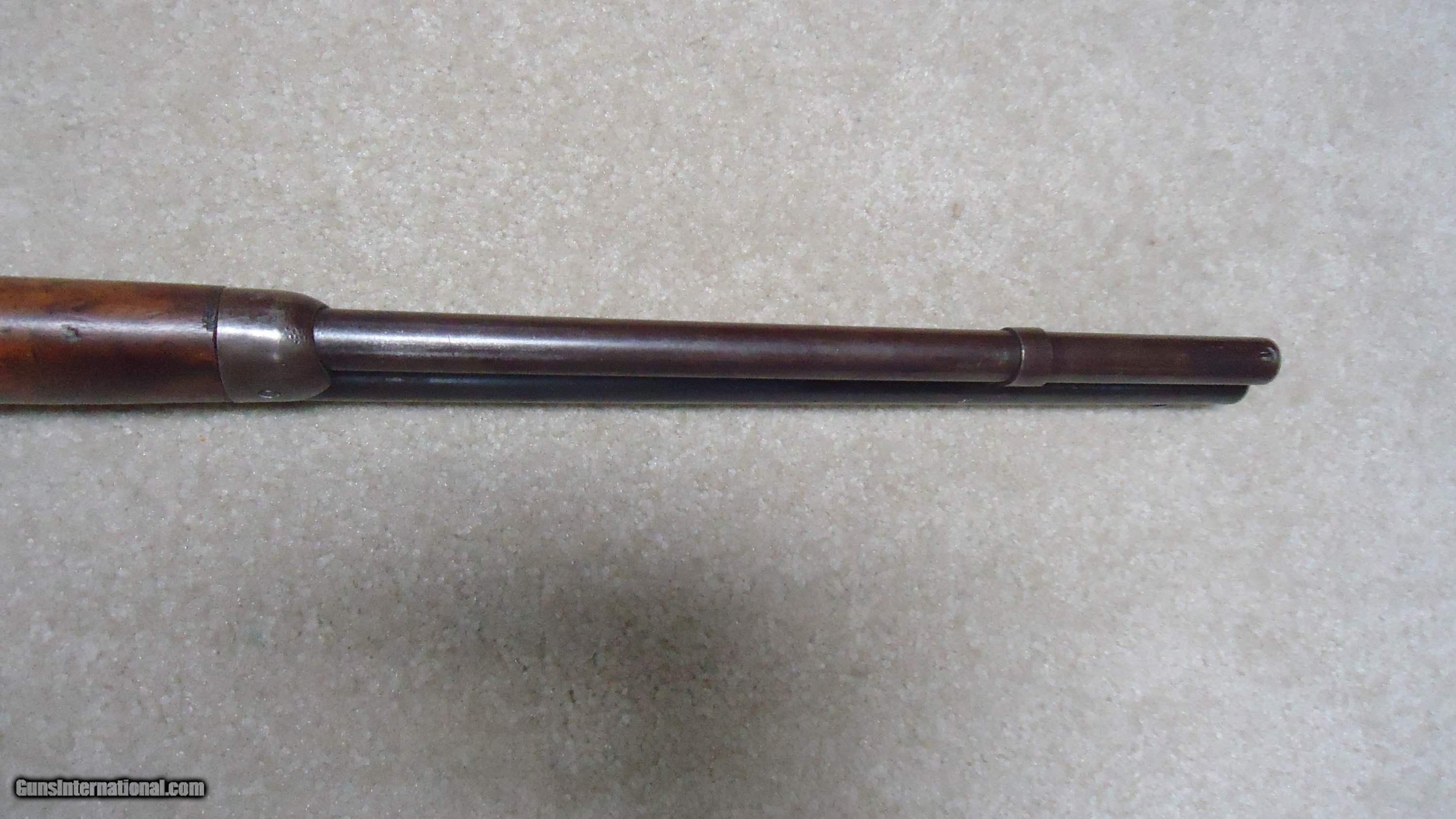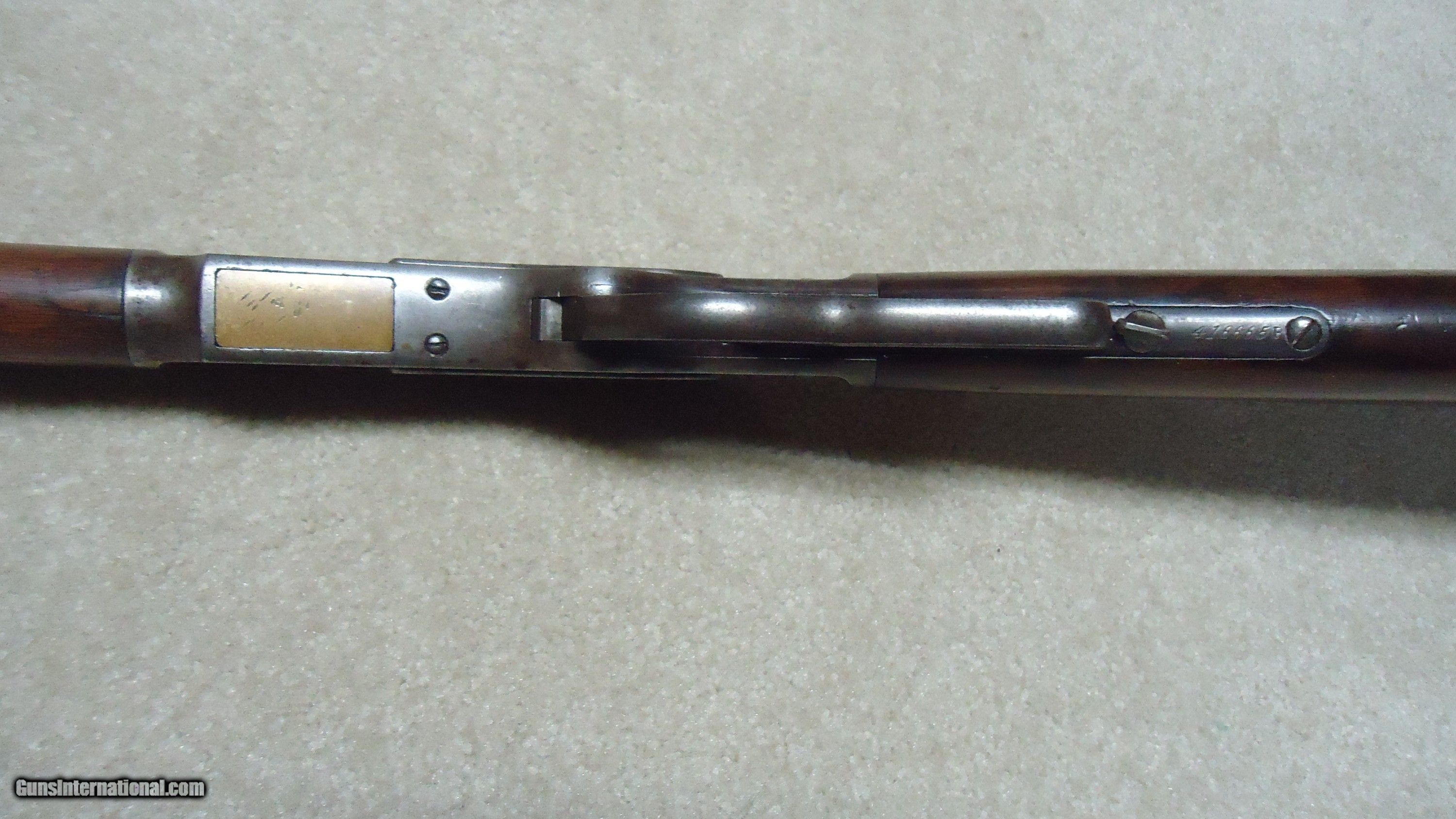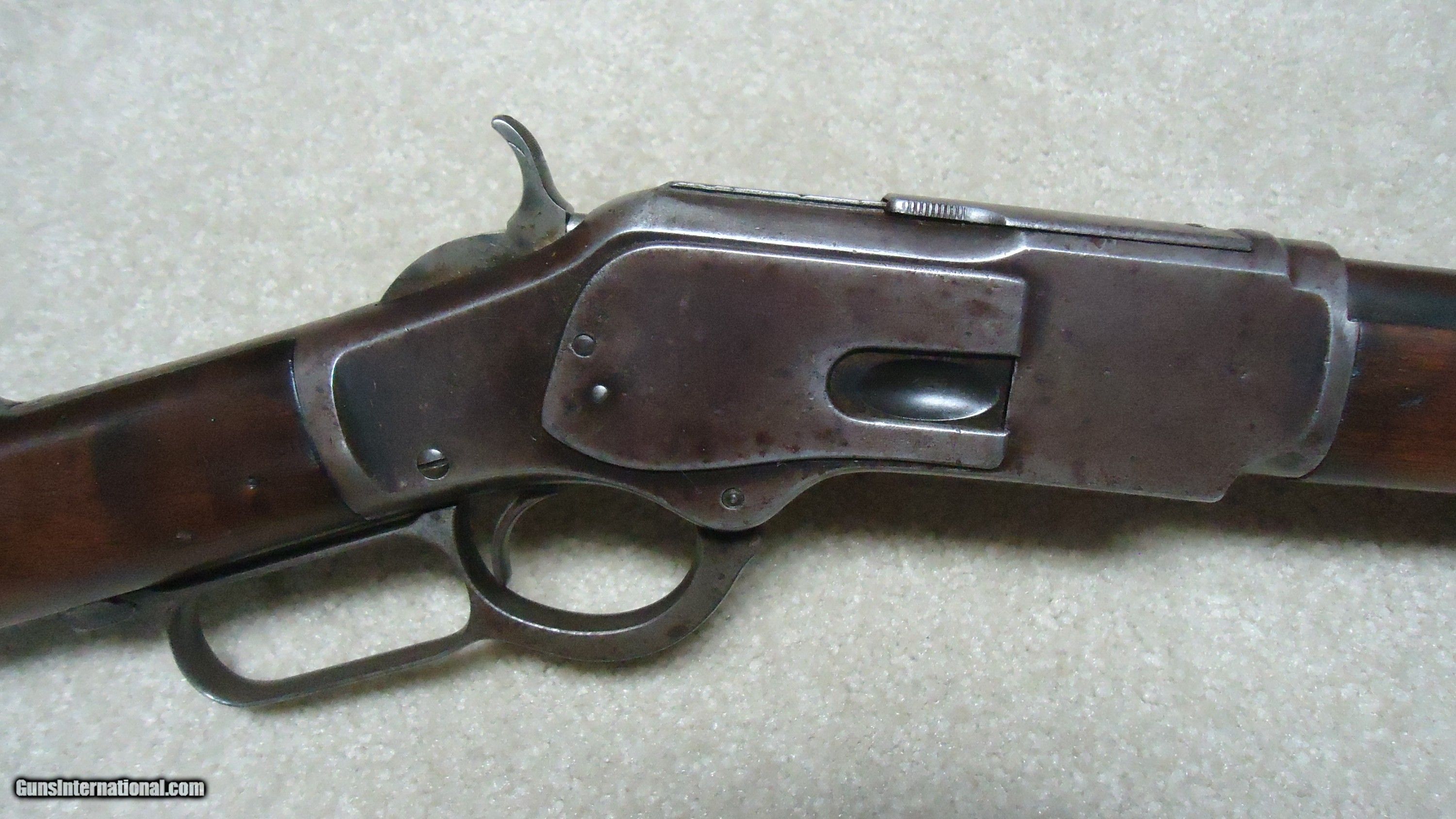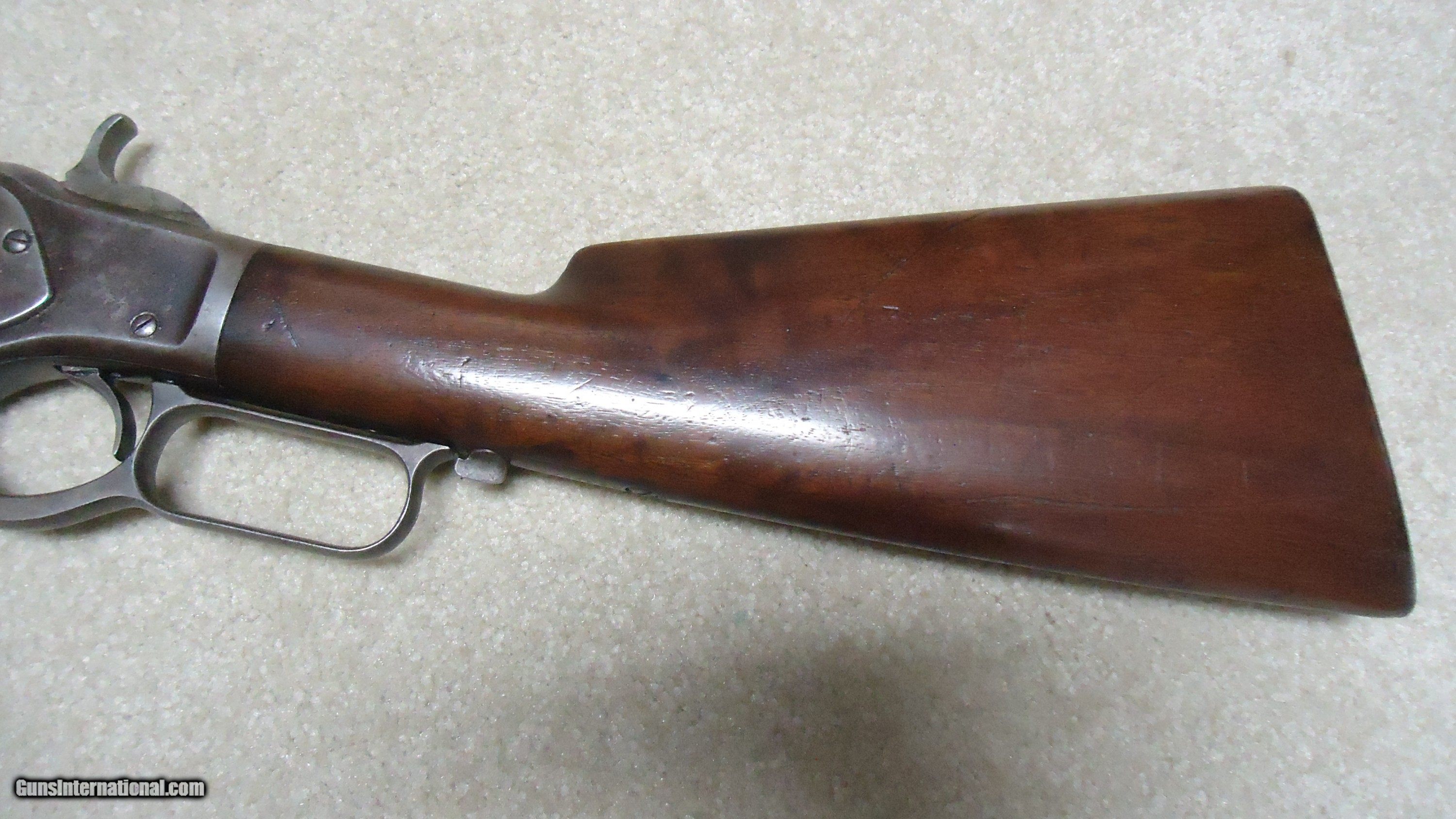 Description: UNUSUAL AND EXTREMELY RARE 1873 SPECIAL ORDER .38-40 22" SHORT RIFLE, SHOTGUN BUTT, SPECIAL SIGHT, LETTER, #416XXX, SHIPPED 1892. All 1873 short rifles are scarce, but almost all I've seen have been 20." The factory info on this one states it has a 22" round barrel, Winchester Express Sight and Shotgun Butt. Interestingly, it is British Proofed which only adds to the intrigue and history of this one- might have gone to India or Australia or simply stayed in England/Scotland. Nice uncleaned and unmessed with condition with aged blue/brown receiver with good blue in the protected areas and loading gate, fine screw heads, original dust cover, mellow brass lifter, fine aged/dulled barrel and mag blue, correct 1" shorter than standard forend, generally fine+ stock and forend showing only normal light handling and tight wood to metal fit, smooth steel shotgun butt plate, original (mentioned in letteer!) three leaf express sight with all leaves intact and small blade with ivory bead front sight. Fine+ bore with good rifling all the way through and only a little dark with any roughness very surface and minor. Really nice appearance and super rare. SOLD Antique: Yes Rifle Caliber: .38-40 Winchester Manufacturer: WINCHESTER Model: 1873 SHORT RIFLE Serial Number: 416XXX Barrel Length: 22 Condition: FINE Bore Condition: FINE |