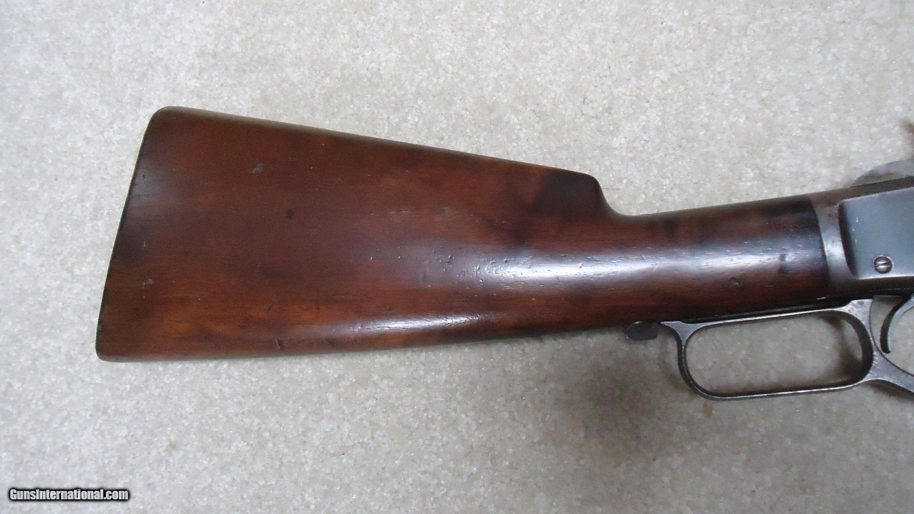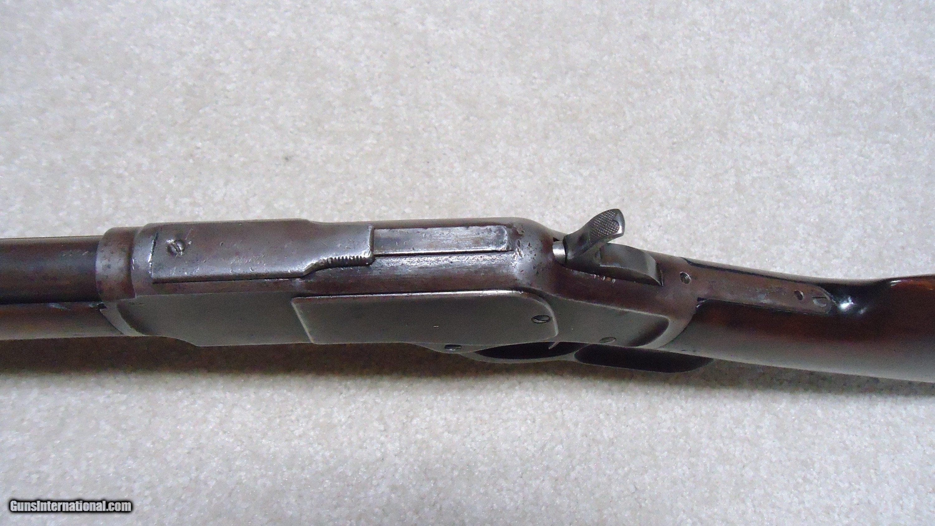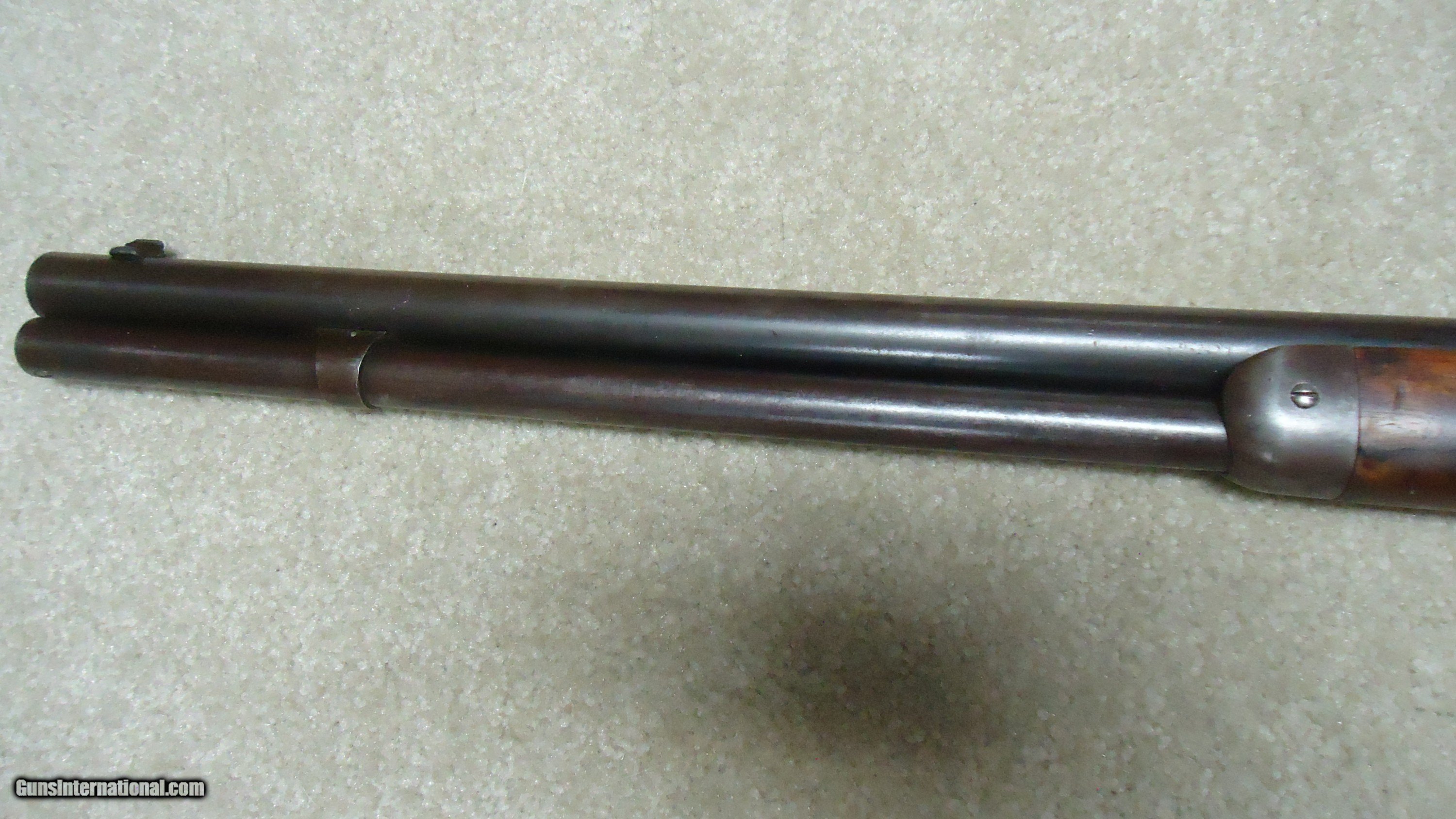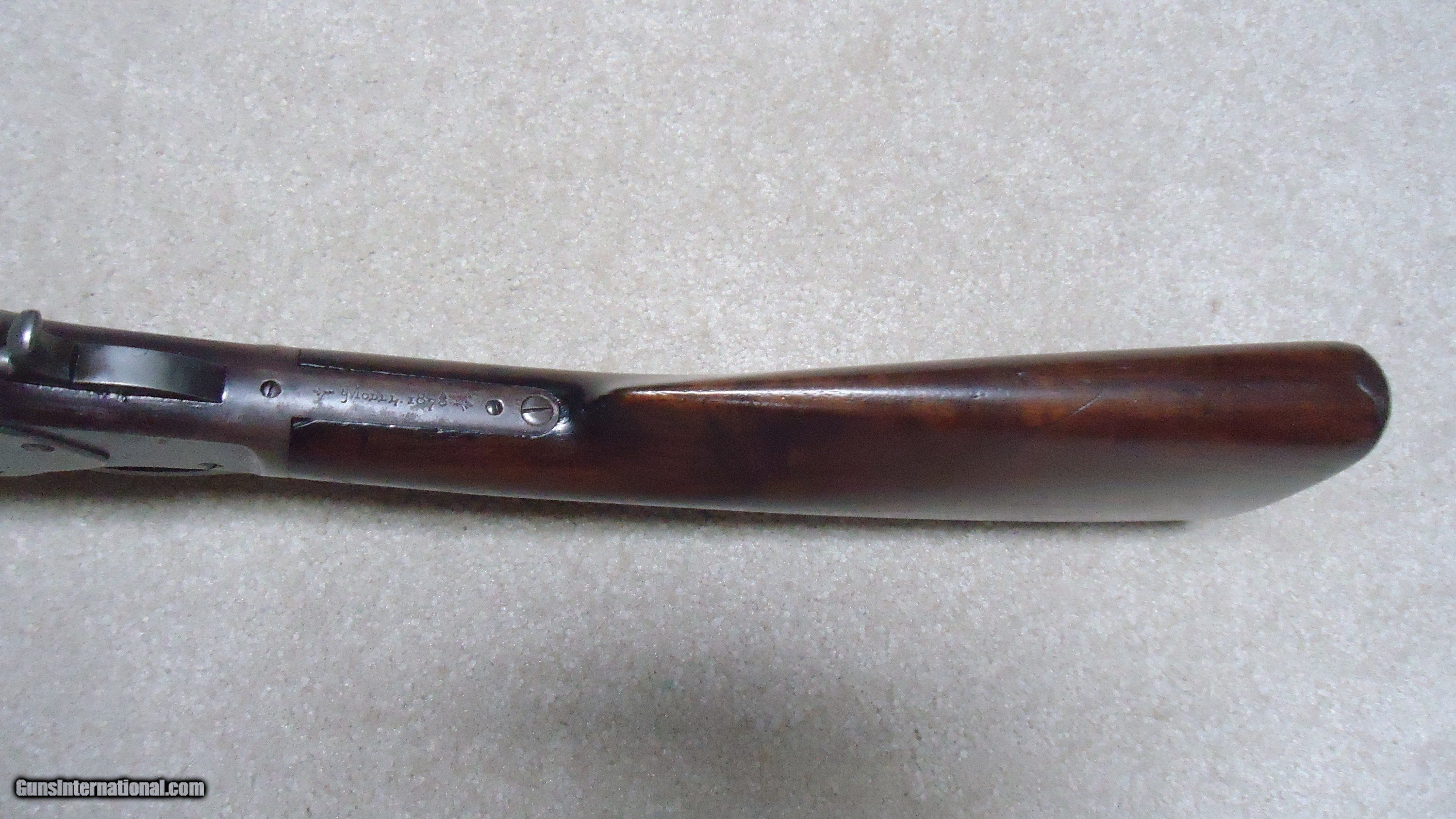 Description: UNUSUAL AND EXTREMELY RARE 1873 SPECIAL ORDER .38-40 22" SHORT RIFLE, SHOTGUN BUTT, SPECIAL SIGHT, LETTER, #416XXX, SHIPPED 1892. All 1873 short rifles are scarce, but almost all I've seen have been 20." The factory info on this one states it has a 22" round barrel, Winchester Express Sight and Shotgun Butt. Interestingly, it is British Proofed which only adds to the intrigue and history of this one- might have gone to India or Australia or simply stayed in England/Scotland. Nice uncleaned and unmessed with condition with aged blue/brown receiver with good blue in the protected areas and loading gate, fine screw heads, original dust cover, mellow brass lifter, fine aged/dulled barrel and mag blue, correct 1" shorter than standard forend, generally fine+ stock and forend showing only normal light handling and tight wood to metal fit, smooth steel shotgun butt plate, original (mentioned in letteer!) three leaf express sight with all leaves intact and small blade with ivory bead front sight. Fine+ bore with good rifling all the way through and only a little dark with any roughness very surface and minor. Really nice appearance and super rare. SOLD Antique: Yes Rifle Caliber: .38-40 Winchester Manufacturer: WINCHESTER Model: 1873 SHORT RIFLE Serial Number: 416XXX Barrel Length: 22 Condition: FINE Bore Condition: FINE |