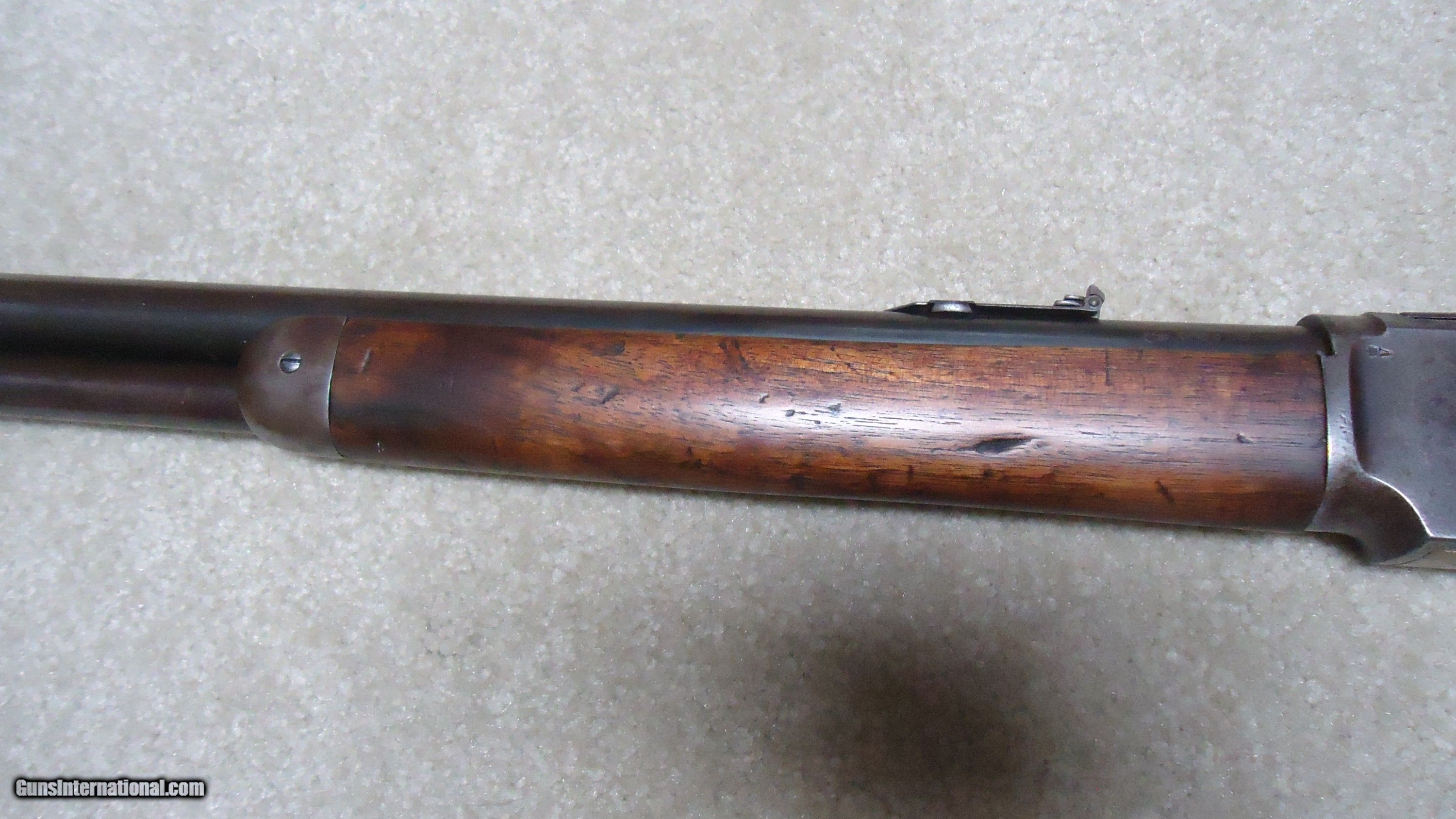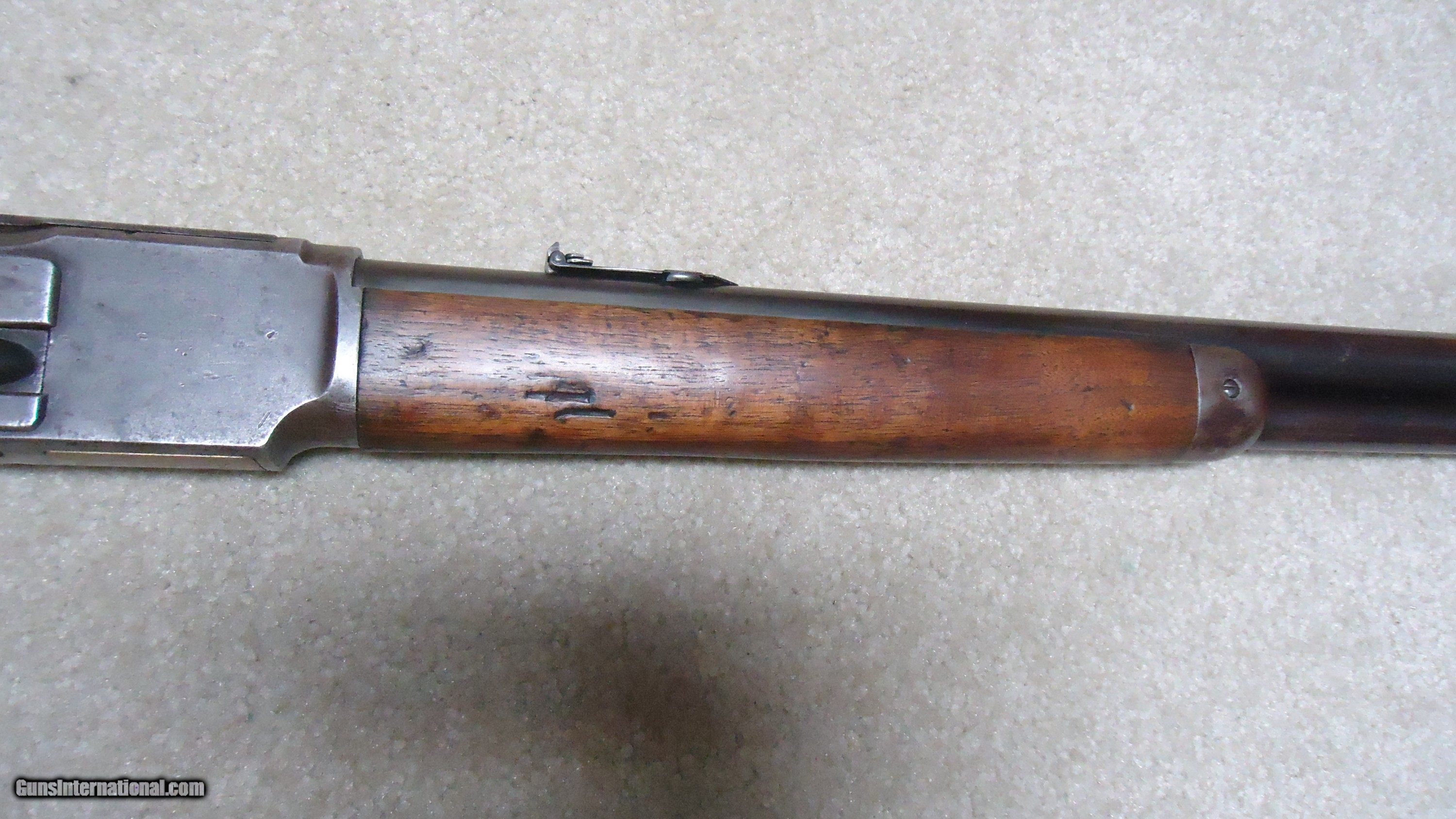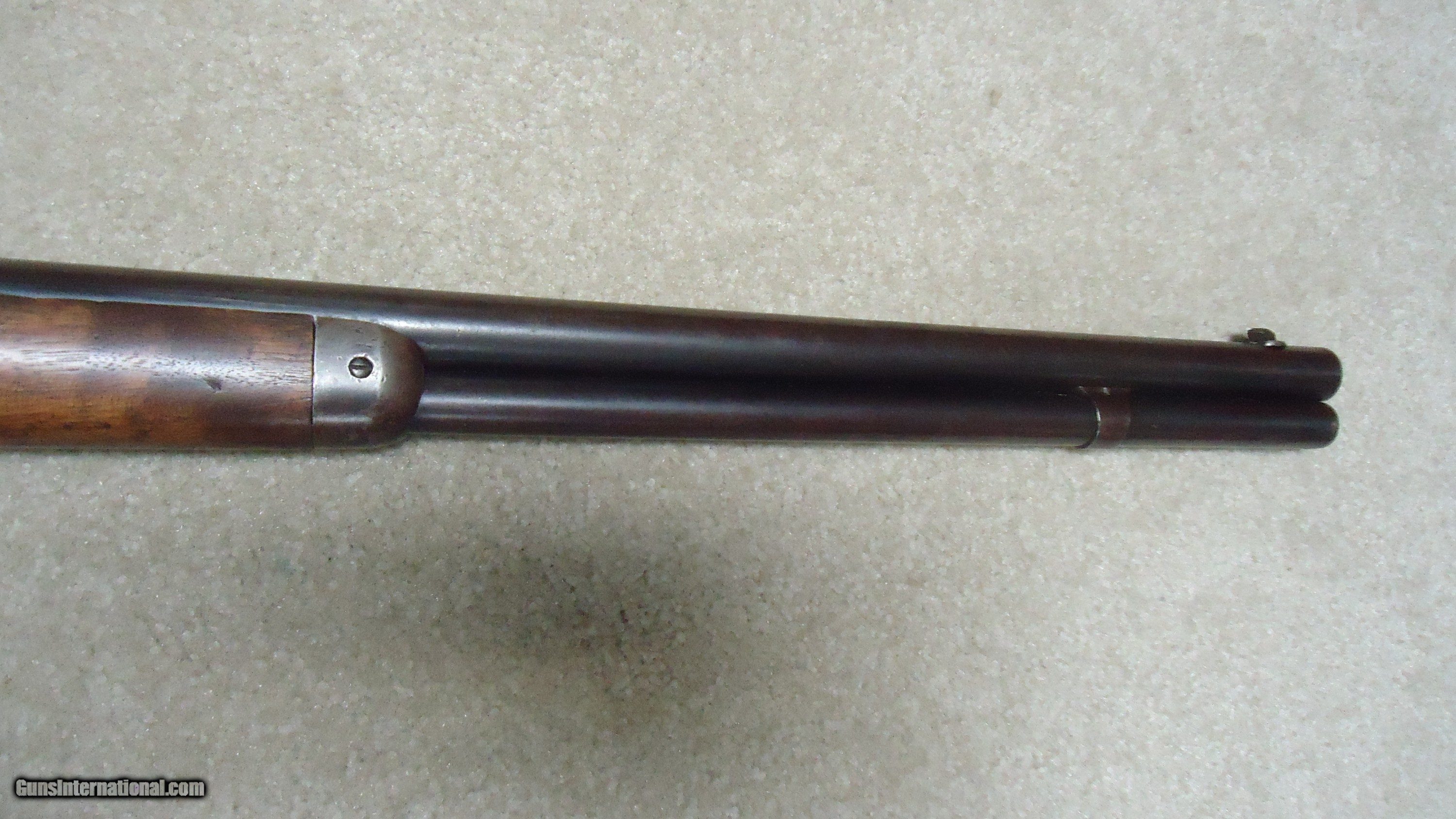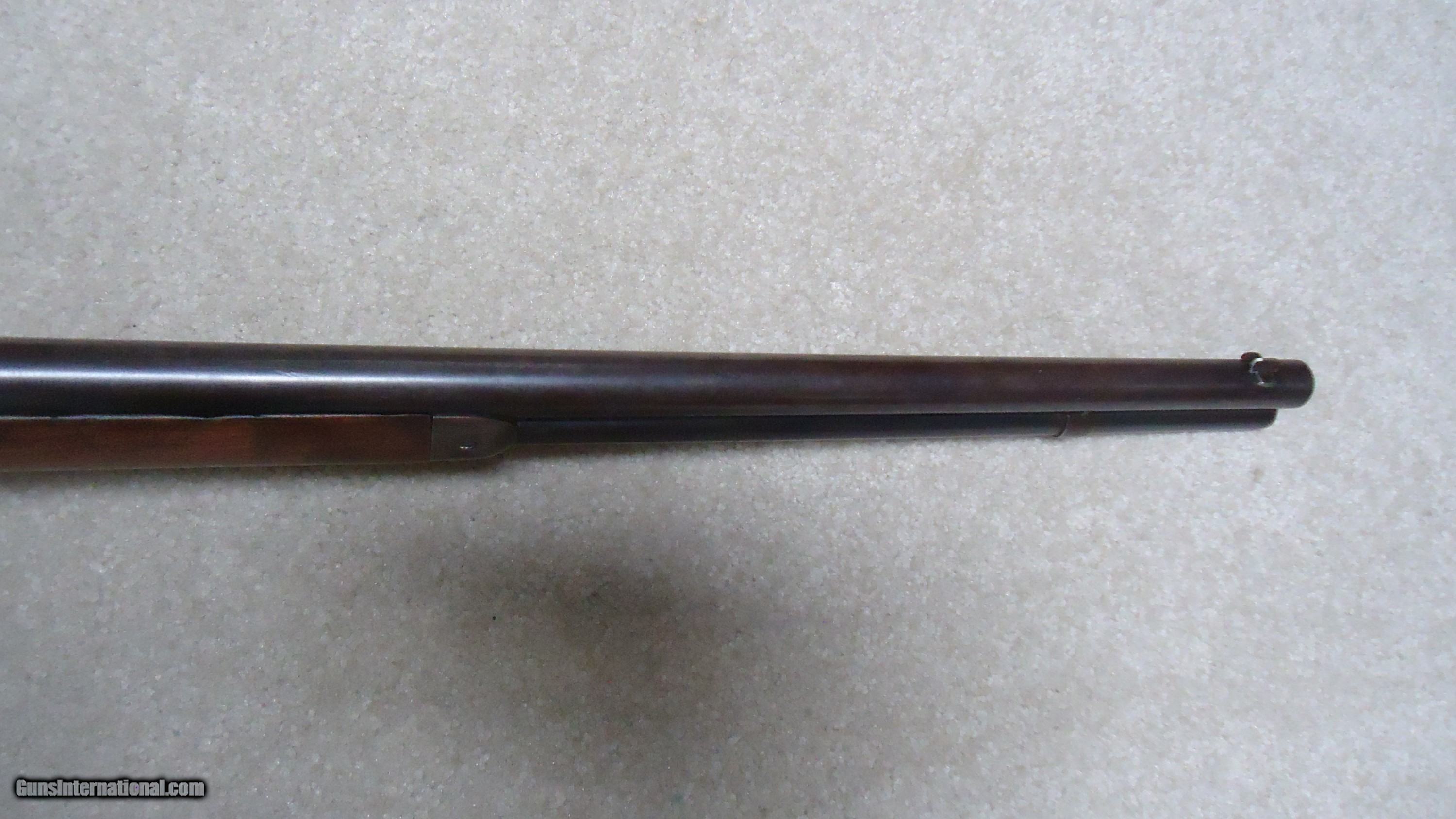 Description: UNUSUAL AND EXTREMELY RARE 1873 SPECIAL ORDER .38-40 22" SHORT RIFLE, SHOTGUN BUTT, SPECIAL SIGHT, LETTER, #416XXX, SHIPPED 1892. All 1873 short rifles are scarce, but almost all I've seen have been 20." The factory info on this one states it has a 22" round barrel, Winchester Express Sight and Shotgun Butt. Interestingly, it is British Proofed which only adds to the intrigue and history of this one- might have gone to India or Australia or simply stayed in England/Scotland. Nice uncleaned and unmessed with condition with aged blue/brown receiver with good blue in the protected areas and loading gate, fine screw heads, original dust cover, mellow brass lifter, fine aged/dulled barrel and mag blue, correct 1" shorter than standard forend, generally fine+ stock and forend showing only normal light handling and tight wood to metal fit, smooth steel shotgun butt plate, original (mentioned in letteer!) three leaf express sight with all leaves intact and small blade with ivory bead front sight. Fine+ bore with good rifling all the way through and only a little dark with any roughness very surface and minor. Really nice appearance and super rare. SOLD Antique: Yes Rifle Caliber: .38-40 Winchester Manufacturer: WINCHESTER Model: 1873 SHORT RIFLE Serial Number: 416XXX Barrel Length: 22 Condition: FINE Bore Condition: FINE |