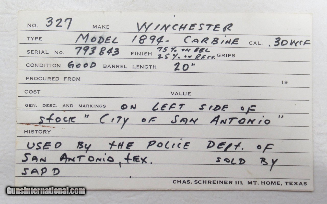 EXTREMELY RARE ORIGINAL DOCUMENTED SAN ANTONIO POLICE DEPT. ISSUED WINCHESTER MODEL 1894 SADDLE RING CARBINE from COLLECTING TEXAS