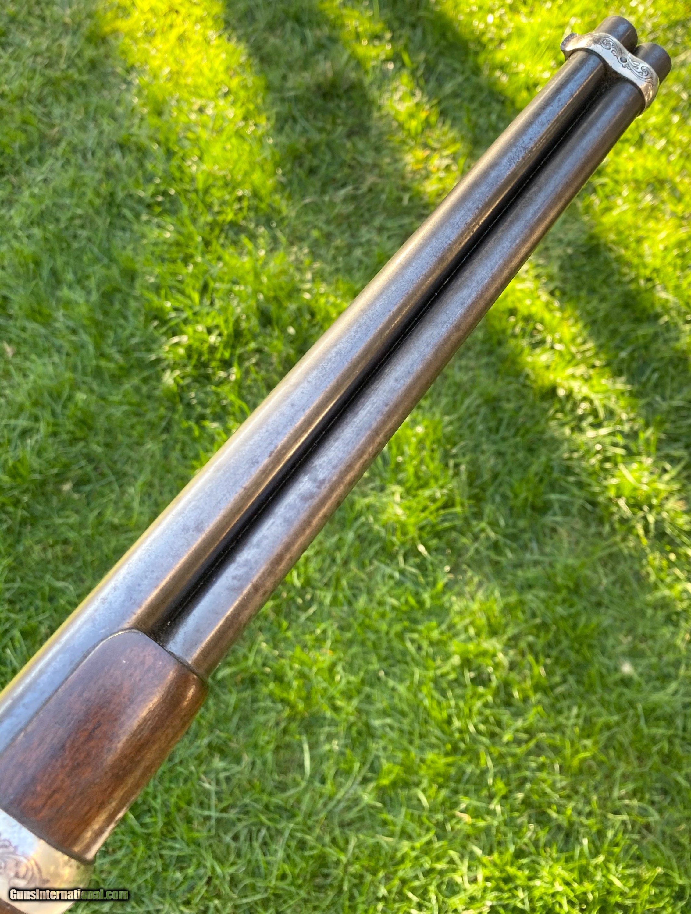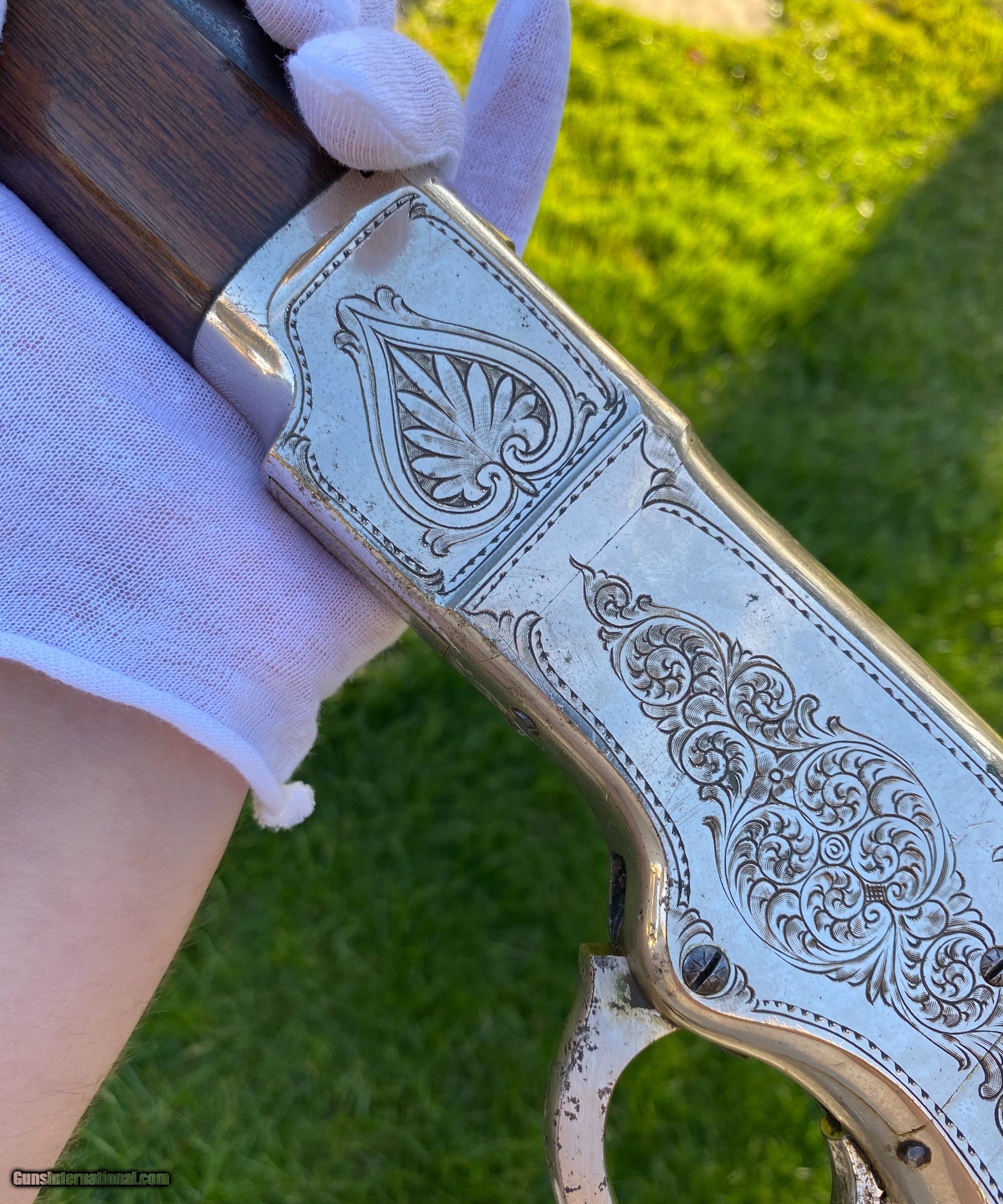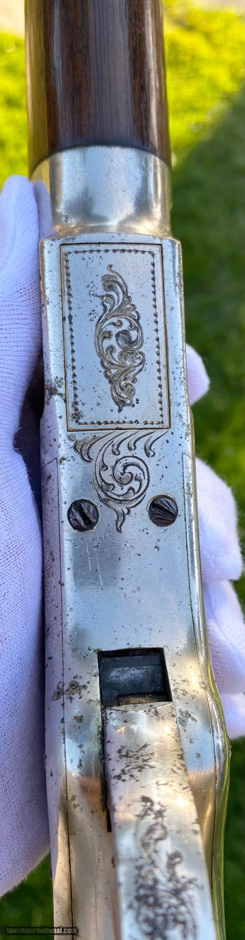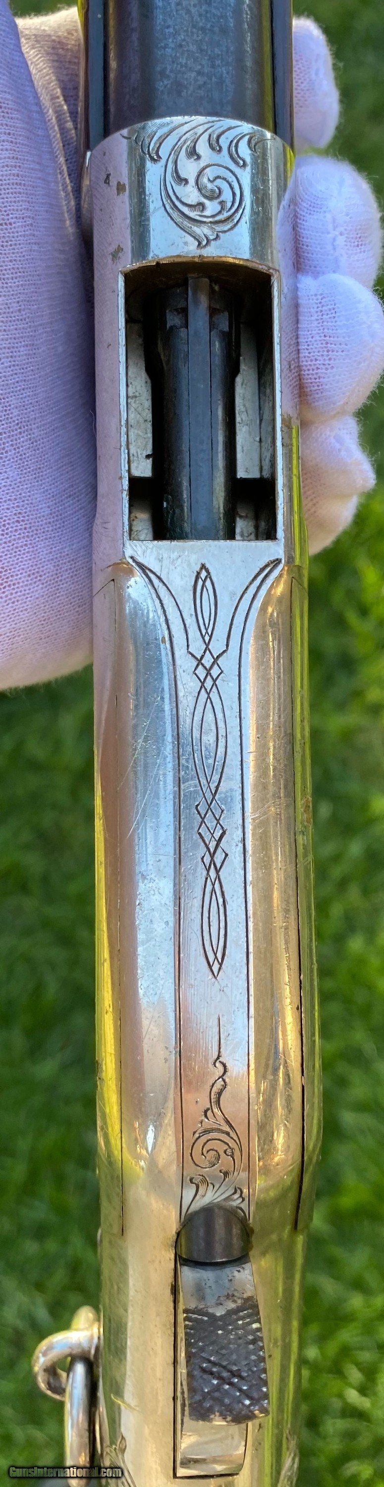 Description: This Winchester 1866 carbine was manufactured in 1870 and subsequently retailer period engraved and nickel plated on all parts except for the barrel and magazine tube. The engraving patterns are similar to "Unique Trio of Winchester 1866 Carbines" (47830, 48505, and 49157) on pages 315-320 in "Armsand Armor Annual Volume One" by Robert Held. Those carbines were also manufactured in 1870 and were purchased in Santiago, Chile, nearly a century later in 1968 and were originally in two-tier case with a St. Lousi retailer label. Held notes that all three were done by different hands but around the same time. This carbine was also clearly from a different hand. The sides of the receiver featured floral scroll and floral patterns with scallop bordering, there are simple scroll and line designs on top of the receiver and wedges of floral scroll on the upper and lower tang, underside of the receiver, on the bottom of the cartridge elevator, buttplate tang and on each side of the barrel bands. The top of the barrel ahead of the rear sight is marked with the two line address/patent dates and the serial number is on the lower tang. This carbine is in exceptional condition with around 95% original retailer applied nickel finish on the frame. The barrel and magazine tube retain nearly 40% original blue drifting. The original 3 piece cleaning rod is included in this sale however not pictured because of the limited photographs I can add. Mechanically excellent. More photographs are available upon request. This is a beautiful example of an engraved Winchester 1866! Shipping will depend on the service and insurance amount the buyer chooses. Thank You! Sold SOLD Antique: Yes |