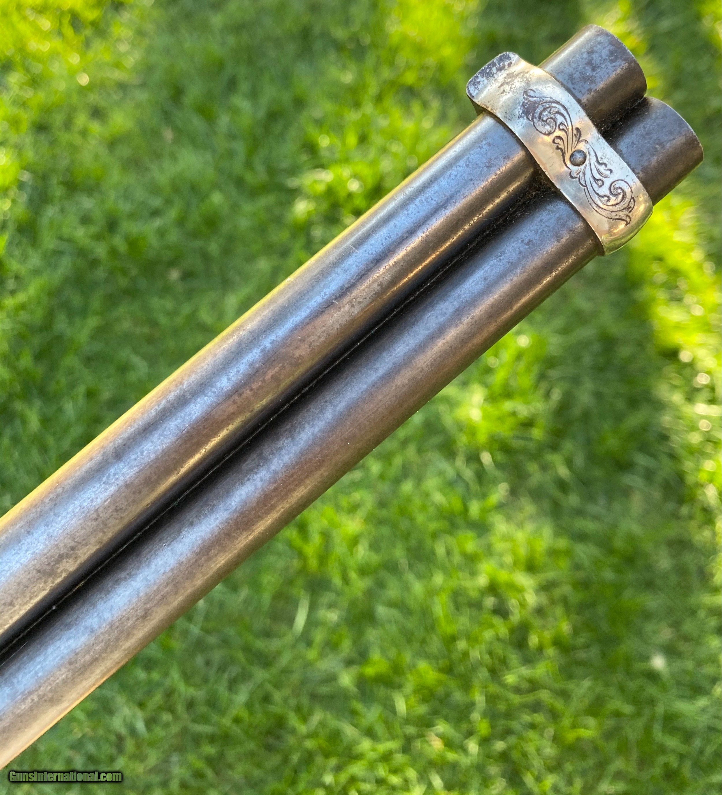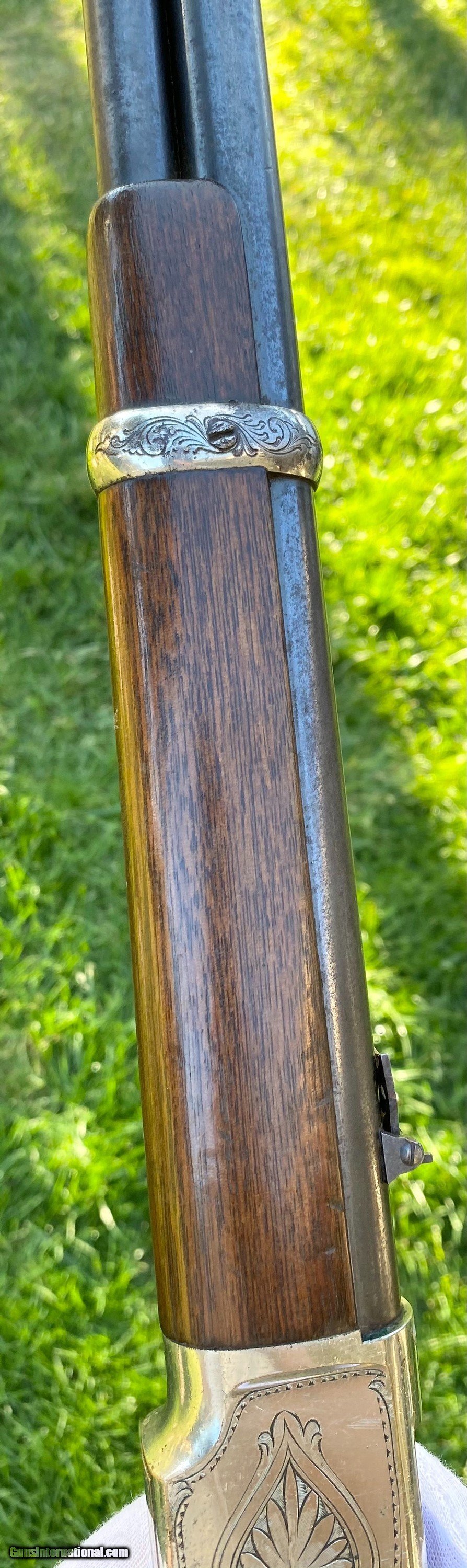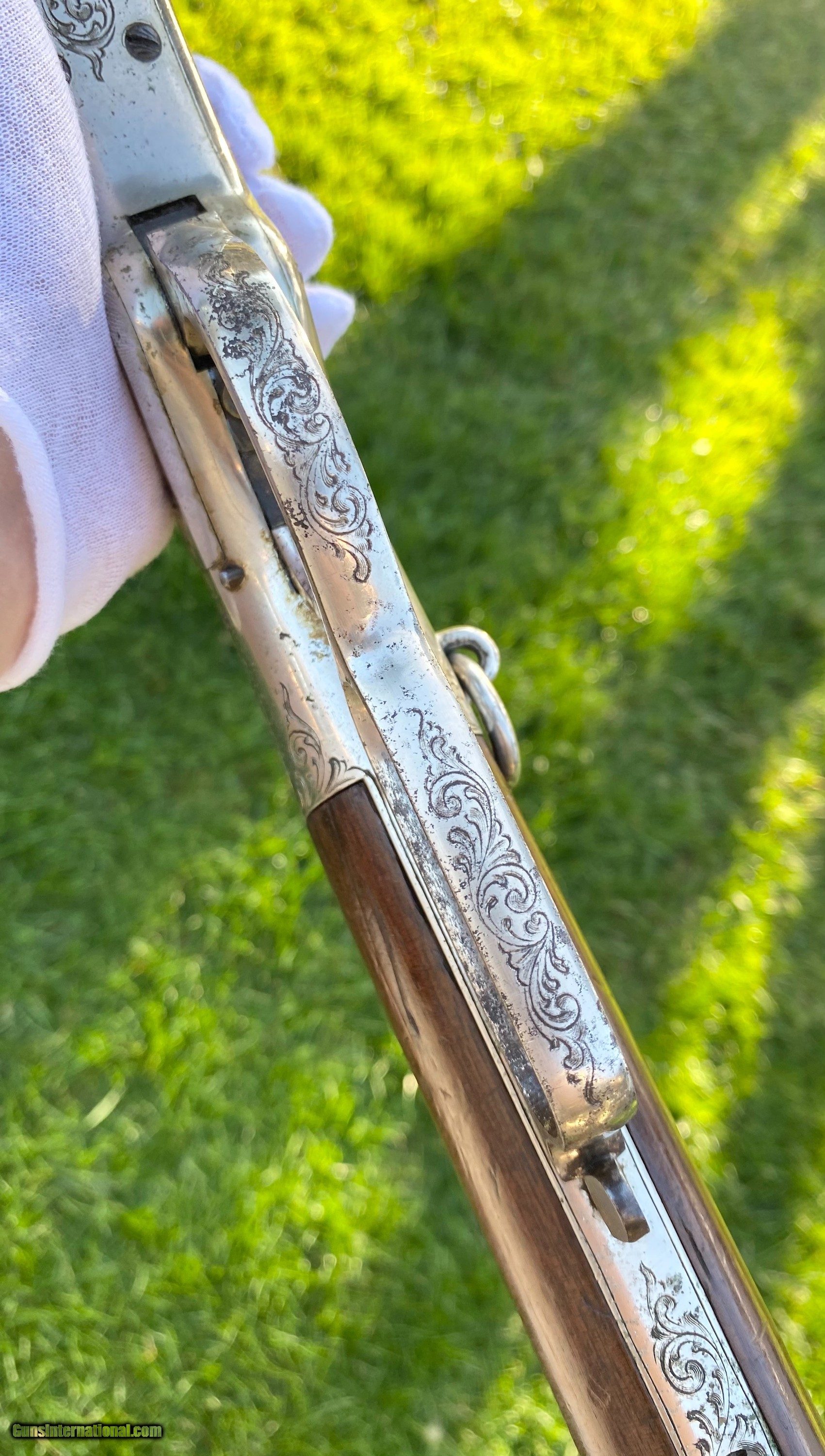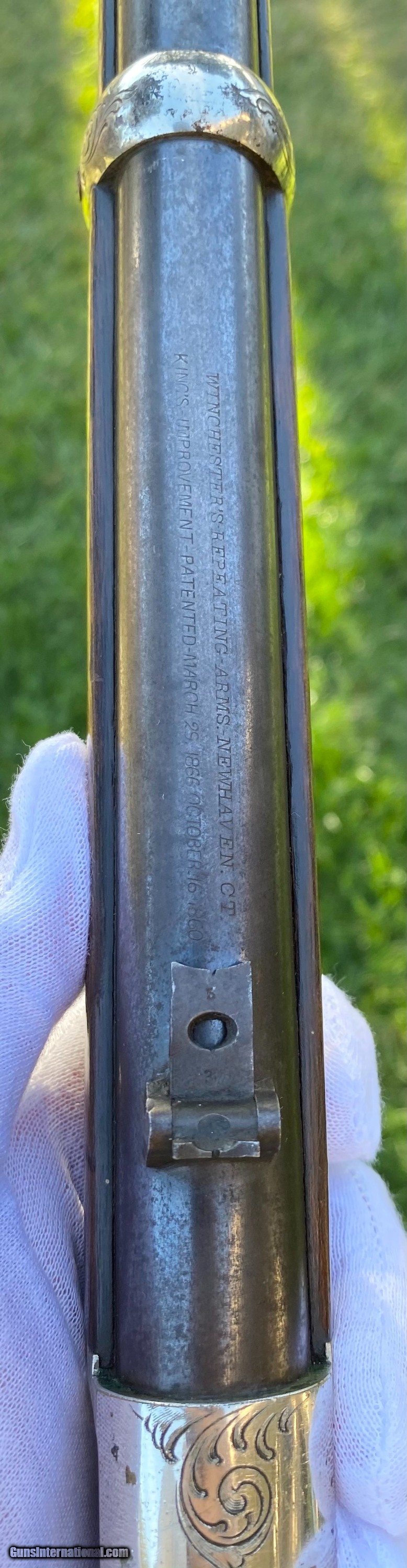 Description: This Winchester 1866 carbine was manufactured in 1870 and subsequently retailer period engraved and nickel plated on all parts except for the barrel and magazine tube. The engraving patterns are similar to "Unique Trio of Winchester 1866 Carbines" (47830, 48505, and 49157) on pages 315-320 in "Armsand Armor Annual Volume One" by Robert Held. Those carbines were also manufactured in 1870 and were purchased in Santiago, Chile, nearly a century later in 1968 and were originally in two-tier case with a St. Lousi retailer label. Held notes that all three were done by different hands but around the same time. This carbine was also clearly from a different hand. The sides of the receiver featured floral scroll and floral patterns with scallop bordering, there are simple scroll and line designs on top of the receiver and wedges of floral scroll on the upper and lower tang, underside of the receiver, on the bottom of the cartridge elevator, buttplate tang and on each side of the barrel bands. The top of the barrel ahead of the rear sight is marked with the two line address/patent dates and the serial number is on the lower tang. This carbine is in exceptional condition with around 95% original retailer applied nickel finish on the frame. The barrel and magazine tube retain nearly 40% original blue drifting. The original 3 piece cleaning rod is included in this sale however not pictured because of the limited photographs I can add. Mechanically excellent. More photographs are available upon request. This is a beautiful example of an engraved Winchester 1866! Shipping will depend on the service and insurance amount the buyer chooses. Thank You! Sold SOLD Antique: Yes |