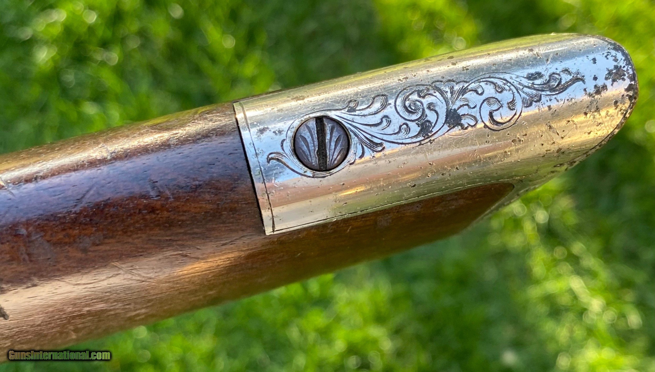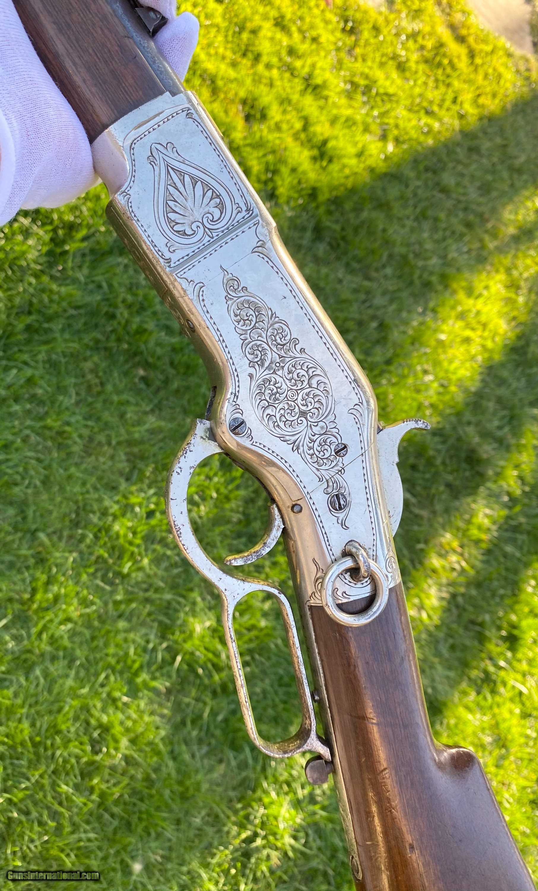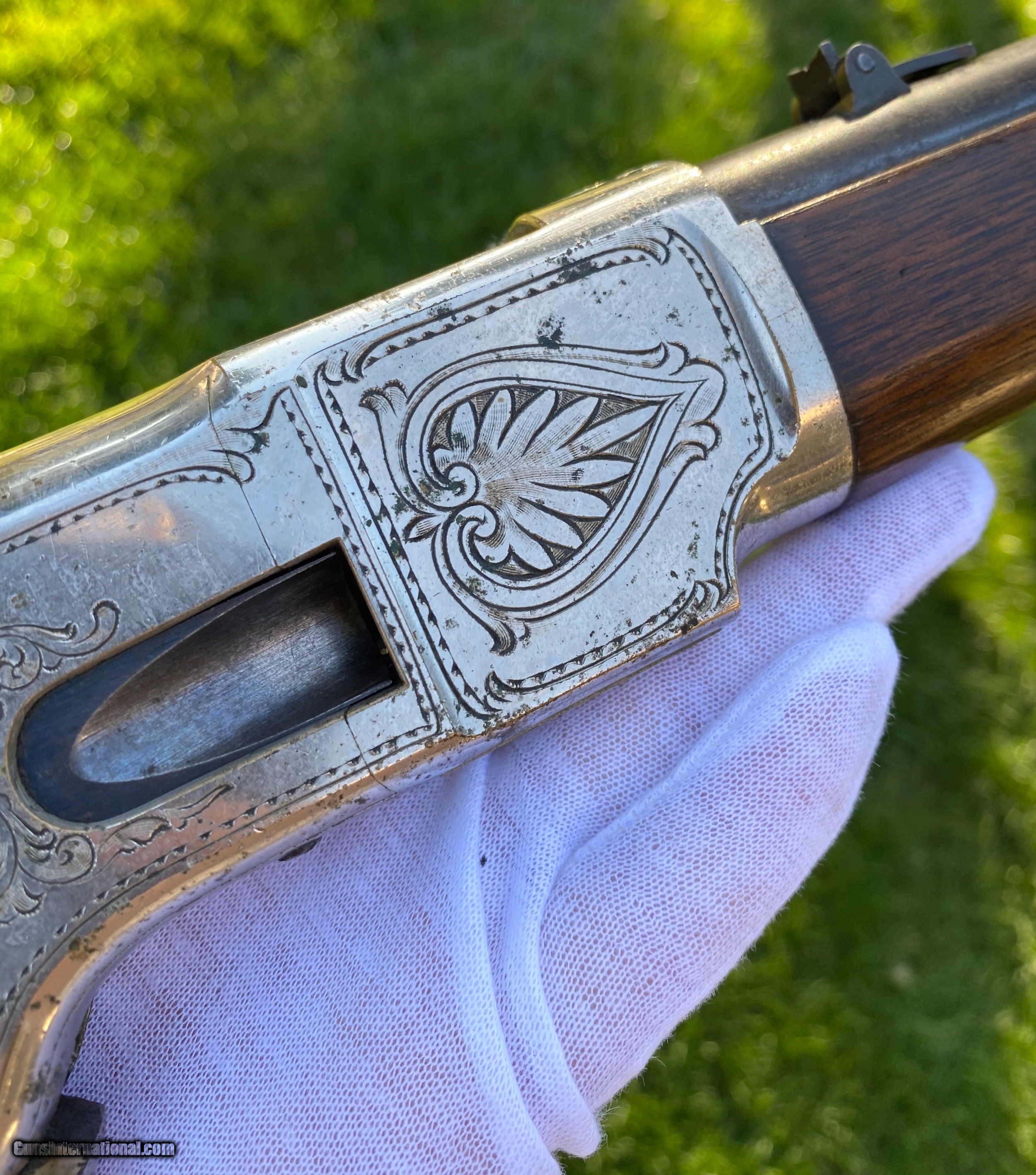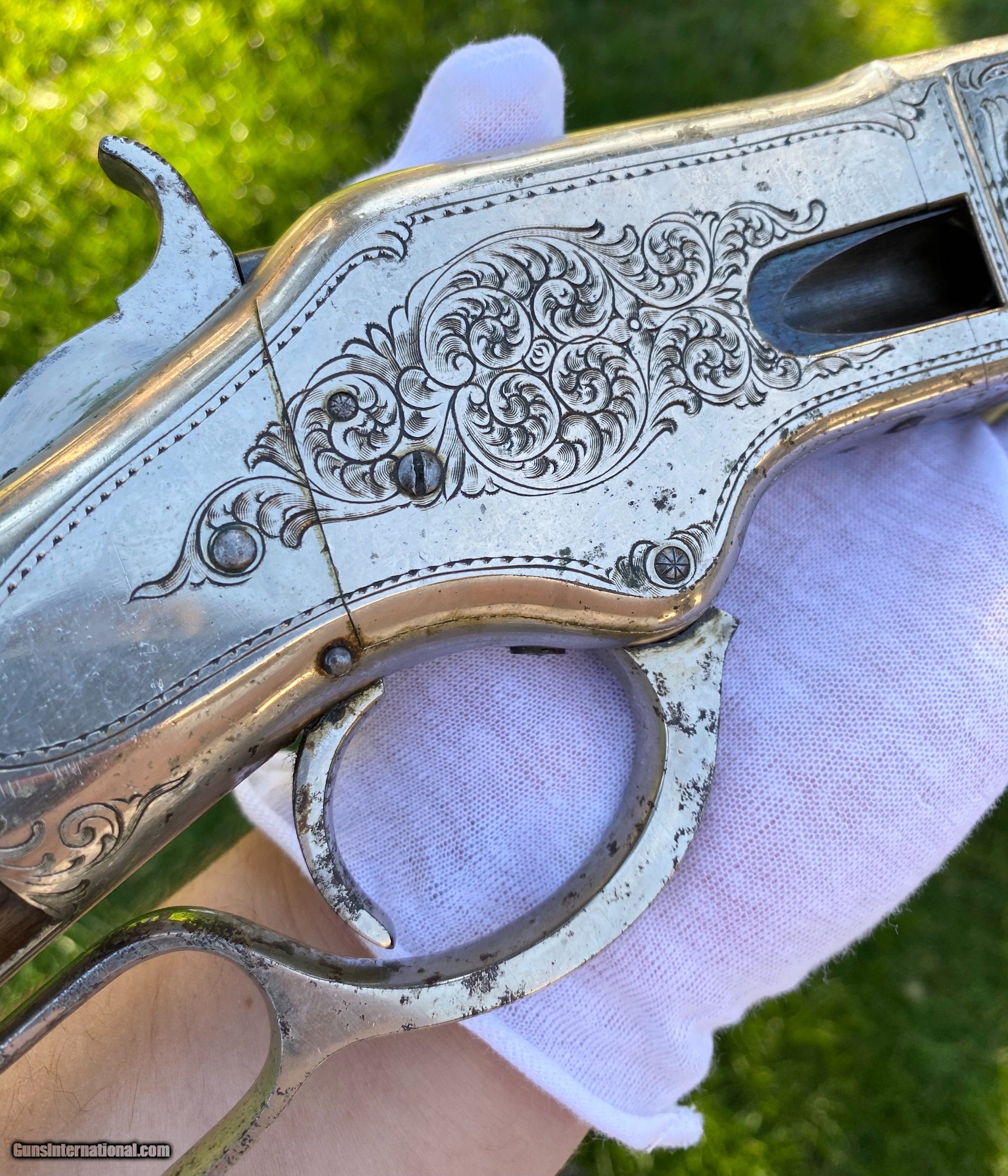 Description: This Winchester 1866 carbine was manufactured in 1870 and subsequently retailer period engraved and nickel plated on all parts except for the barrel and magazine tube. The engraving patterns are similar to "Unique Trio of Winchester 1866 Carbines" (47830, 48505, and 49157) on pages 315-320 in "Armsand Armor Annual Volume One" by Robert Held. Those carbines were also manufactured in 1870 and were purchased in Santiago, Chile, nearly a century later in 1968 and were originally in two-tier case with a St. Lousi retailer label. Held notes that all three were done by different hands but around the same time. This carbine was also clearly from a different hand. The sides of the receiver featured floral scroll and floral patterns with scallop bordering, there are simple scroll and line designs on top of the receiver and wedges of floral scroll on the upper and lower tang, underside of the receiver, on the bottom of the cartridge elevator, buttplate tang and on each side of the barrel bands. The top of the barrel ahead of the rear sight is marked with the two line address/patent dates and the serial number is on the lower tang. This carbine is in exceptional condition with around 95% original retailer applied nickel finish on the frame. The barrel and magazine tube retain nearly 40% original blue drifting. The original 3 piece cleaning rod is included in this sale however not pictured because of the limited photographs I can add. Mechanically excellent. More photographs are available upon request. This is a beautiful example of an engraved Winchester 1866! Shipping will depend on the service and insurance amount the buyer chooses. Thank You! Sold SOLD Antique: Yes |