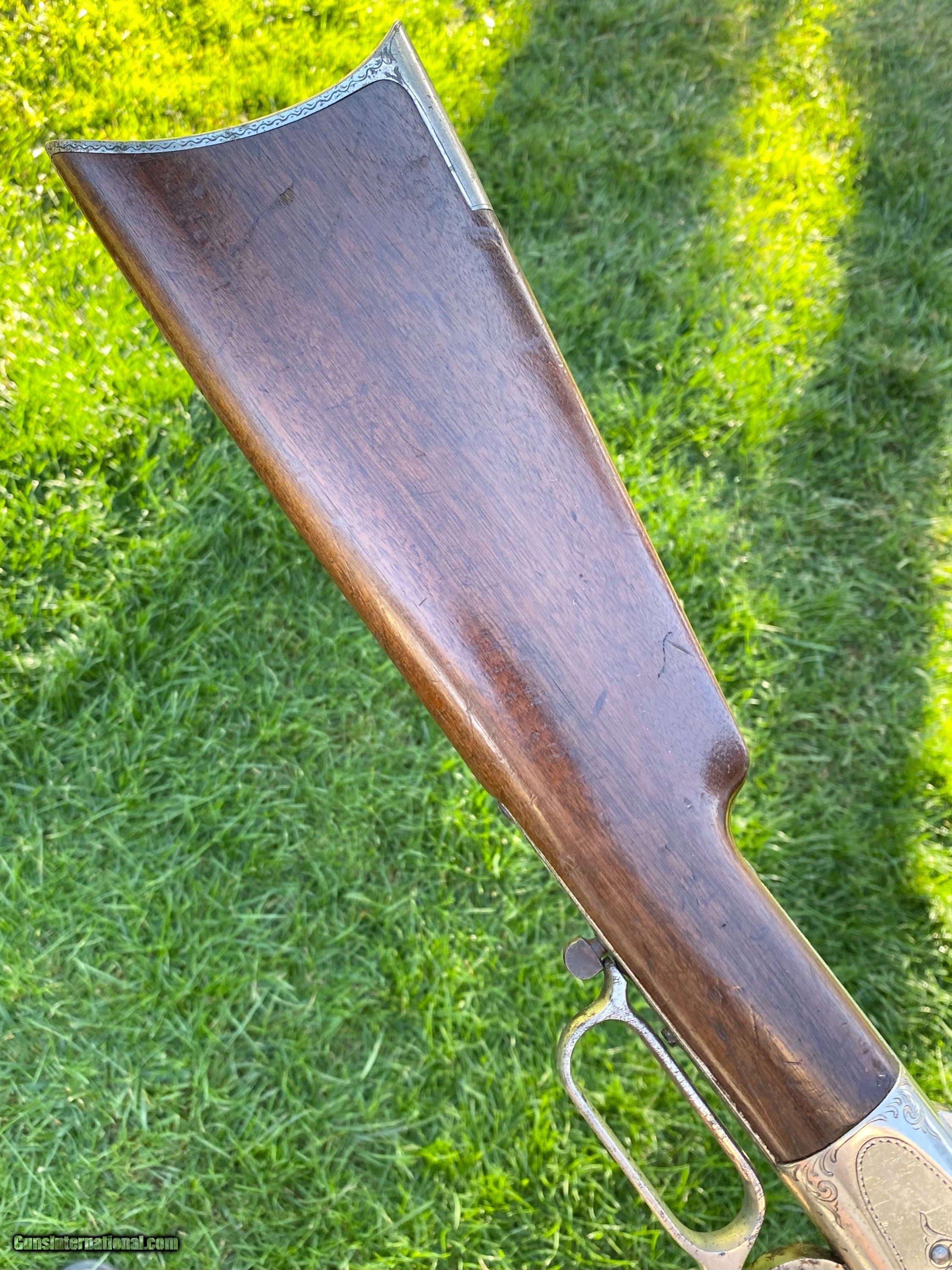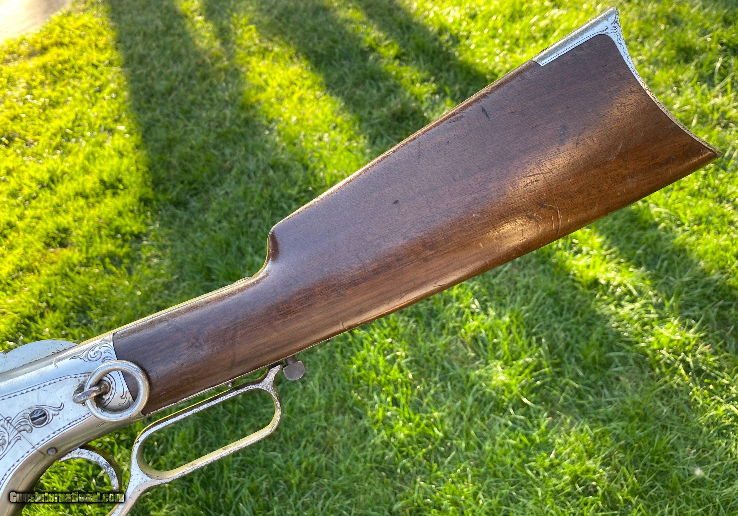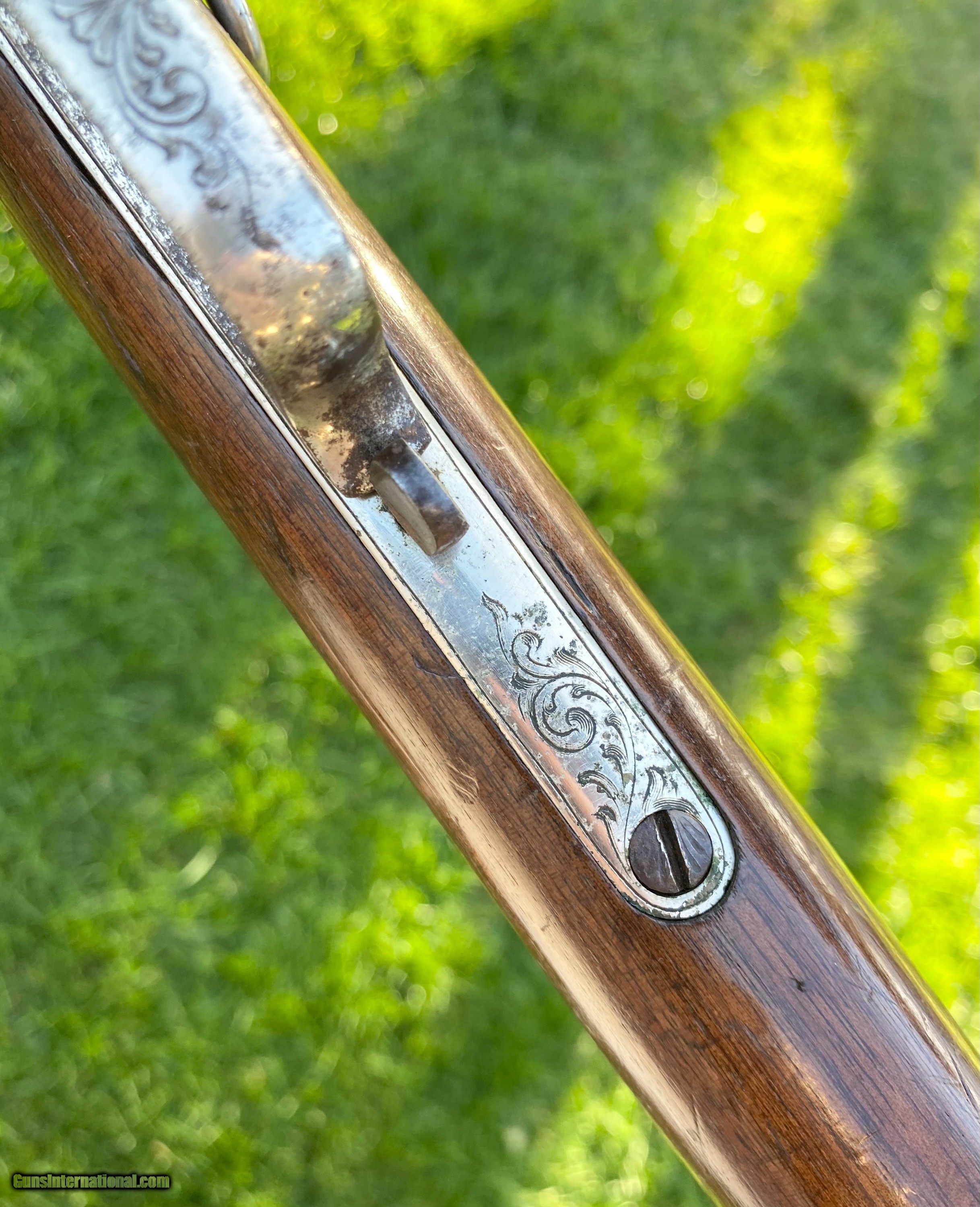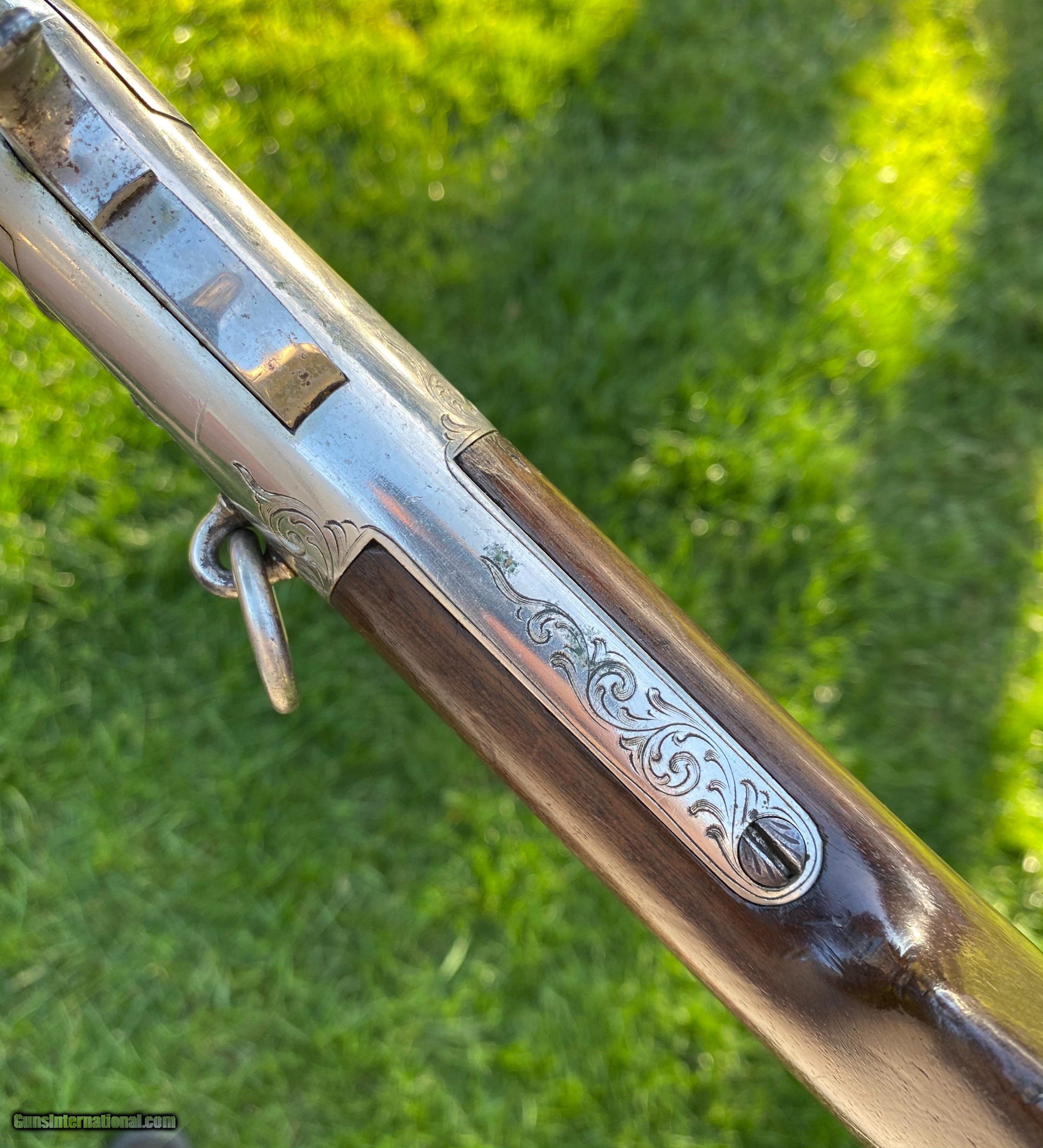 Description: This Winchester 1866 carbine was manufactured in 1870 and subsequently retailer period engraved and nickel plated on all parts except for the barrel and magazine tube. The engraving patterns are similar to "Unique Trio of Winchester 1866 Carbines" (47830, 48505, and 49157) on pages 315-320 in "Armsand Armor Annual Volume One" by Robert Held. Those carbines were also manufactured in 1870 and were purchased in Santiago, Chile, nearly a century later in 1968 and were originally in two-tier case with a St. Lousi retailer label. Held notes that all three were done by different hands but around the same time. This carbine was also clearly from a different hand. The sides of the receiver featured floral scroll and floral patterns with scallop bordering, there are simple scroll and line designs on top of the receiver and wedges of floral scroll on the upper and lower tang, underside of the receiver, on the bottom of the cartridge elevator, buttplate tang and on each side of the barrel bands. The top of the barrel ahead of the rear sight is marked with the two line address/patent dates and the serial number is on the lower tang. This carbine is in exceptional condition with around 95% original retailer applied nickel finish on the frame. The barrel and magazine tube retain nearly 40% original blue drifting. The original 3 piece cleaning rod is included in this sale however not pictured because of the limited photographs I can add. Mechanically excellent. More photographs are available upon request. This is a beautiful example of an engraved Winchester 1866! Shipping will depend on the service and insurance amount the buyer chooses. Thank You! Sold SOLD Antique: Yes |