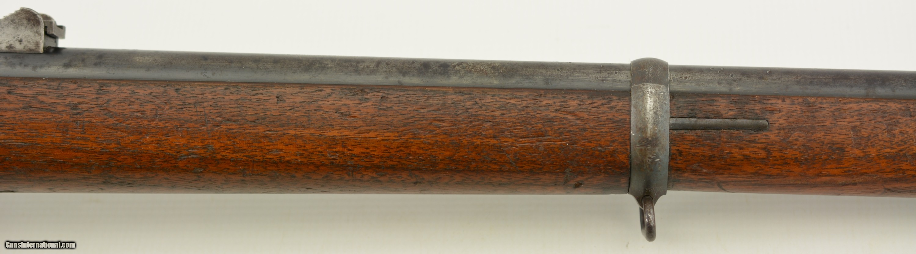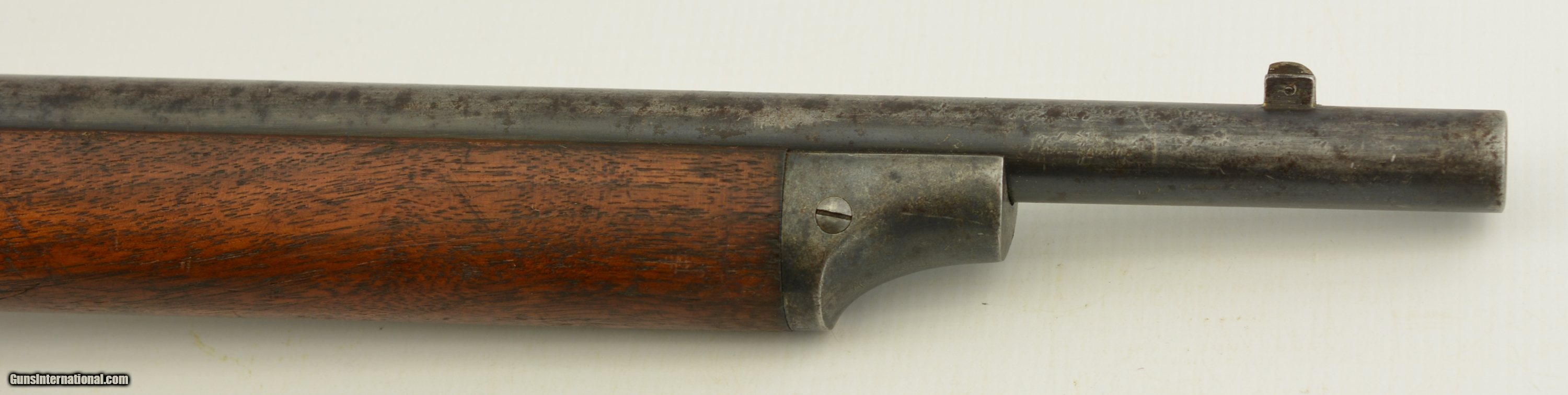 Description: Serial #114392, .45-90, 30" barrel with a fine, bright bore that has mild freckling within the grooves. This is an exceedingly rare Winchester musket that is described in Madis' book as "The rarest of any Winchester Lever Muskets" with approx. 350 produced and most exported. The Rifle retains about 40-45% of the original blue on the barrel with silvering and scattered patches of light surface freckling, as well as some minuscule peen marks at the barrel band, and a few scattered spots of pinprick pitting. Some of the original bright fire blue still remains on the rear sight spring. The frame has an overall mottled patina with bright gray under even freckling, and hints of the original muted color case-hardening still visible. Additional small spots of dark plum colored freckling are present along the lower edge of the left side. The lever has a matching patina, although there is some fairly bright colors still left on the lower tang, and the loading gate retains about 60-70% of the original blue on the rear plate. The walnut stock with crescent butt, and the musket forend are both original and have never been sanded. The oil finish has a rich brown color, and there are scattered handling and usage marks and blemishes throughout, heaviest at the barrel band. Correct sling swivels are mounted, and the metal buttplate has a speckled, pewter gray patina. Madis gives a production figure of around 350 Model 1886 muskets, making this the rarest of the lever action musket variations, and nearly all of those were chambered in .45-70 (this last information was extracted from Winchester records by Porter and Hawk; research associates at the Cody Fireams Museum). Contact with the Cody Museum further reveals that while the serial number application was recorded for this musket, the record is in fact blank. So it is possible is was never received by the shipping department, so it may either have been picked up in person at the New Haven plant, or presented directly to the original recipient. In any even, this is a special Winchester, in an extremely rare configuration, and in very good-fine original condition. A rarity of Winchester Firearm Collectibles. Antique SOLD Antique: Yes Manufacturer: Winchester Model: 1886 Caliber Info: .45-90 Gauge Info: .45-90 |