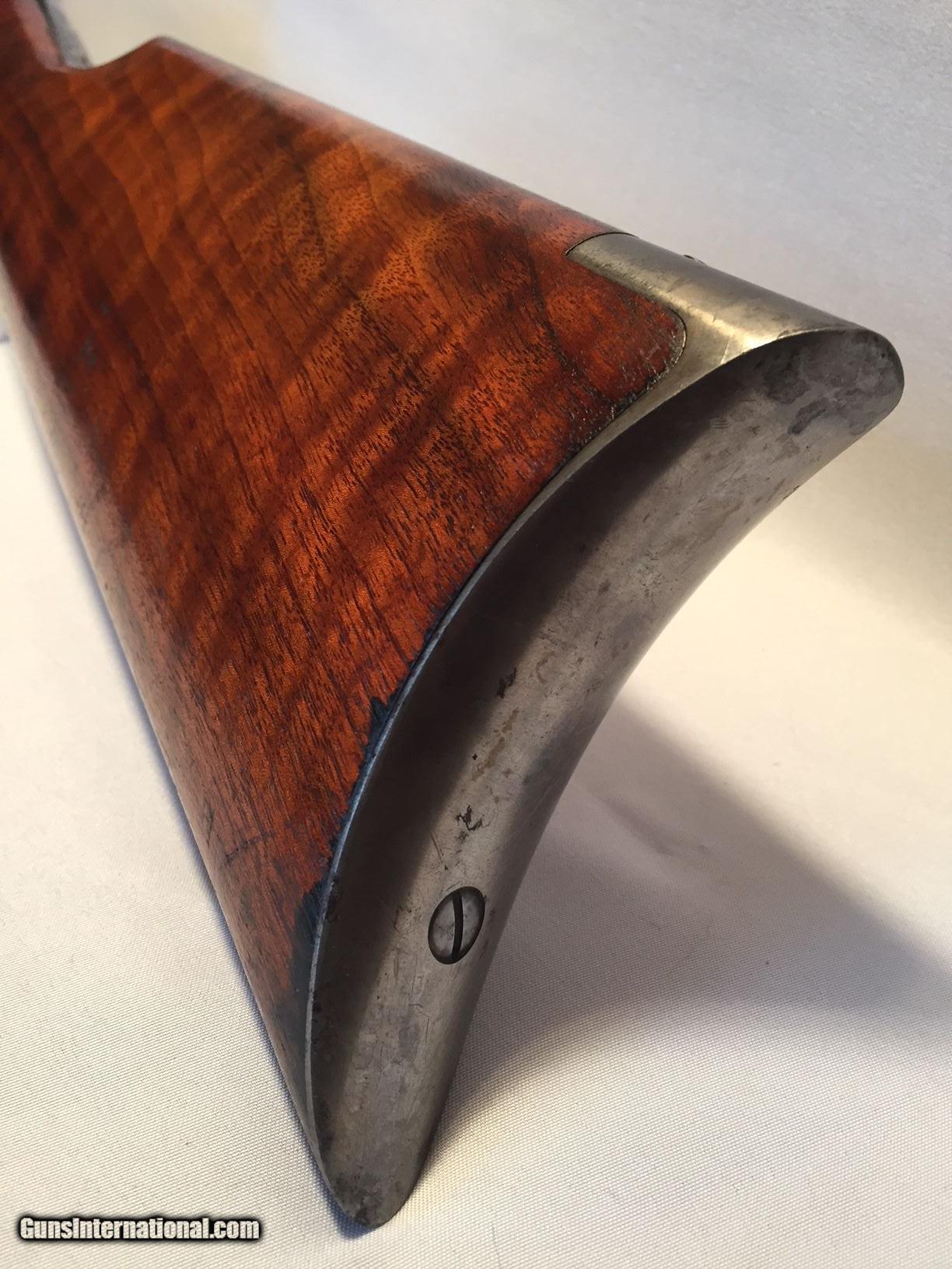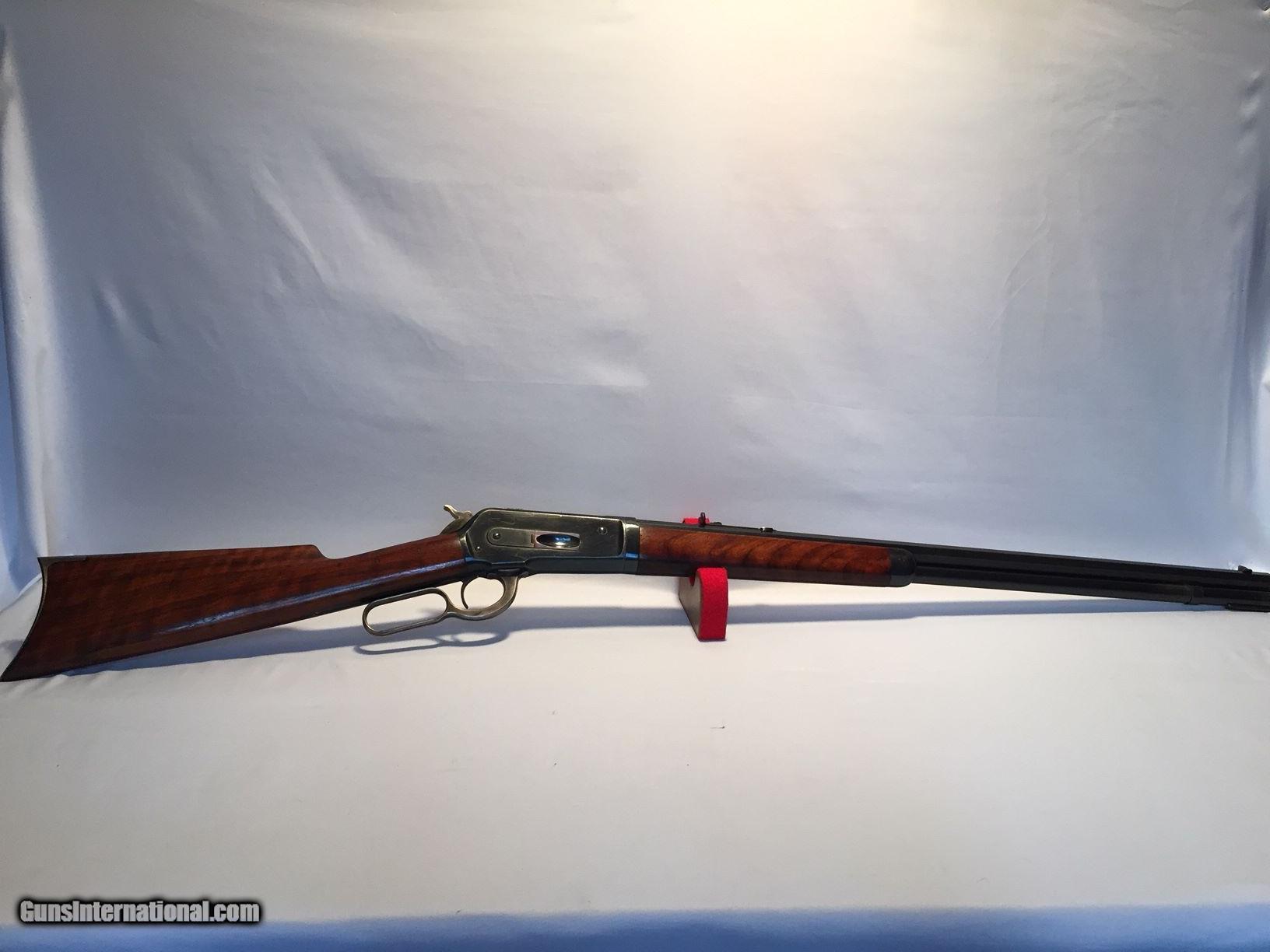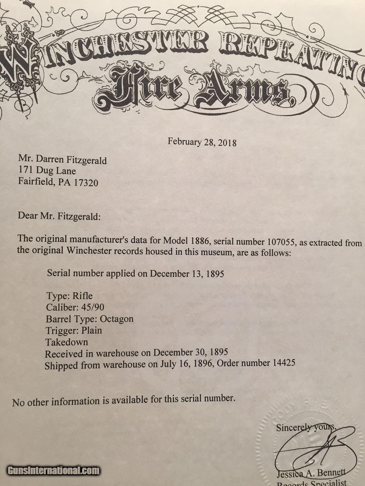 Description: MOD 1886 MFG 1895 that retains 98% plus blue with nice grade one American walnut stock that retains all of it's original varnish, excellent bore. Take down configuration with Cody letter. Only about 23,600 45-90 WCF were produced. 86s with blue frames in the antique serial number range are scarce. This is an excellent example! SOLD Antique: Yes |
