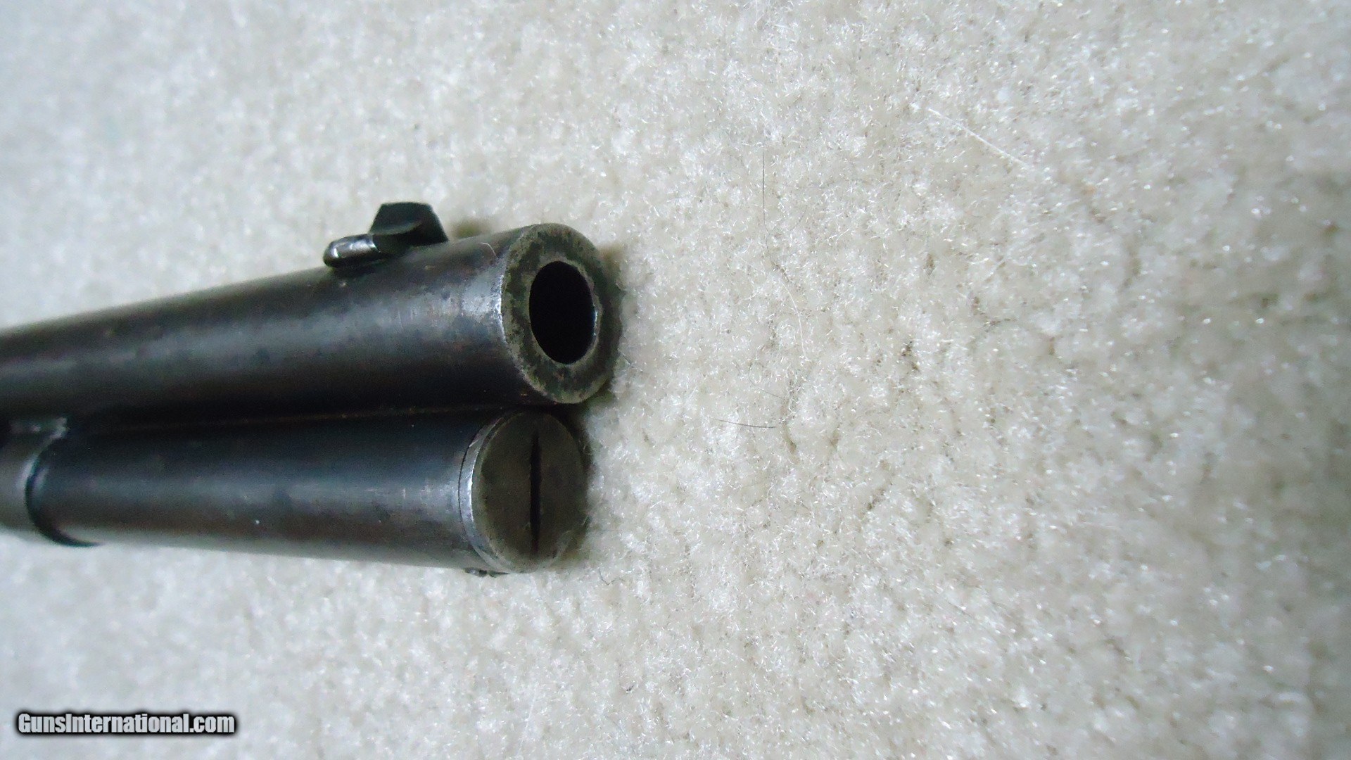 Description: VERY LOW SERIAL NUMBER 1894 .38-55 ROUND BARREL RIFLE, #19XXX, MADE 1897. A little "helping" would go a long way on this one. It has a fine+ bore that is only a little dark with good rifling all the way through. The receiver shows some good blue on 1/3 to 1/2 of the sides with the balance mixing brown and gray and the barrel shows very thinning blue to mostly gray with a 2 1/2 in area of rust pitting on the right side of the barrel just ahead of the forearm. All markings are good and it has the original Winchester buckhorn rear sight with the standard Winchester blade front sight. Forend is fine+ with only some handling marks. The butt stock has 3 1/2" by 1/4" sliver out at the right lower tang/receiver juncture. The receiver. is cracked on each side of the hammer- worse on the left side than right side. Action is tight, screws are generally excellent. The rifle functions fine as is, but there are gunsmiths who could work wonders with this early 1894 with a decent bore! SOLD Antique: Yes Rifle Caliber: .38-55 Winchester Manufacturer: Winchester Model: 1894 Serial Number: 19XXX Barrel Length: 24 Condition: GOOD Bore Condition: FINE |