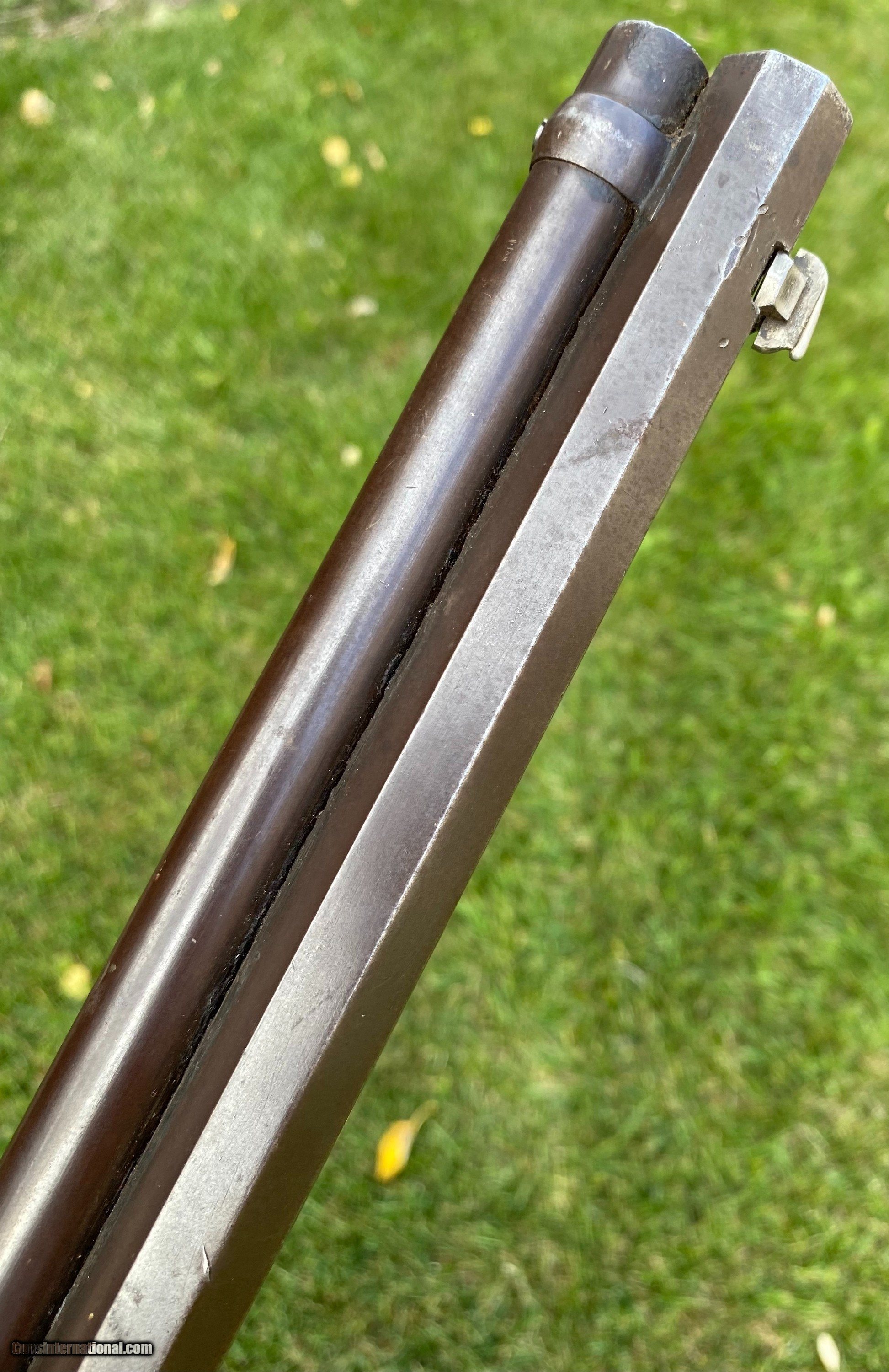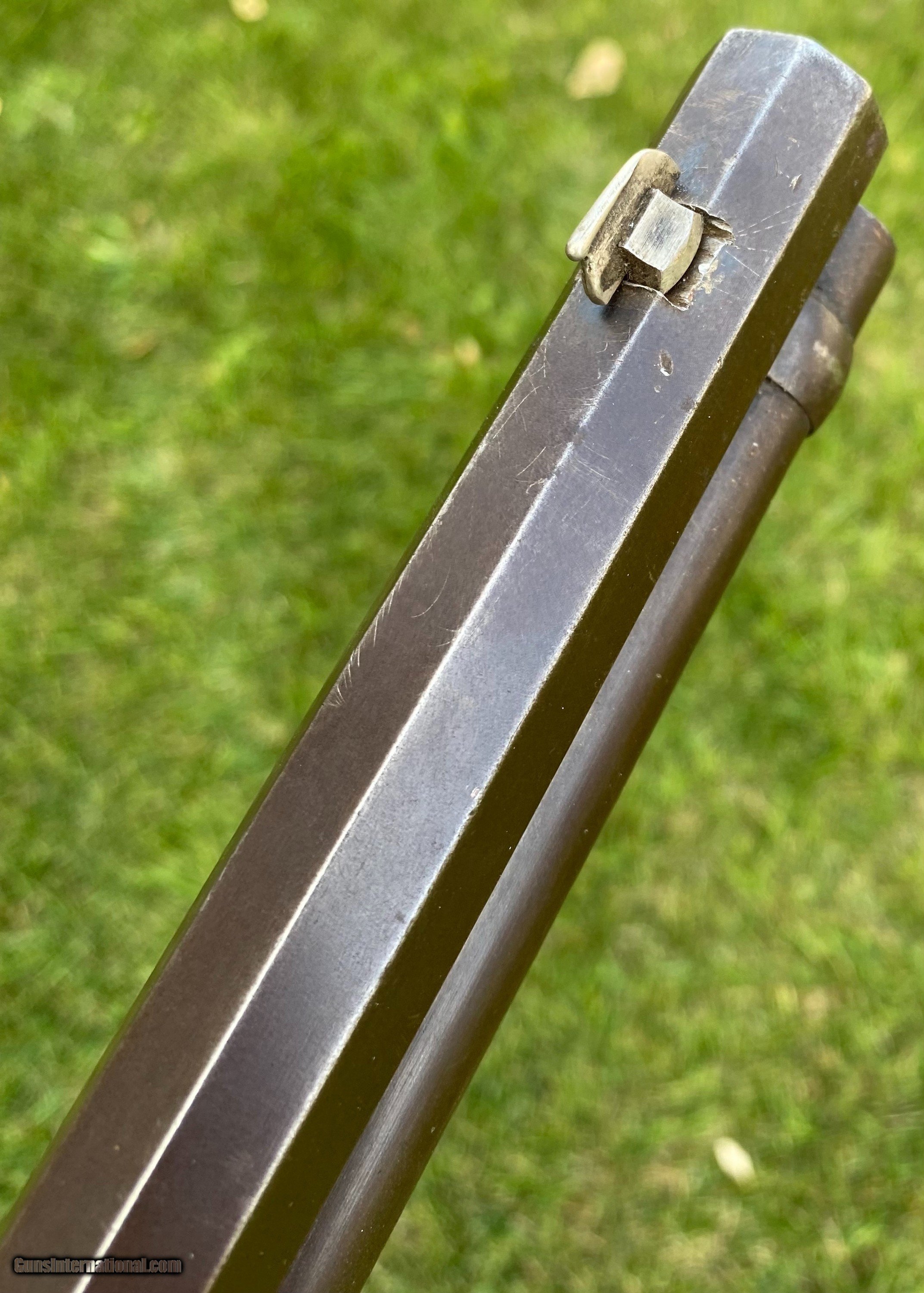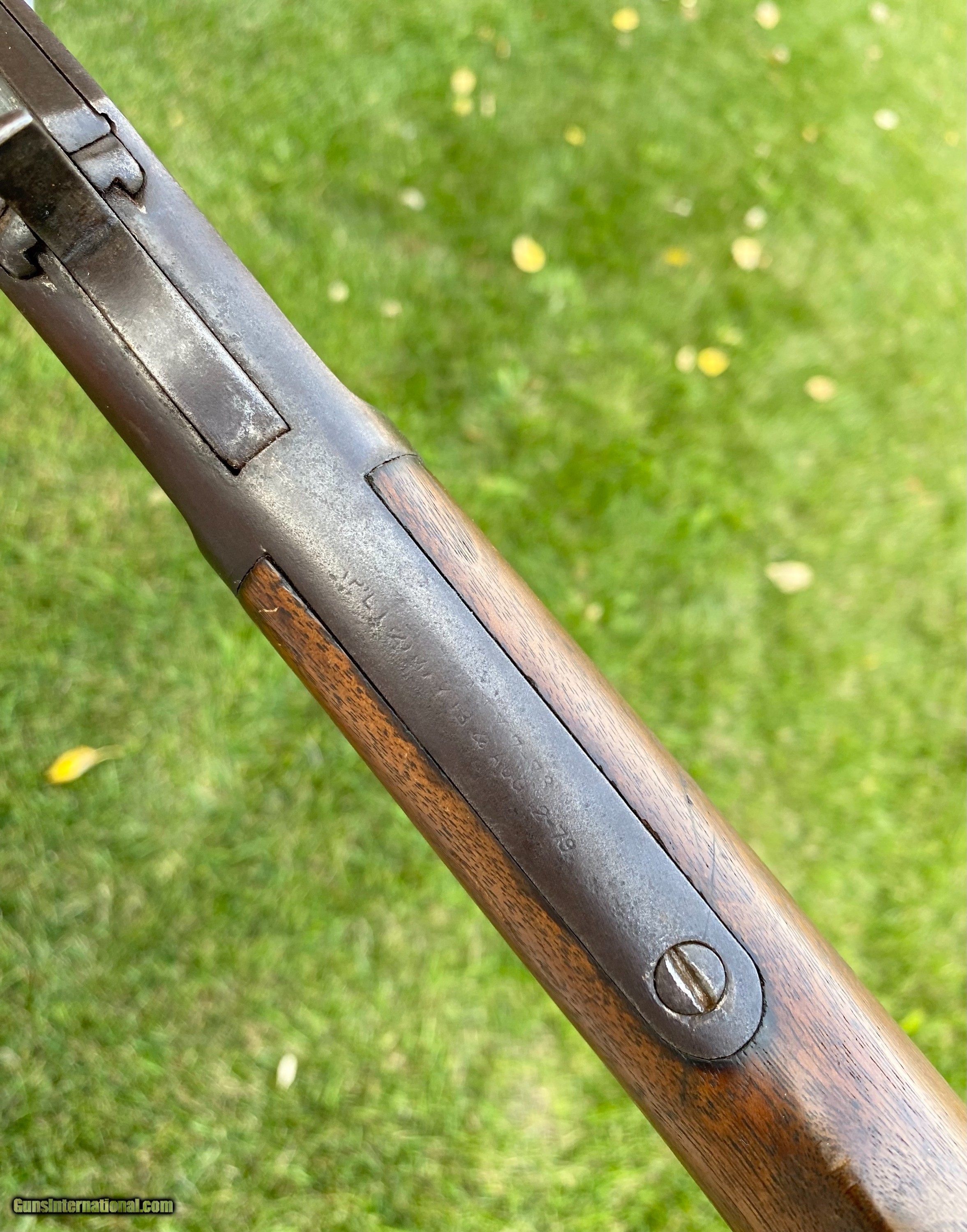 Description: This Whitney Kennedy Rifle shows a really nice patina finish throughout. All original blue finish is gone showing a nice natural aged grey patina. Octagon barrel .44-40 caliber. The front sight appears to be a replacement. The markings on the tang are a bit faint. The buttstock and forearm are very good condition. Mechanically the lever is tight and the action functions as it should. The bore shows areas of roughness and would rate a 5 to a 5.5 on a 1 to 10 scale. Nice honest gun that’s somewhat hard to find. Shipping is $60 plus actual insurance. Buyer can choose the insurance amount it wanted. Thanks! Asking: $2,600.00 SOLD Antique: Yes |