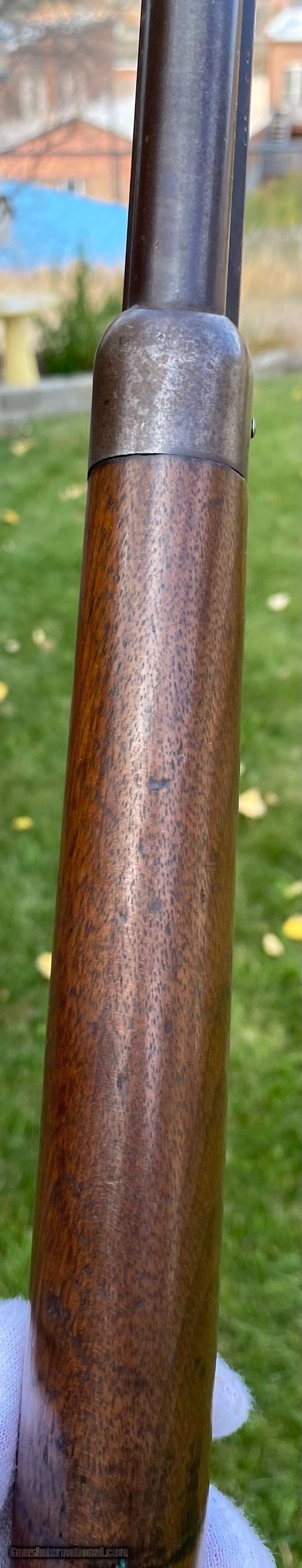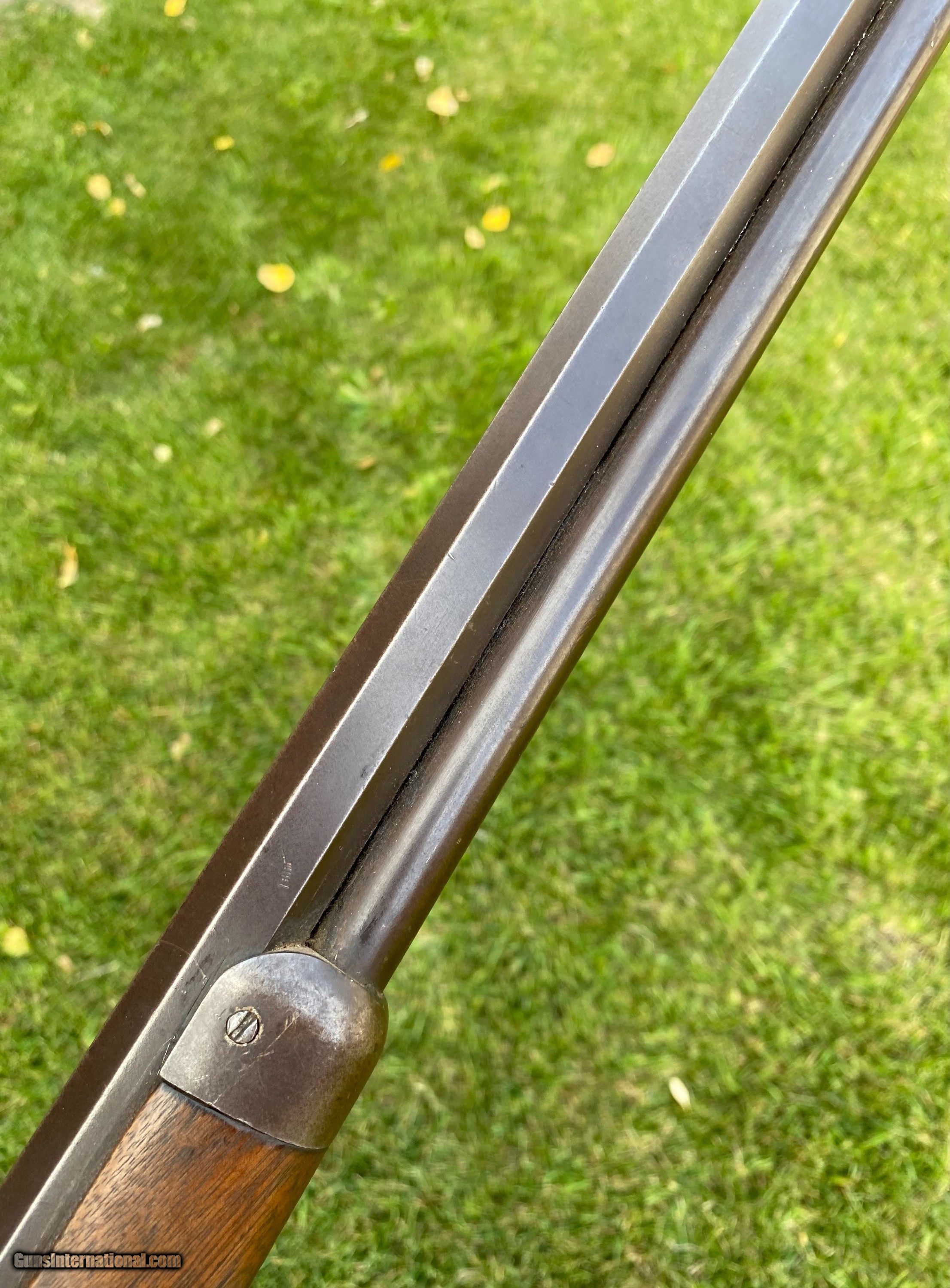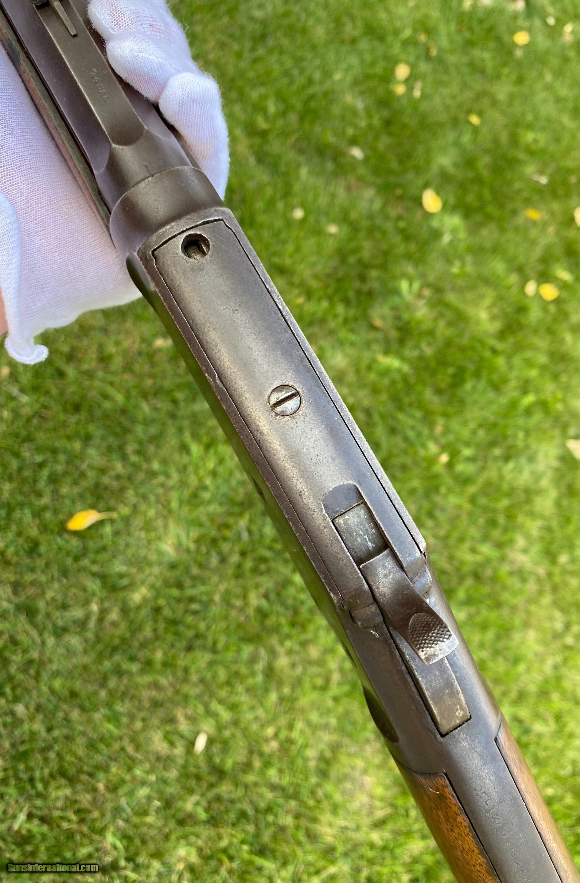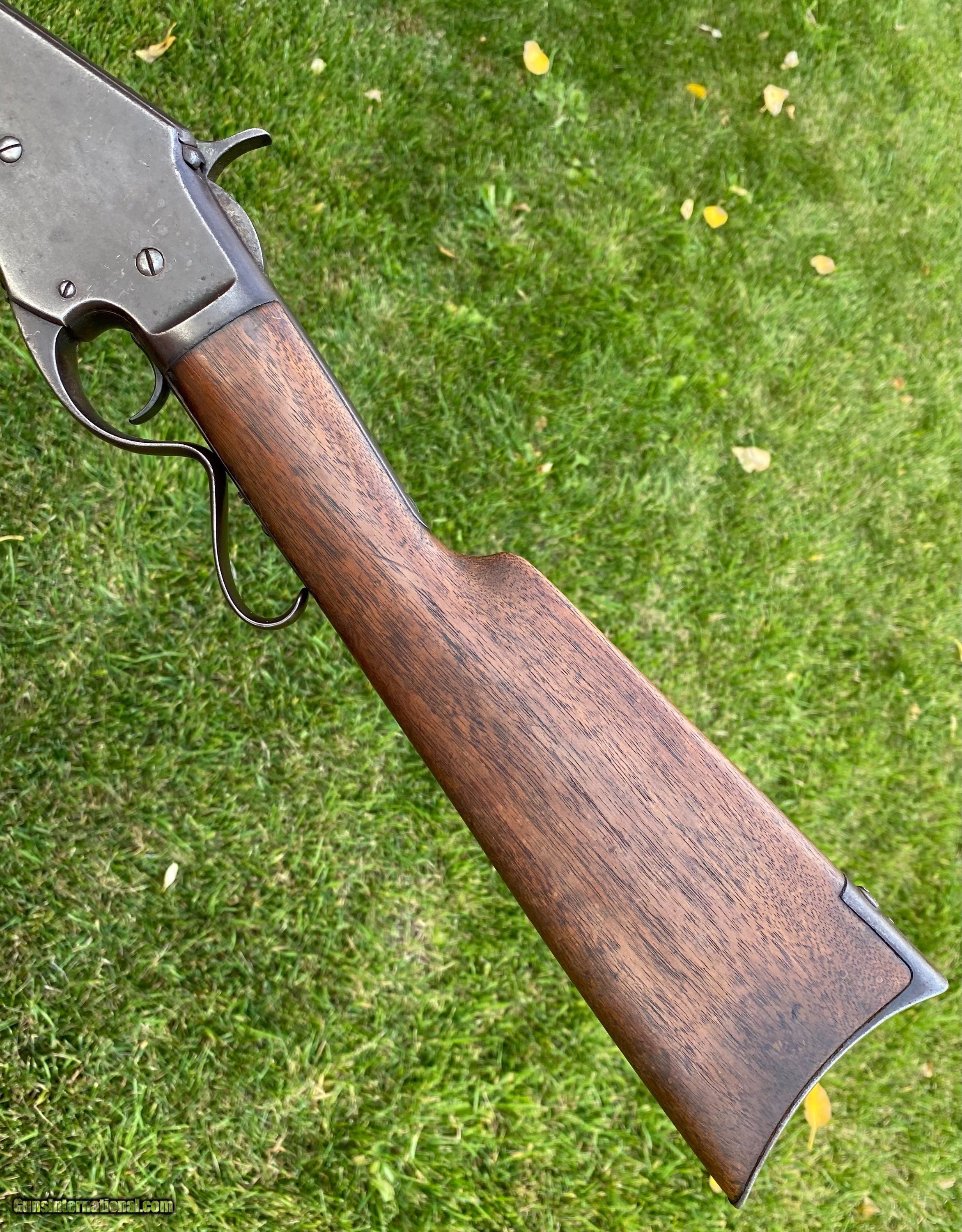 Description: This Whitney Kennedy Rifle shows a really nice patina finish throughout. All original blue finish is gone showing a nice natural aged grey patina. Octagon barrel .44-40 caliber. The front sight appears to be a replacement. The markings on the tang are a bit faint. The buttstock and forearm are very good condition. Mechanically the lever is tight and the action functions as it should. The bore shows areas of roughness and would rate a 5 to a 5.5 on a 1 to 10 scale. Nice honest gun that’s somewhat hard to find. Shipping is $60 plus actual insurance. Buyer can choose the insurance amount it wanted. Thanks! Asking: $2,600.00 SOLD Antique: Yes |