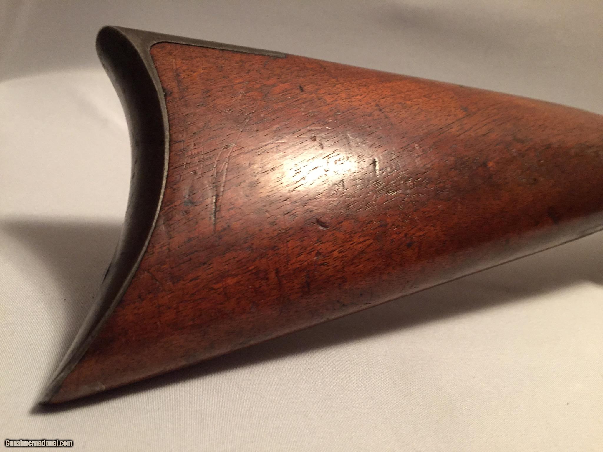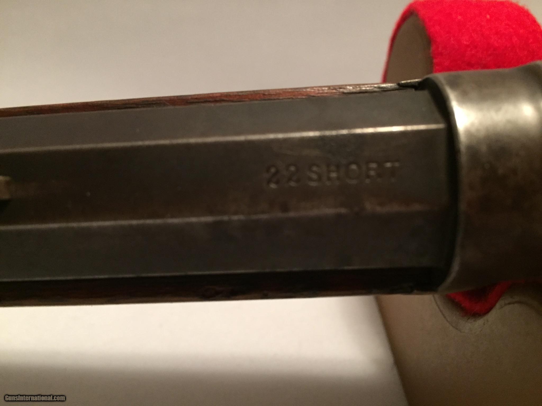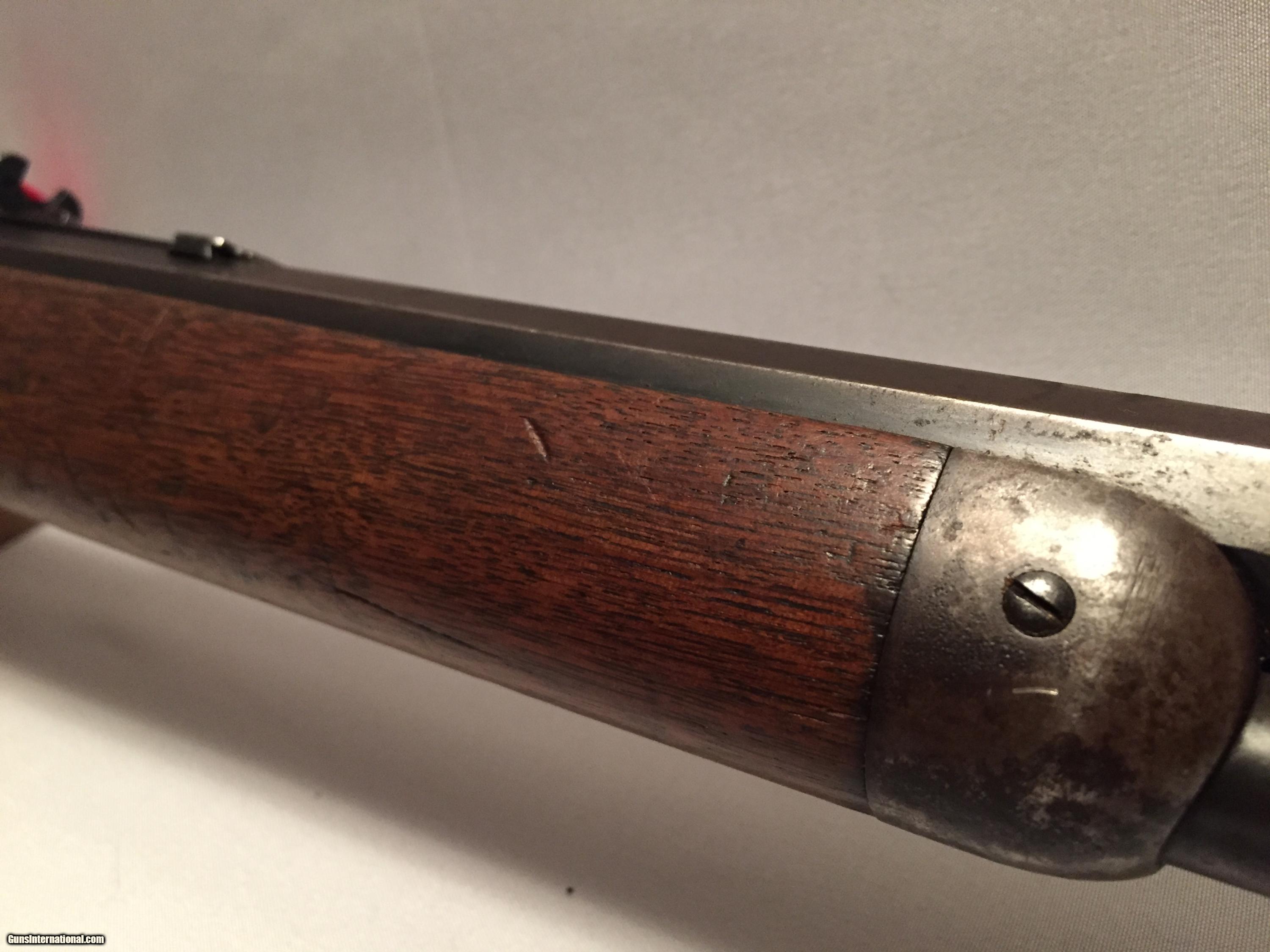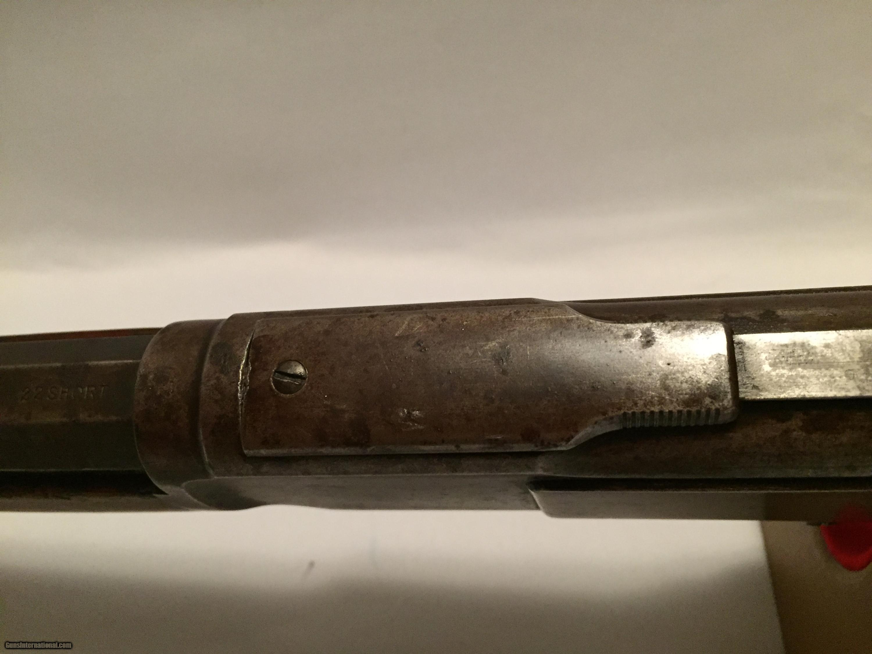 Description: Mod 1873 22 short. This is just a nice honest gun with all the honest wear that comes with a 118 year old rifle and these 22's got used pretty hard. Made in 1898 with only about 19,000 produced. The magazine tube has all the internal parts intact. There is a small repair on right hand side at the rist (see photo's) Antique - No FFL required SOLD Antique: Yes Serial Number: 513450B |