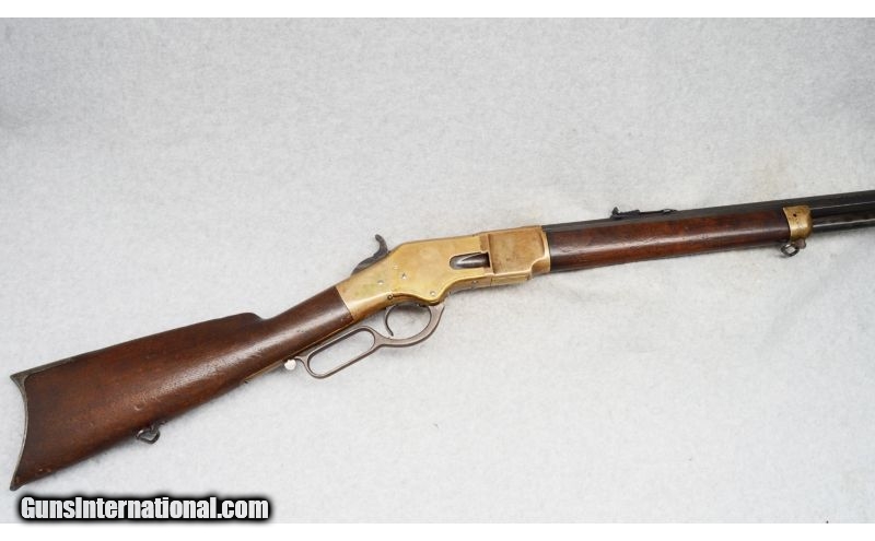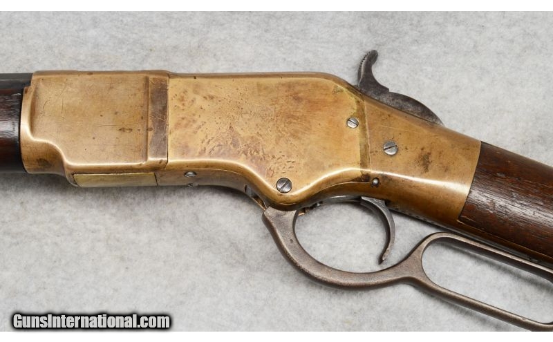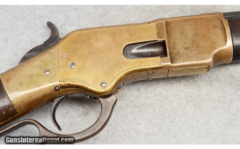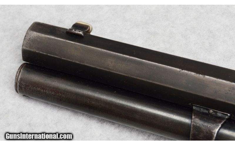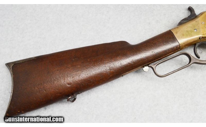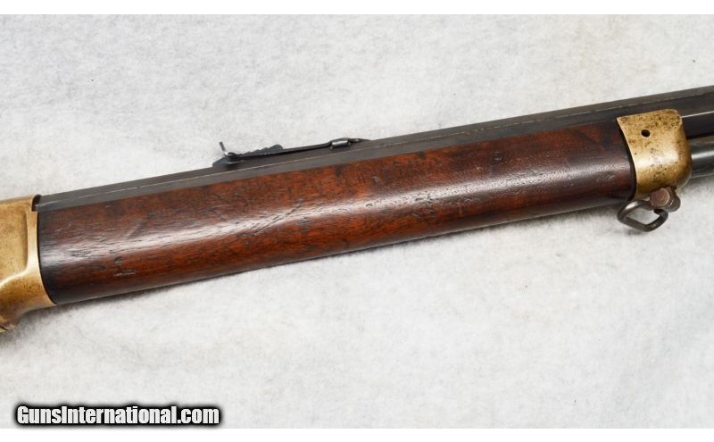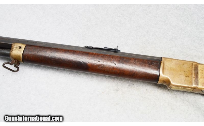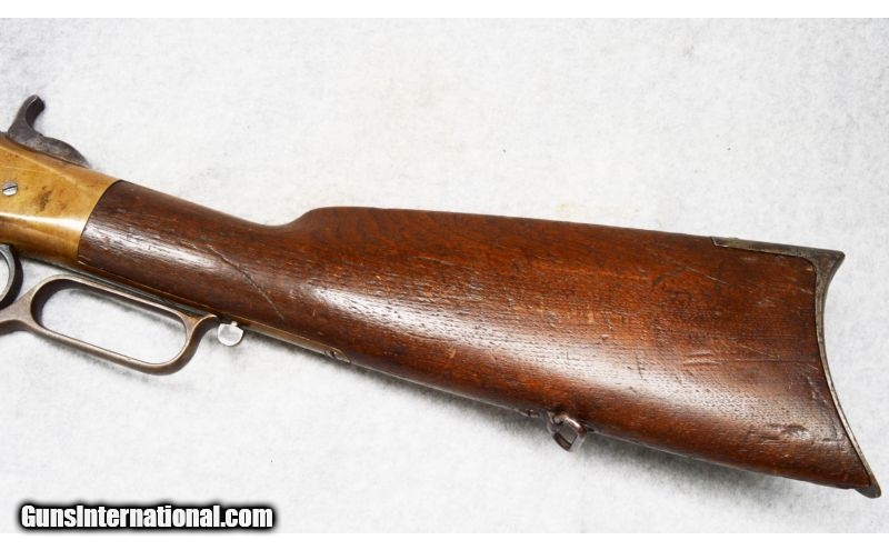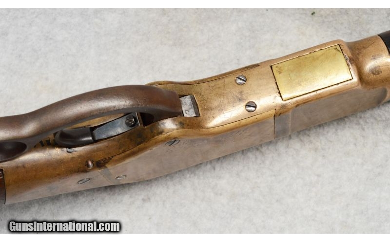 Description: SOLD Manufacturer: Serial No. 121499. Caliber Info: .44 RF Metal Condition: Fair with most of the finish remaining on the barrel and evidence of freckling and handling marks. Brass receiver shows scratches and dings. Wood Condition: Fair with handling marks and a crack on the right side of the stock. Bore Condition: Shiny with good rifling. Barrels: 24" octagon. Stock: Smooth walnut. Fore End: Smooth wood. Butt Pad: Smooth steel. Weight: 8-lbs., 15-ozs. Sights: Front bead, stepped rear blade. Item Location: Fort Worth, TX |