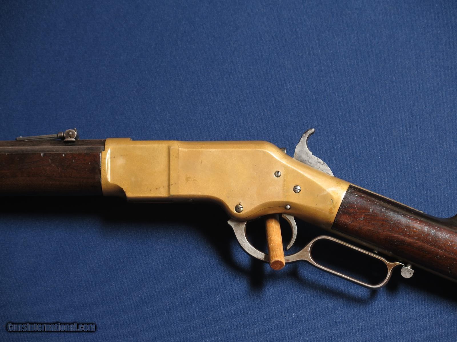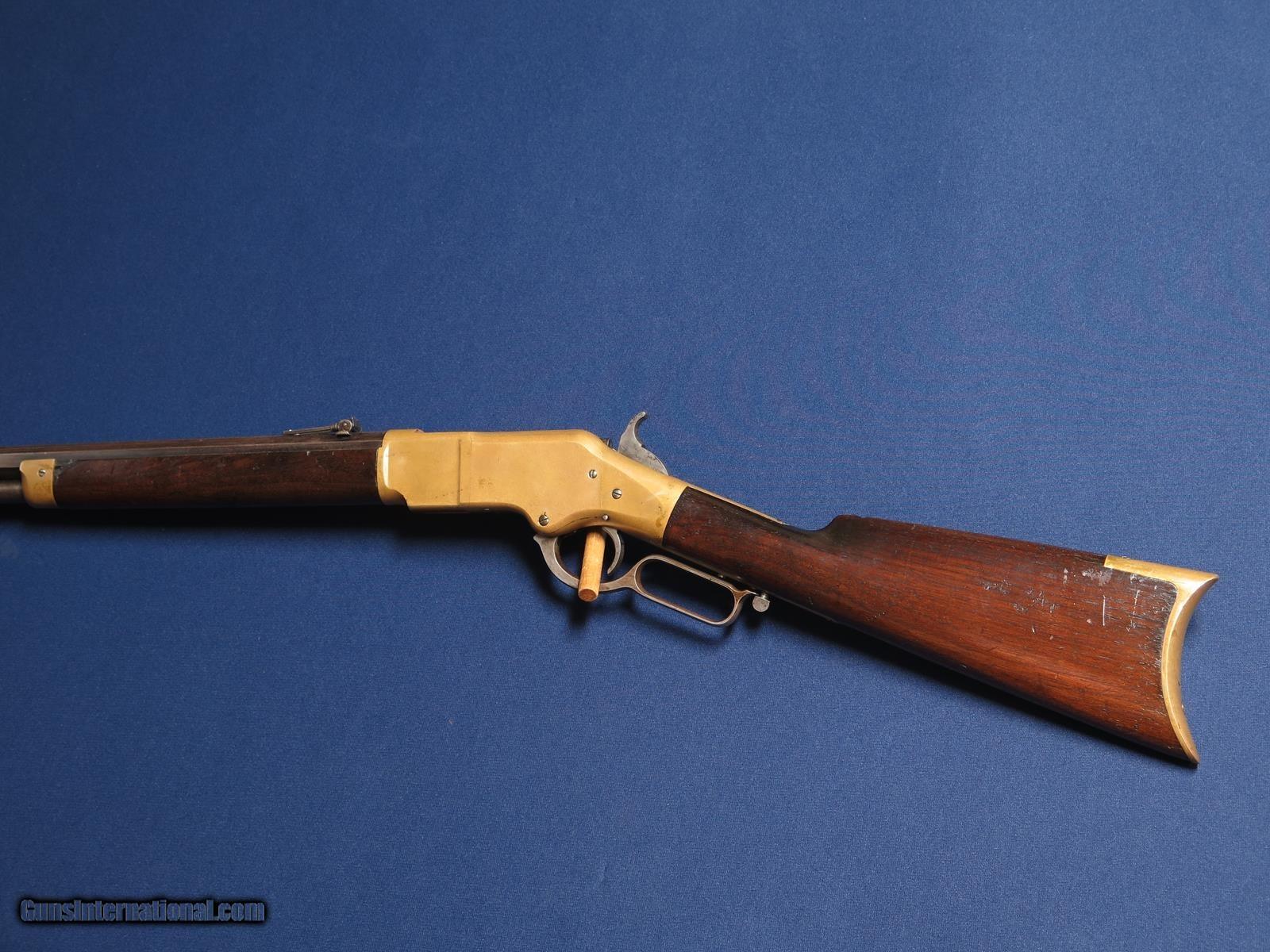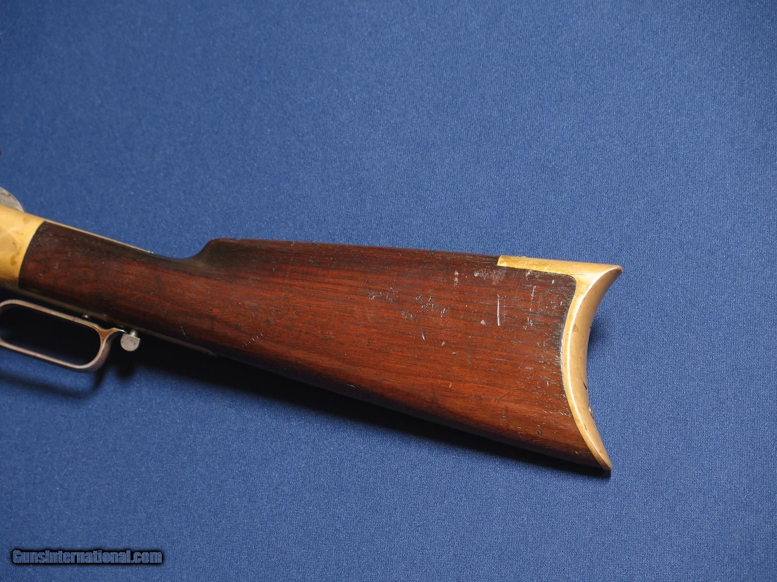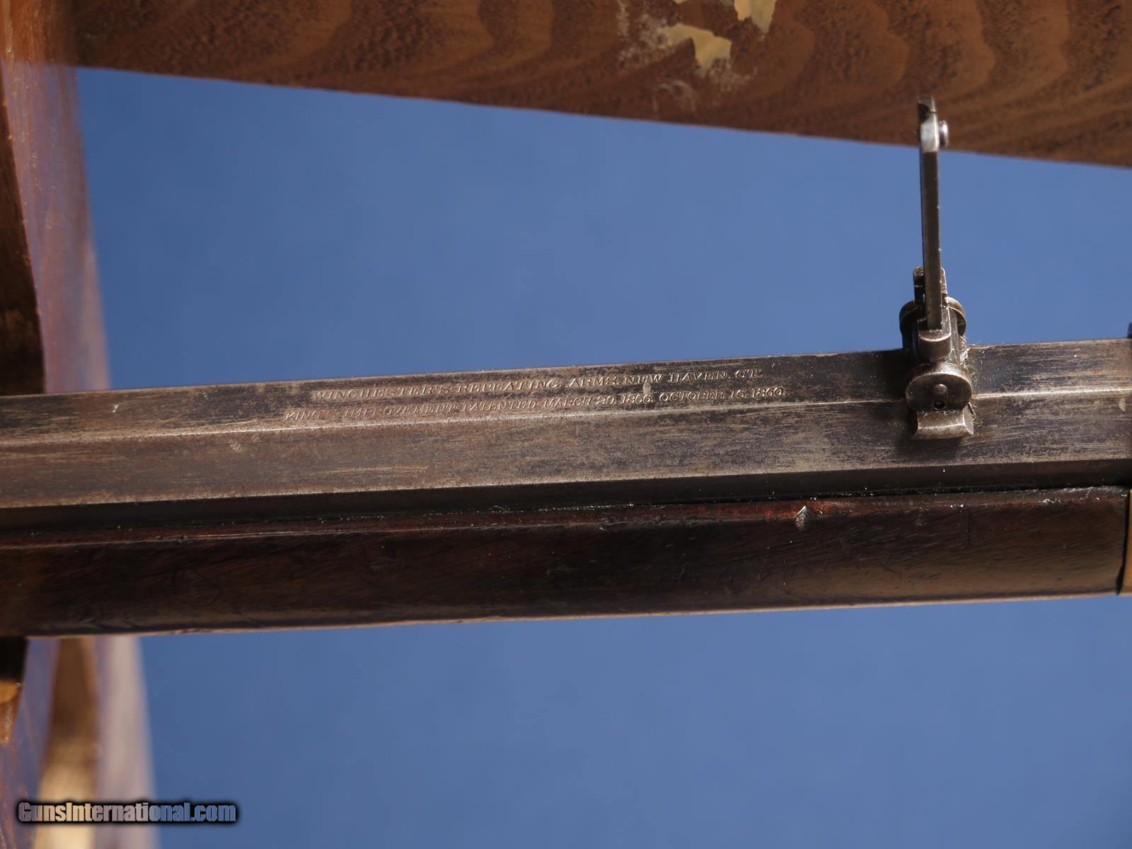 Description: Winchester 1866 44 RF Rifle. 24 inch barrel. SN 26,5XX. Front sight replaced. A lot of barrel blue still left. Small piece of wood missing end of left forearm. Lettering sharp on barrel. Very good bore. SOLD Antique: Yes |