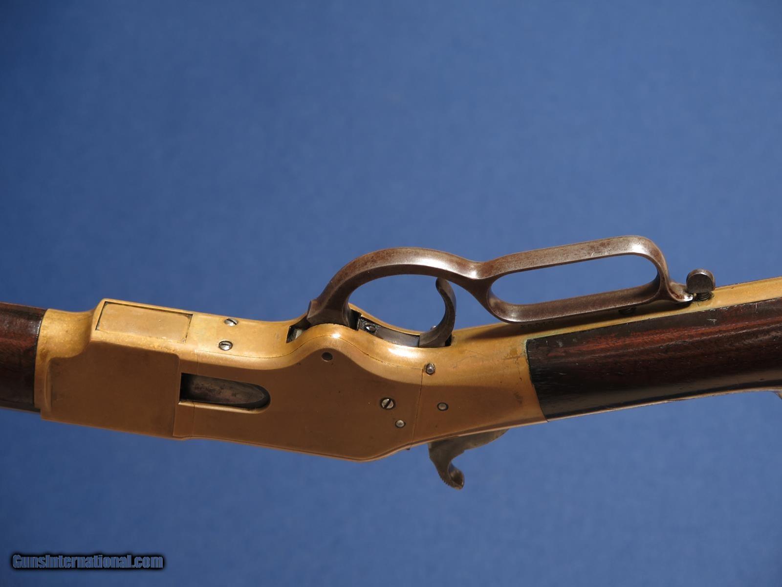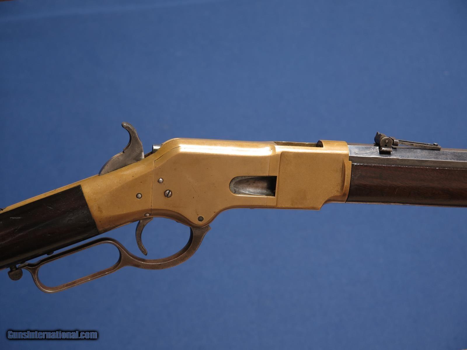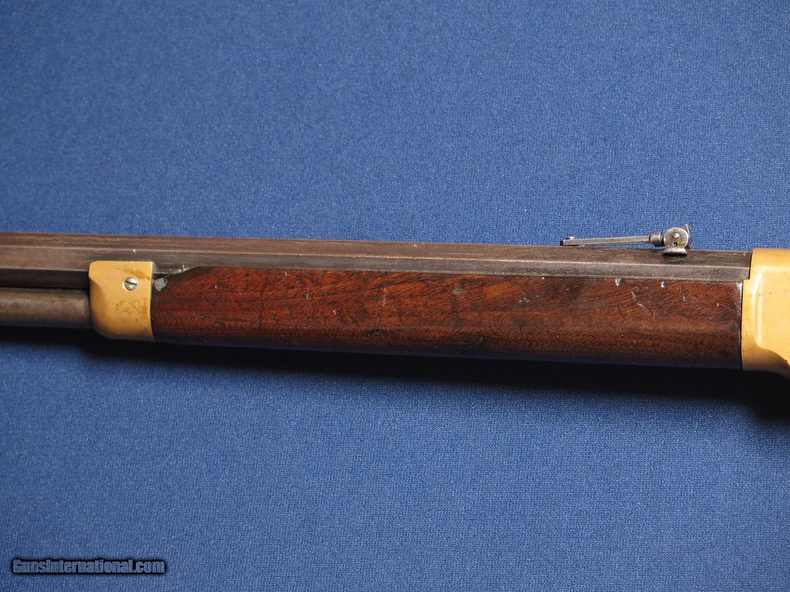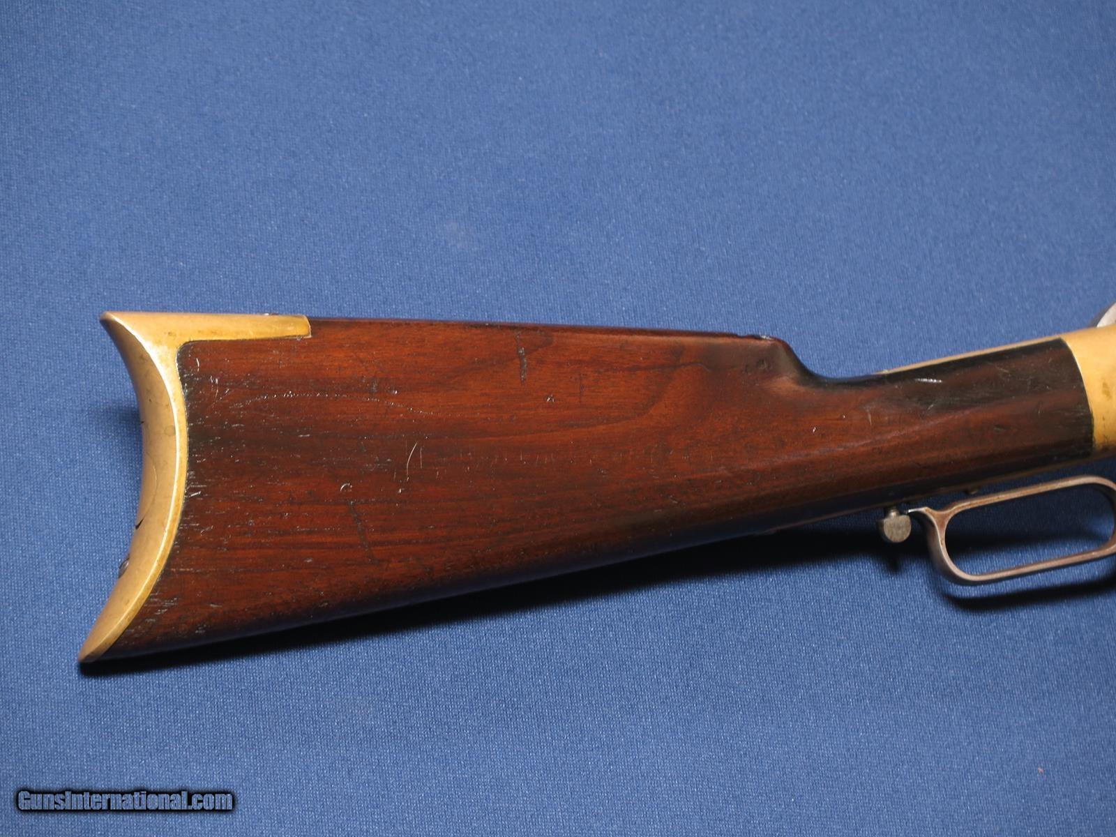 Description: Winchester 1866 44 RF Rifle. 24 inch barrel. SN 26,5XX. Front sight replaced. A lot of barrel blue still left. Small piece of wood missing end of left forearm. Lettering sharp on barrel. Very good bore. SOLD Antique: Yes |