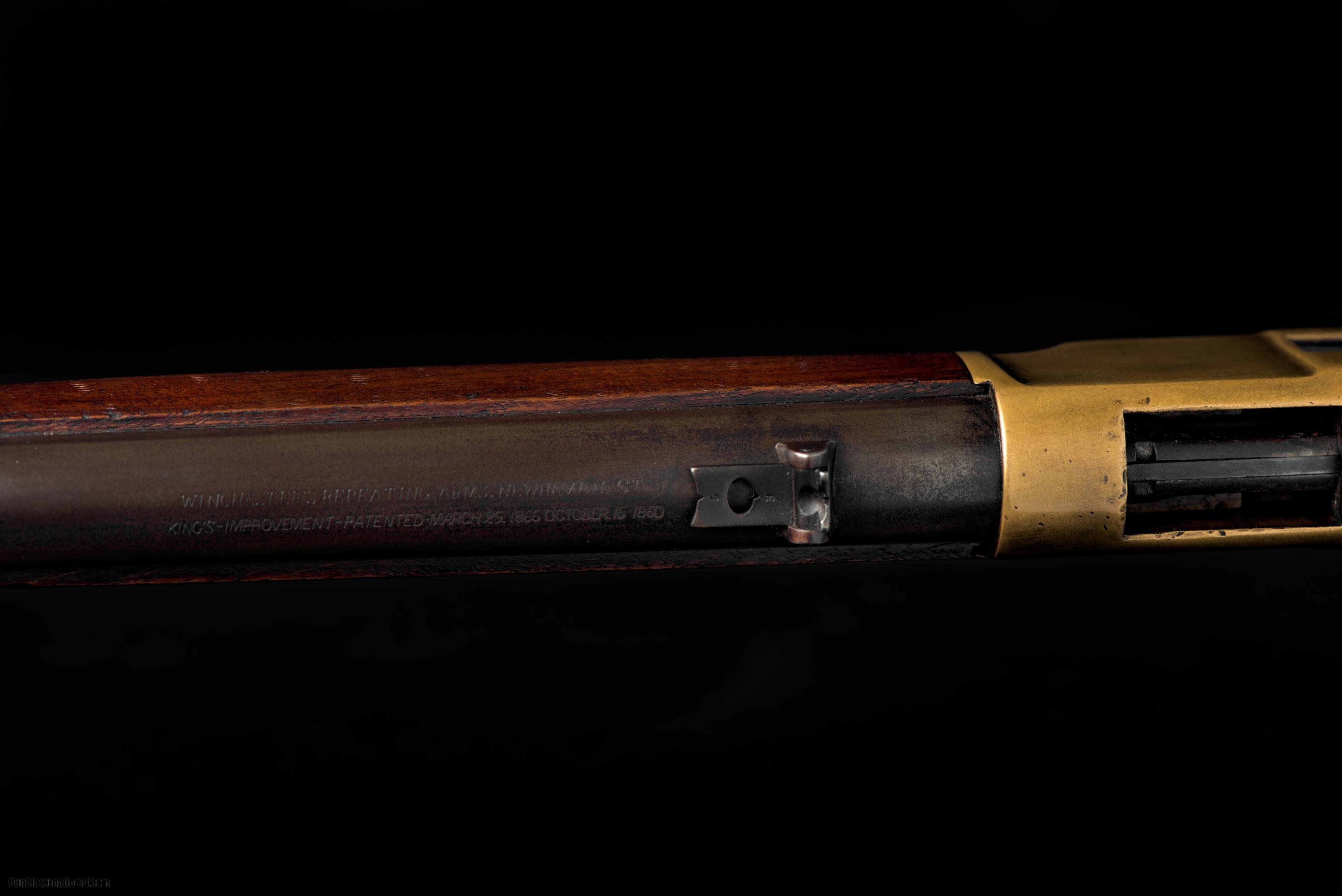 Description: Gun remains, historic, and stunning. Winchester 1866 3rd Model SRC. The rifle was manufactured in 1871, and is one of the finest preserved examples, available for purchase. Round, 20" barrel, full length magazine, front sight is integral with barrel band, and early carbine flip-up sight. The stocks are original, with crescent buttplate, and retain a high degree of original oil finish. Receiver has sharp edges with a dark patina. Left side of receiver has rack number "76" stamped. The barrel, magazine, and loading gate retain 90% original blue, with some areas of light scratches. Bore is bright, with strong rifling. Screws are in excellent condition. All numbers match on this rifle. As good as it gets! SOLD Manufacturer: Winchester Model: 1866 3rd Model Serial Number: 778** Caliber Info: 44 Condition: Excellent Metal Condition: Excellent Wood Condition: Excellent Bore Condition: Excellent LOP: 13 5/8 |