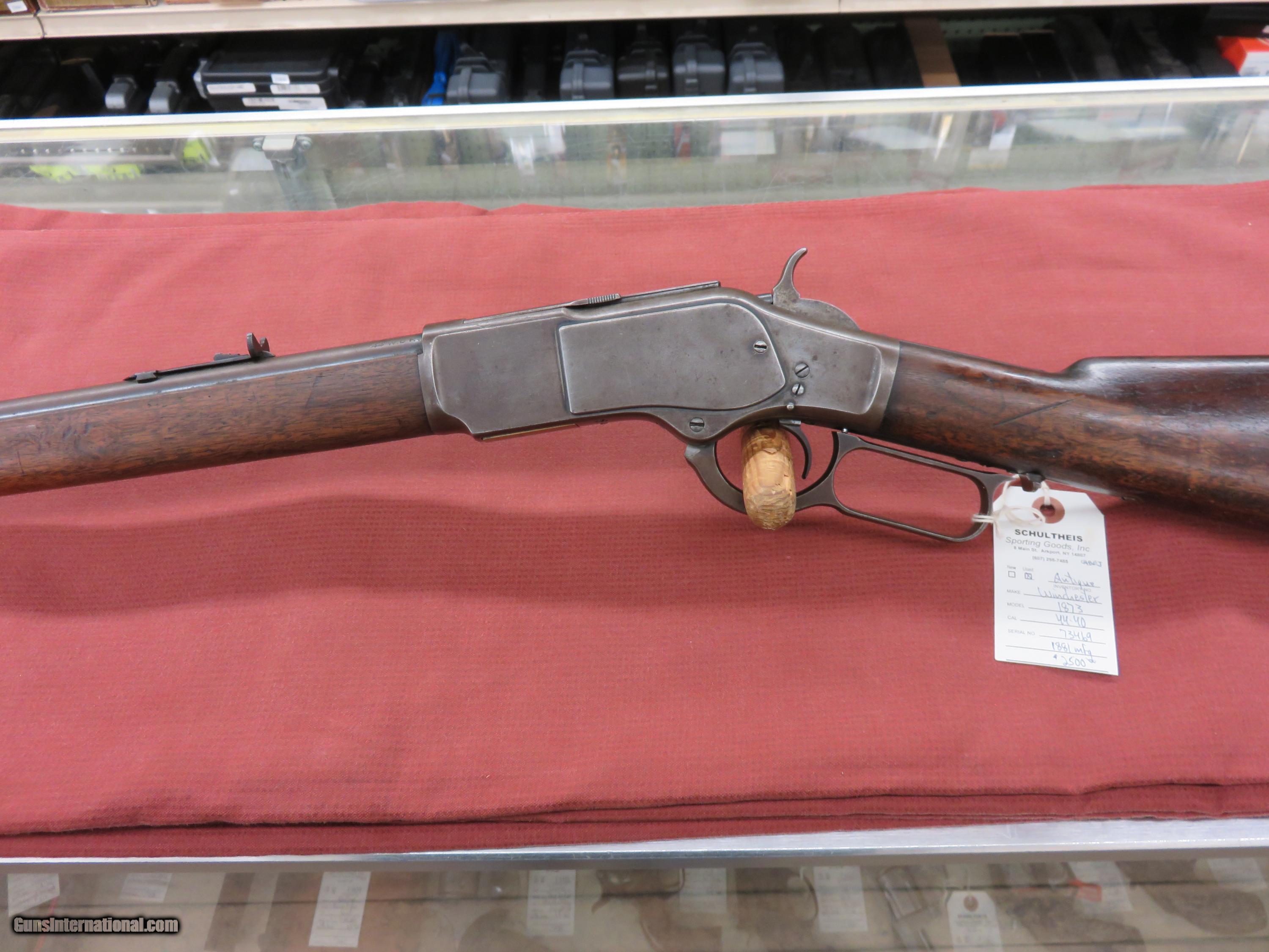 Description: Winchester 1873 Rifle, 2nd Model, 44-40, #73XXX, 1881 mfg., 24" round barrel, full magazine, crescent buttplate, overall finish is a gray-brown patina with no rust, excellent bore, clean tight action, original wood varnish, clean screwheads. SOLD Antique: Yes |