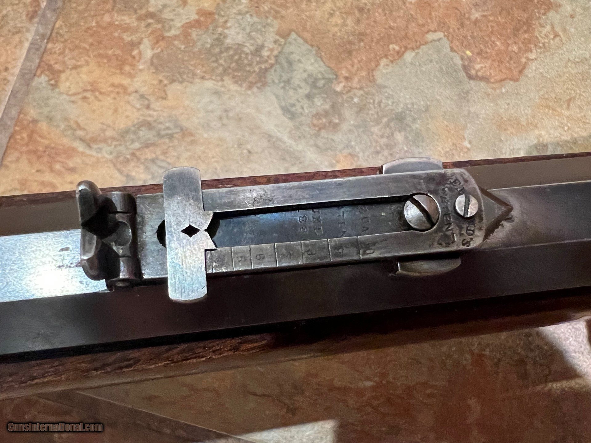 Description: This is a real nice rifle with a 28 inch octagon barrel. It has a bright bore and no cracks in the wood anywhere. It has sling swivels, although they don't letter with the gun, It has Freund More Light sights on it. The sights are worth over $1000.00 alone. It is a nice example of an early 1876 big bore 50 caliber...$15,999.00 SOLD Antique: Yes |