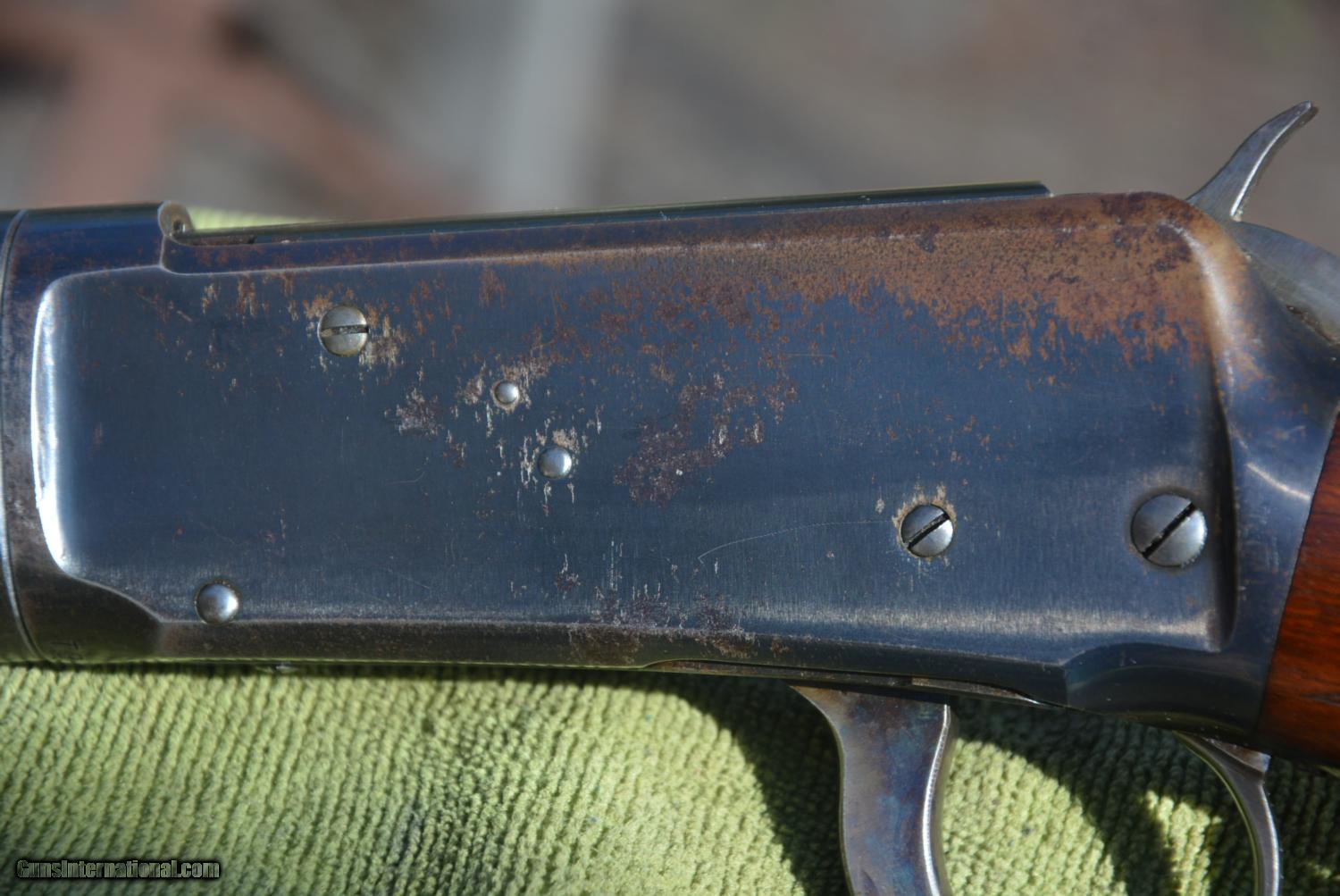 Description: The action is crisp and snappy on this beautiful winchester 1894 delux checkered pistol grip take down. the wood show no cracks or chips has that beautiful winchester deep red smooth grain. the finish retains 95& original blue on barrel and take down magazine with marks from handling over the last 120 sone years. Receiver shows 10% flaking on both sides of receiver with the 90% vivid blue the case colors ave vivid both sides of lever with deep irradesent blue hues.Also note very seldom seen is a full length magazine tube barrel length is 22 inches and is the extra light weight version with tappered barrel . the factory letter document the features. this is a 10 feature rifle also has the short forarm at 8 3/4 inches the bore shows very good vivid rifeling and bright shiny all the way to the muzzel. serial number denotes 1898 and can be shipped to your front door...... tis a very disirable short extra light weight rifle.........noo FFL required...note the lyman sight front with ivory bead and lyman tang sight also has a 3 leaf express with platnum inlays......this is a very rare and desirable ppeice in 95% over all condition.......with proof of ID ships to your door SOLD Antique: Yes Manufacturer: winchester Model: 1894 Serial Number: 1221xx Caliber Info: 30wcf Bore: excellent Condition: 98% Metal Condition: very good Wood Condition: very good Bore Condition: excellent Barrels: 24 inch Barrel Type: round Action: lever Triggers: plain Stock Drop: 13 1/2 Fore End: short 8 3/4 inches Butt Pad: rubber LOP: 13 1/2 Finish: varnish Sights: lyman factor Manufacture Date: 1898 Case: case colors |