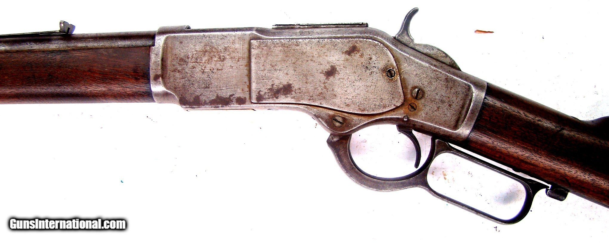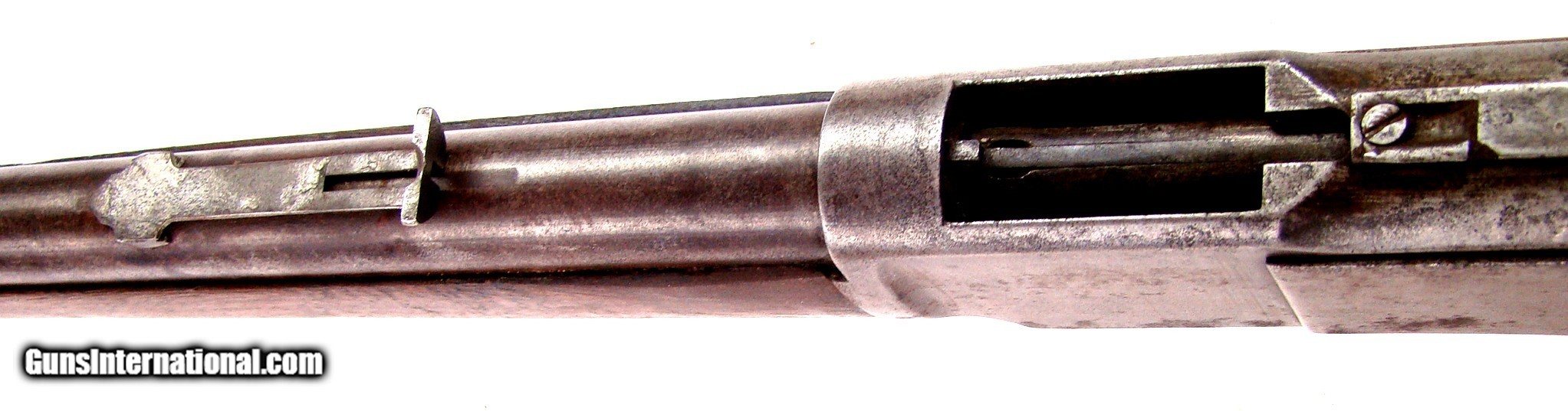 Description: Winchester Model 1873 2nd Model Lever Action Rifle 44-40 cal Bore near Exc real nice bore, Mech Exc works fine. Original wood VG plus nice wood. Has a original 24” Round Barrel with full mag, original sights rear sight is a later style. Has excellent Winchester address and patent date markings. Serial# 37014 Mfg’d 1878. Metal overall has a blue brown patina finish with the receiver having an aged grey patina finish. The dust cover is missing. Very nice early Winchester 1873 rifle Rear Sight elevator included. SOLD Antique: Yes Rifle Caliber: .44-40 Winchester |