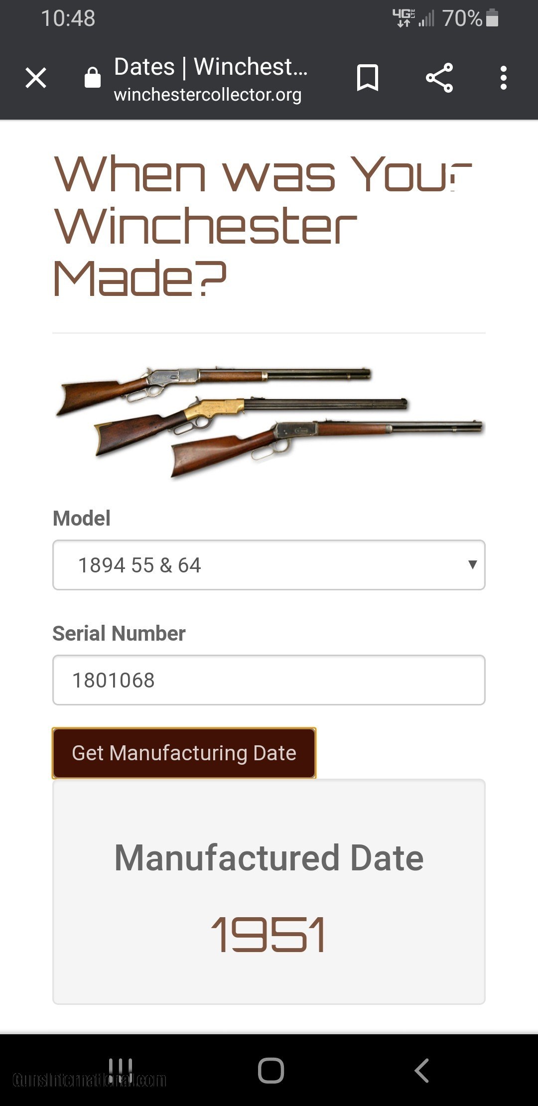 Description: Winchester 1894 32 win 1951. SOLD Curio/Relic: Yes Rifle Caliber: .32 Winchester Self-Loading Manufacturer: Winchester Model: 1894 Serial Number: 1801068 Condition: 90% excellent Metal Condition: 90% Excellent Wood Condition: 90% Excellent Bore Condition: 100% perfect Action: Lever Butt Pad: Winchester steel but plate Weight: 6 lb 8 oz Sights: Iron Manufacture Date: 1951 |