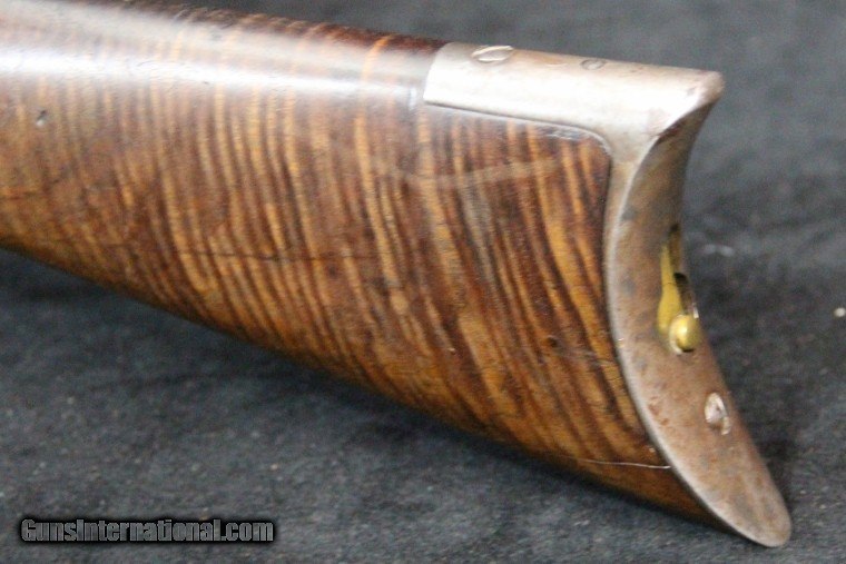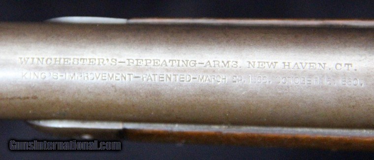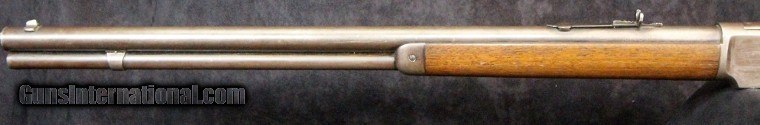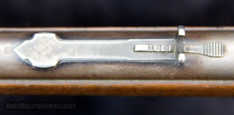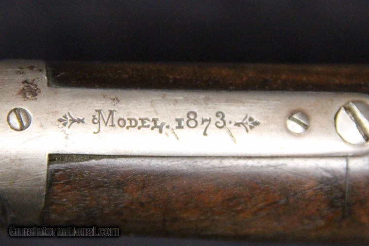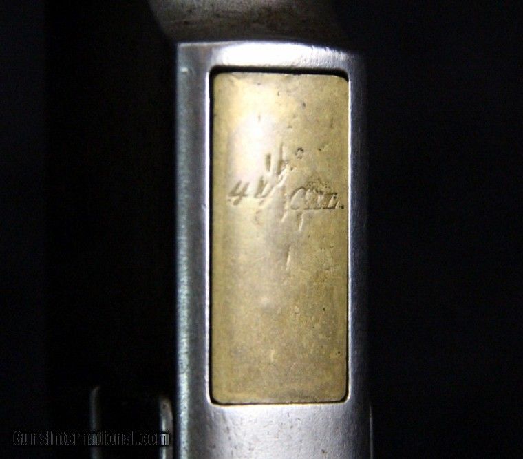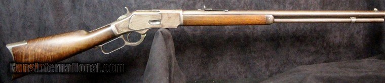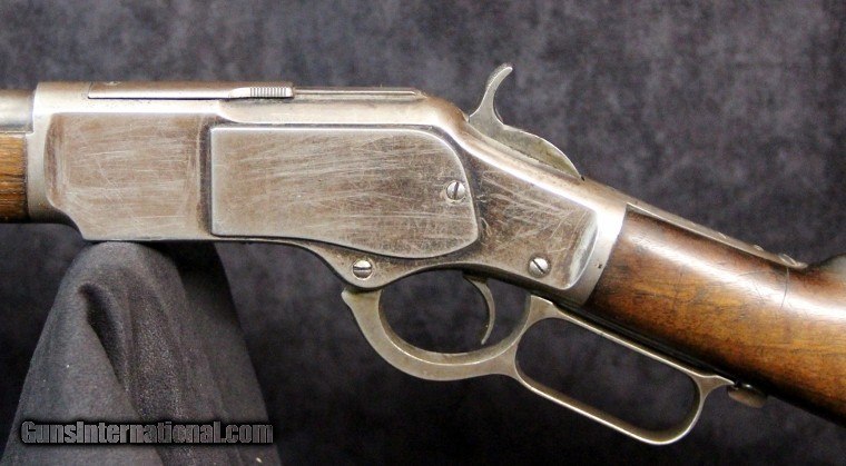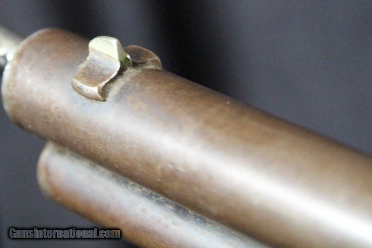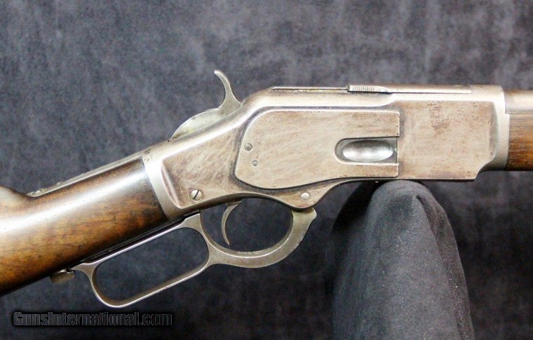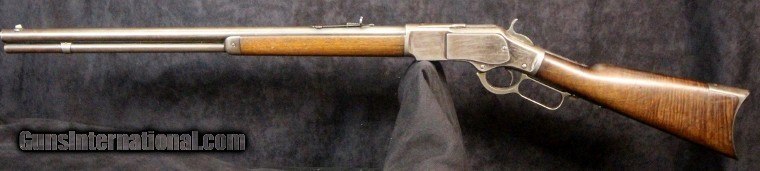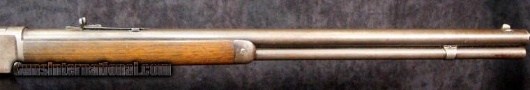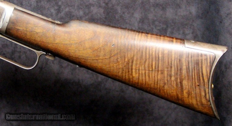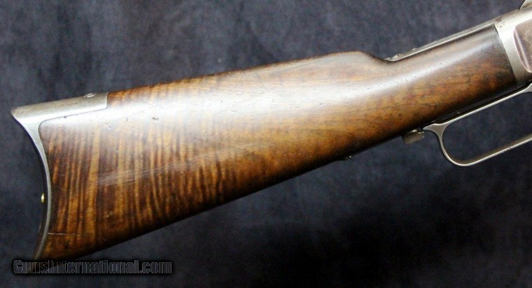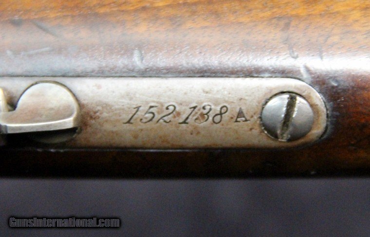 Description: .44wcf, #152138, 24 inch round barrel, blue and case color finish, walnut stock and forearm, original sights, 1884. Condition: very good bore, 70% barrel blue thinning to silver, 10% receiver, no case color showing on hammer or lever, stock has above average figure for a standard rifle, 2 seasoning cracks, excellent forearm, excellent mechanically, excellent marks, no caliber mark on barrel and appears to be a heavier 2nd model barrel. SOLD Antique: Yes |