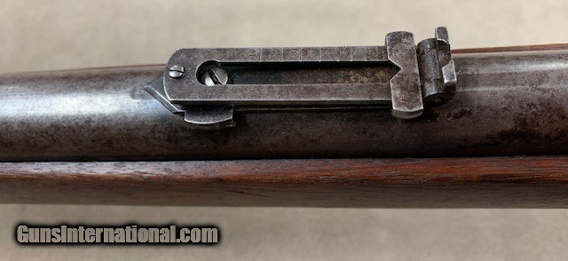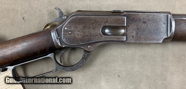 Description: This a totally original model 1876 28 inch round barrel rifle with full length magazine in caliber .45-60 WCF. Rifle retains some original finish but mostly a pleasing patina without pits or problems. In perfect working order including dust cover and all parts original. Stock and forearm are solid and with some original finish but no cracks or problematic areas. Bore is fair to good with strong rifling showing. Sights are original - folding ladder rear and an express front. A very nice representative example of a model 76 rifle manufactured in 1884. SOLD Curio/Relic: Yes Antique: Yes |