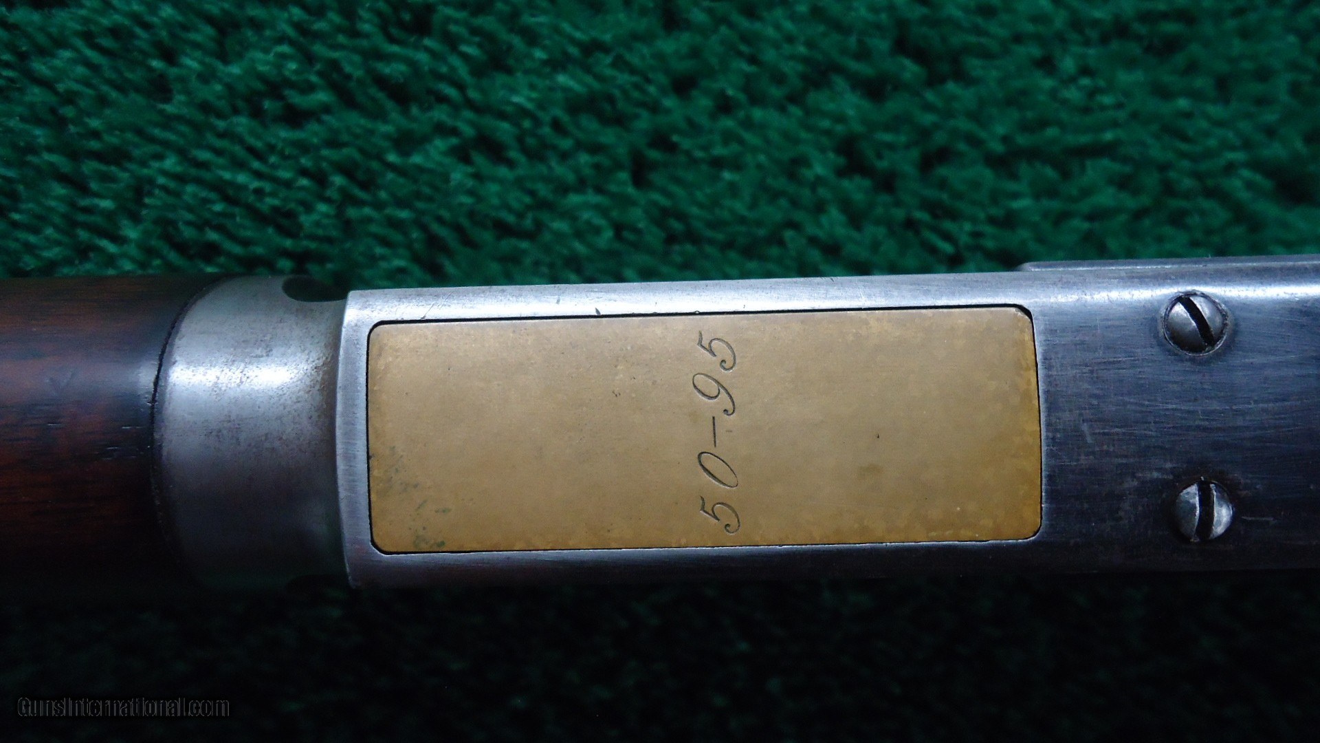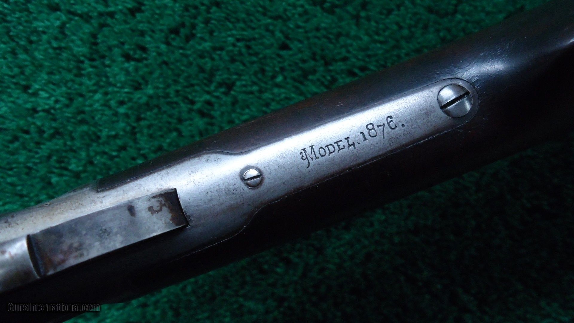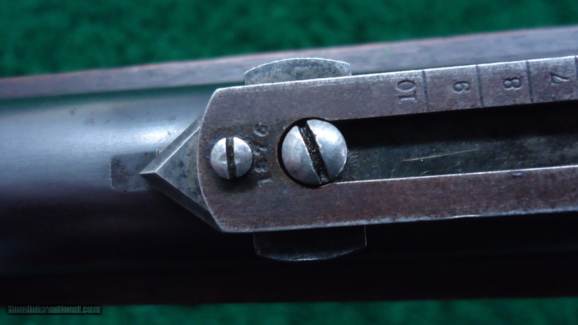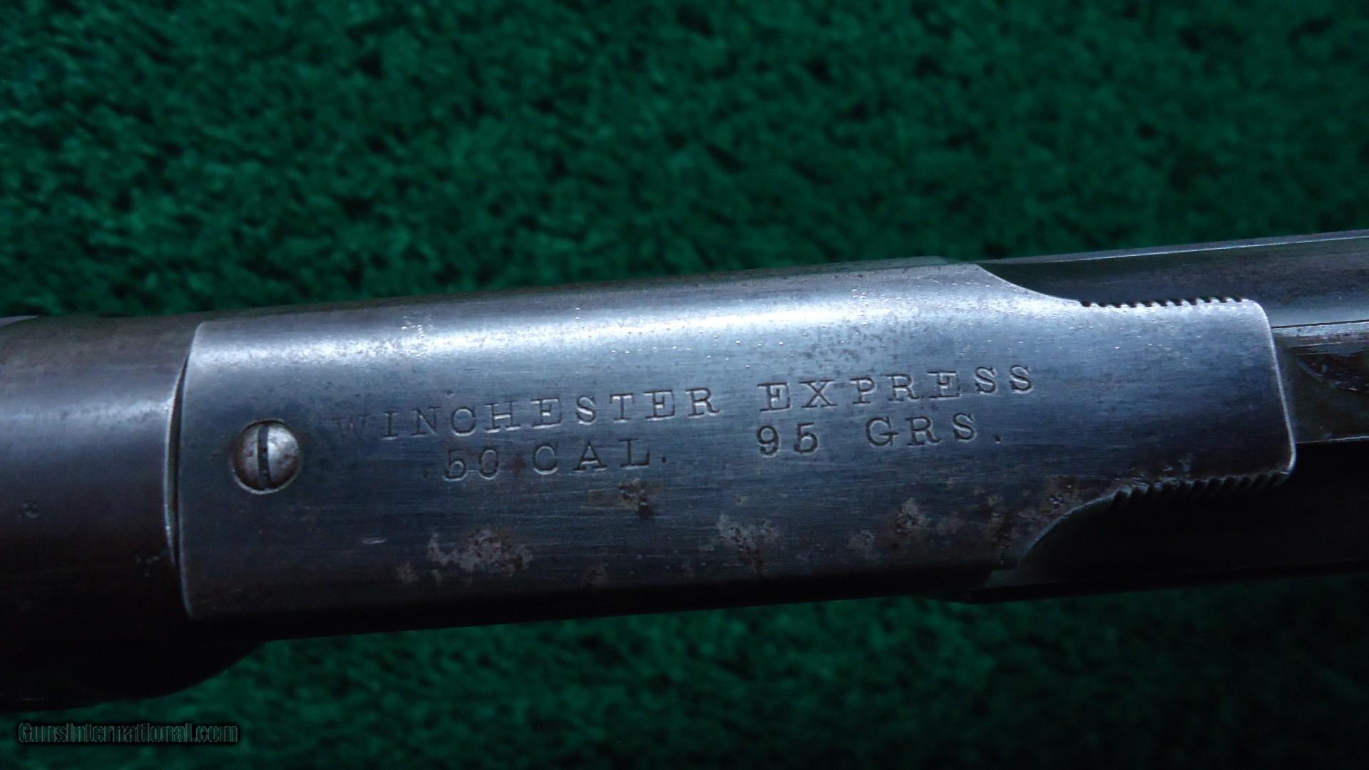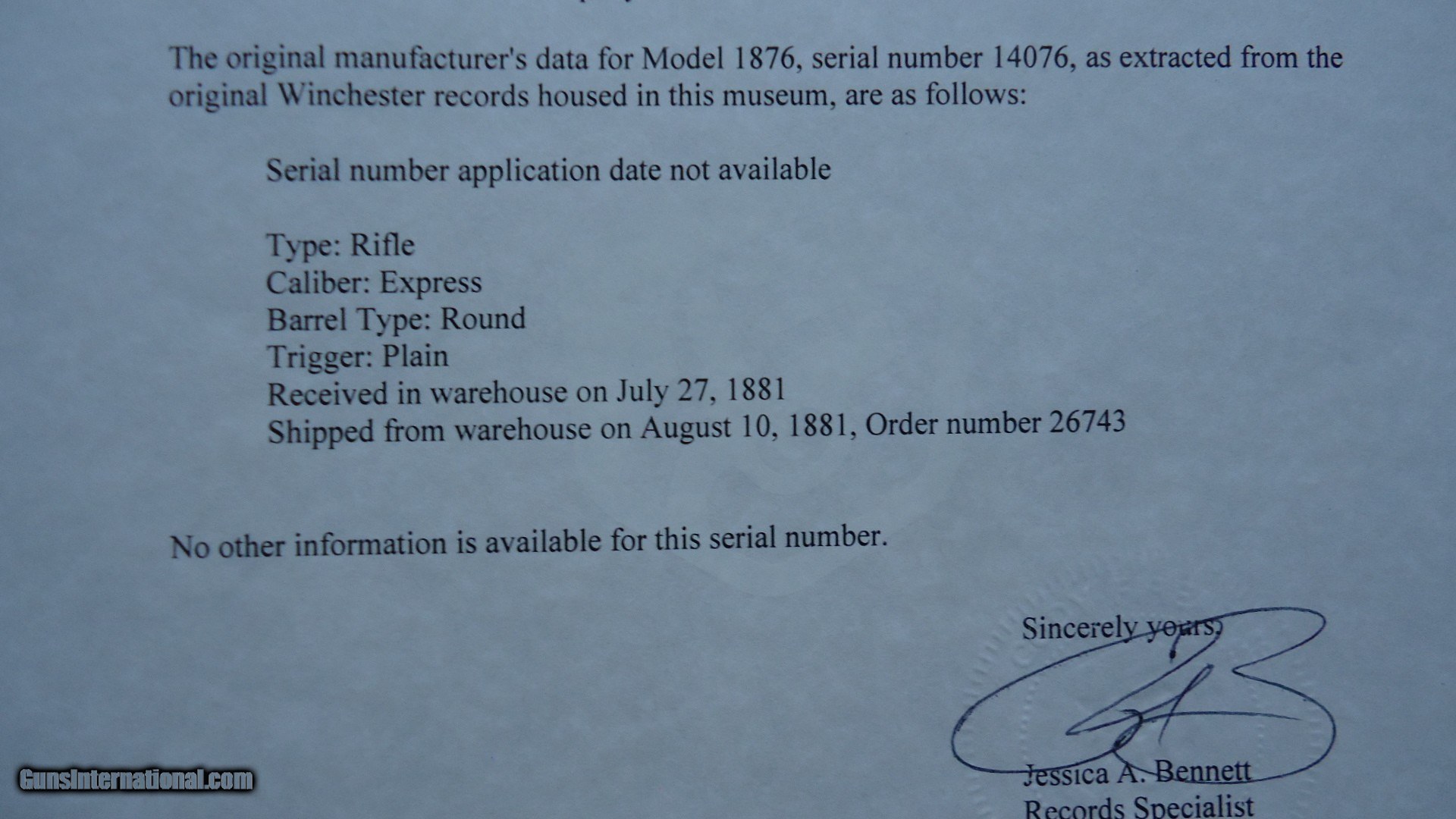 26 inch round barrel chambered in the desirable big 50 caliber with a good bright shiny bore. Most all original barrel blue remains with a few small spots of scattered oxidation. Full length mag and forend cap also have most blue. Original sights include a German silver blade front and an "1876" marked flip up ladder rear. Receiver has thinning blue with some small scratches as well as a few small spots of light oxidation on the right sideplate. Possibly from poor storage long ago. Original "Winchester Express 50 Cal. 95 Grs." marked tight fitting dust cover. Traces of case color on the hammer and lever. Rifle buttplate is a plum/brown patina. Nice crisp functioning action. Walnut stocks are in very good condition. Only 873 26 inch round barrel Express rifles were built. Most of the ones you come across have a shotgun butt and a half length mag with proof marks showing they were shipped to Africa or India. This one does not have those. Factory letter confirms configuration. Not a bad example of a desirable 50 Express Winchester rifle from 1881.