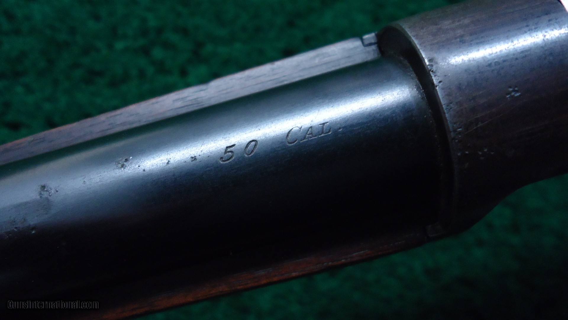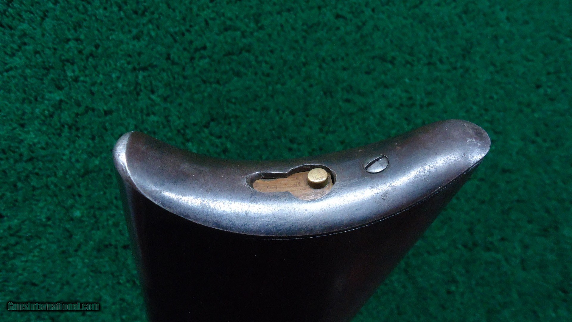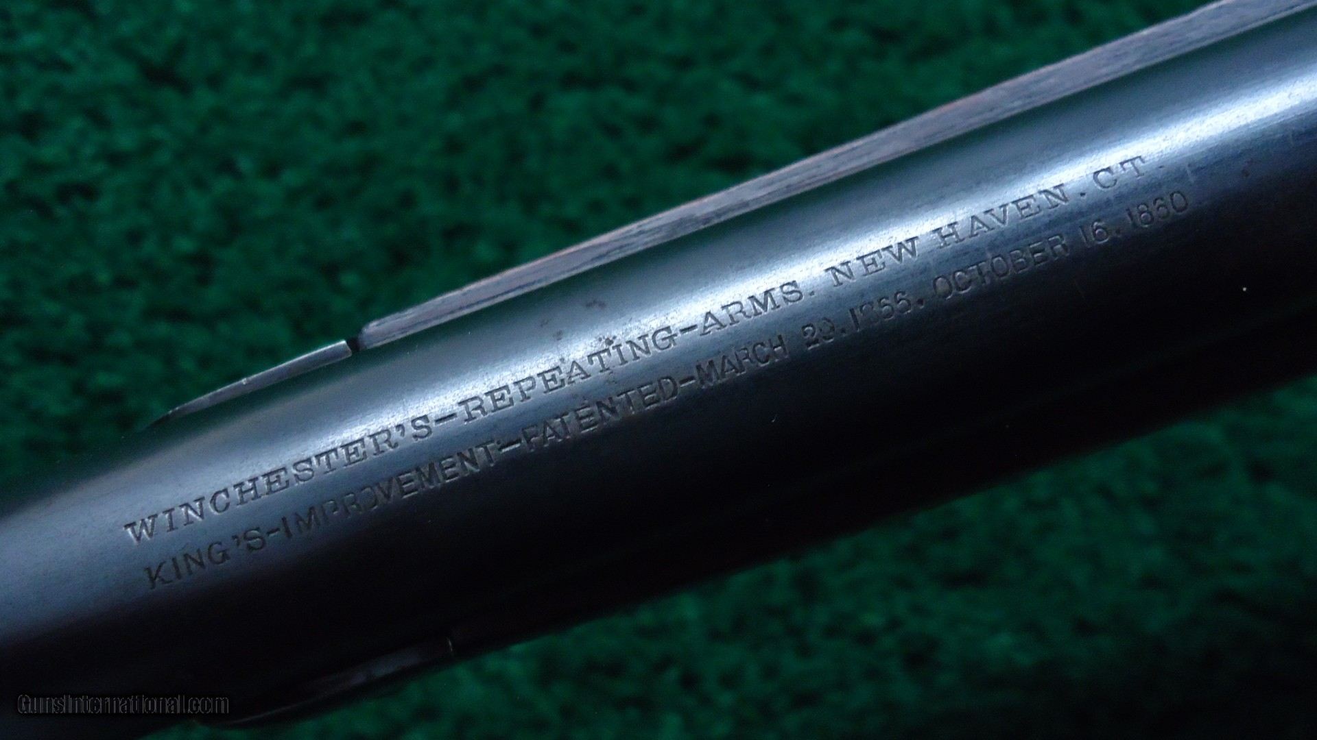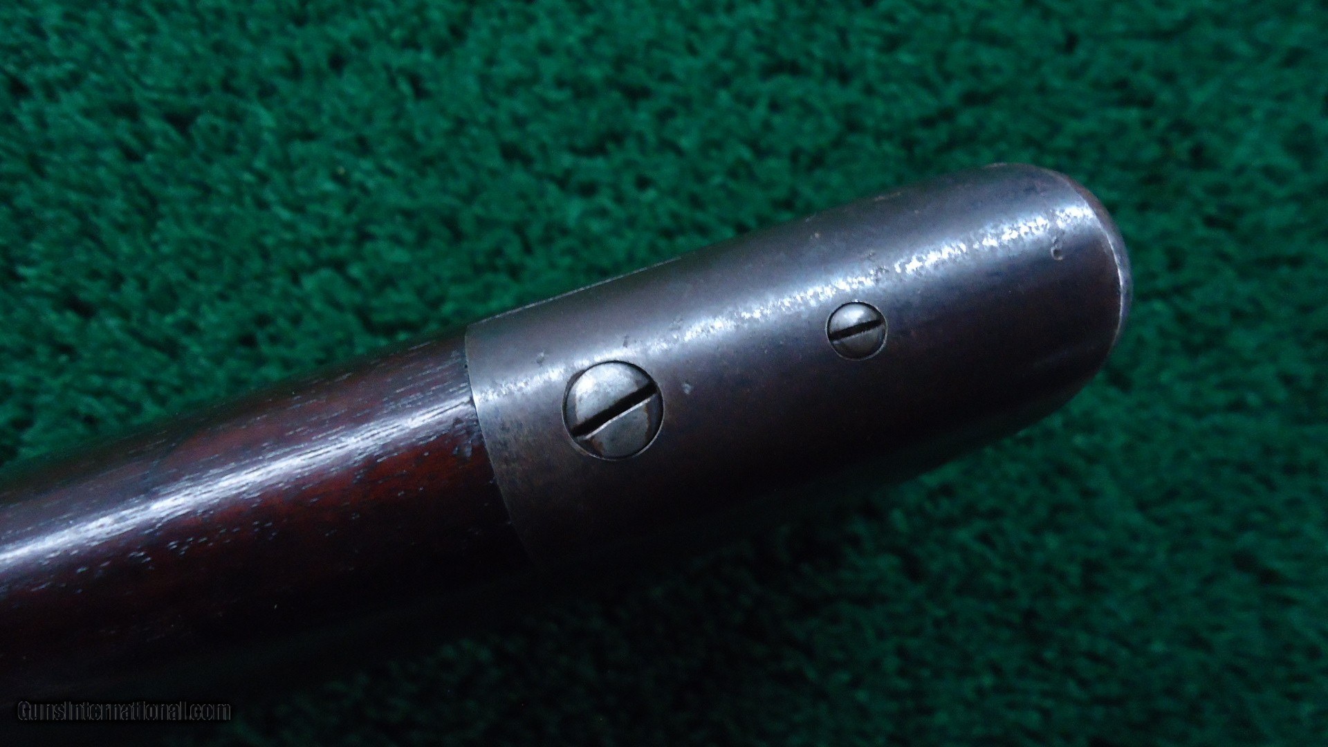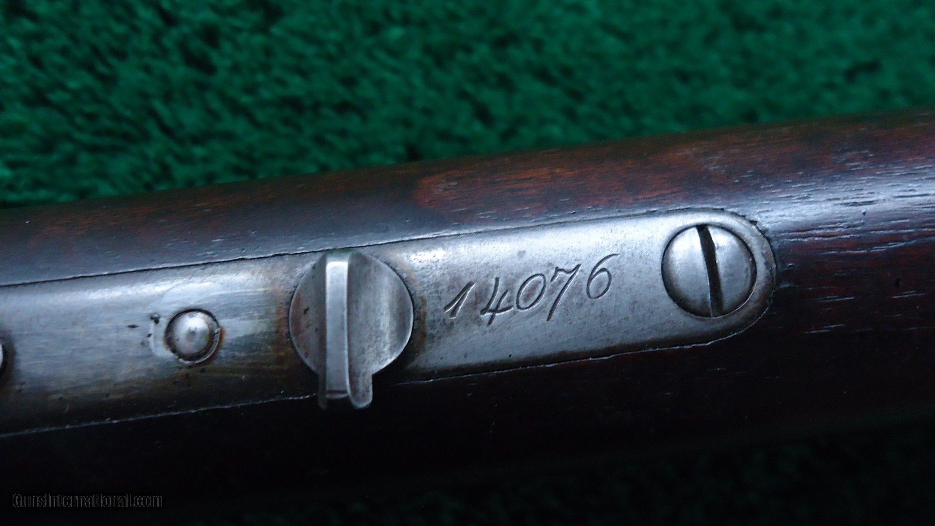 26 inch round barrel chambered in the desirable big 50 caliber with a good bright shiny bore. Most all original barrel blue remains with a few small spots of scattered oxidation. Full length mag and forend cap also have most blue. Original sights include a German silver blade front and an "1876" marked flip up ladder rear. Receiver has thinning blue with some small scratches as well as a few small spots of light oxidation on the right sideplate. Possibly from poor storage long ago. Original "Winchester Express 50 Cal. 95 Grs." marked tight fitting dust cover. Traces of case color on the hammer and lever. Rifle buttplate is a plum/brown patina. Nice crisp functioning action. Walnut stocks are in very good condition. Only 873 26 inch round barrel Express rifles were built. Most of the ones you come across have a shotgun butt and a half length mag with proof marks showing they were shipped to Africa or India. This one does not have those. Factory letter confirms configuration. Not a bad example of a desirable 50 Express Winchester rifle from 1881.
