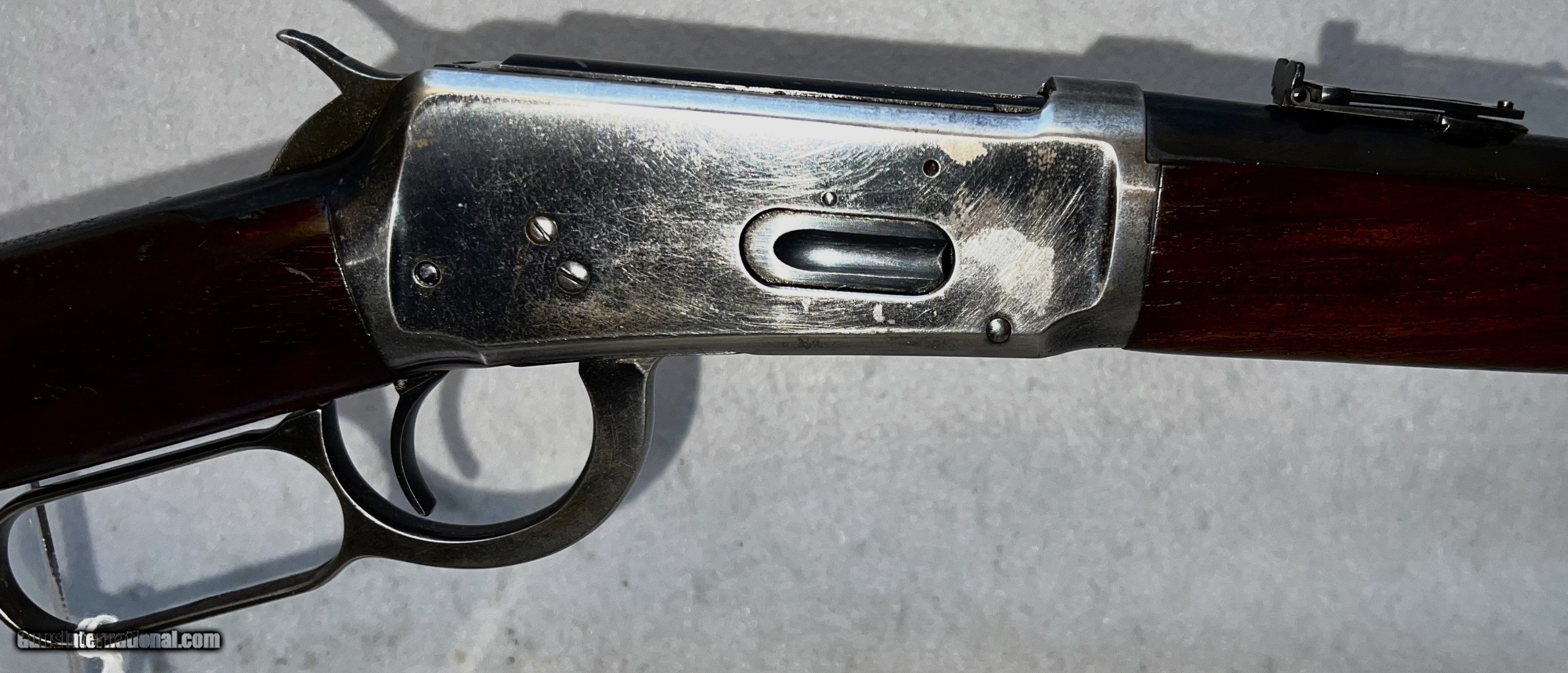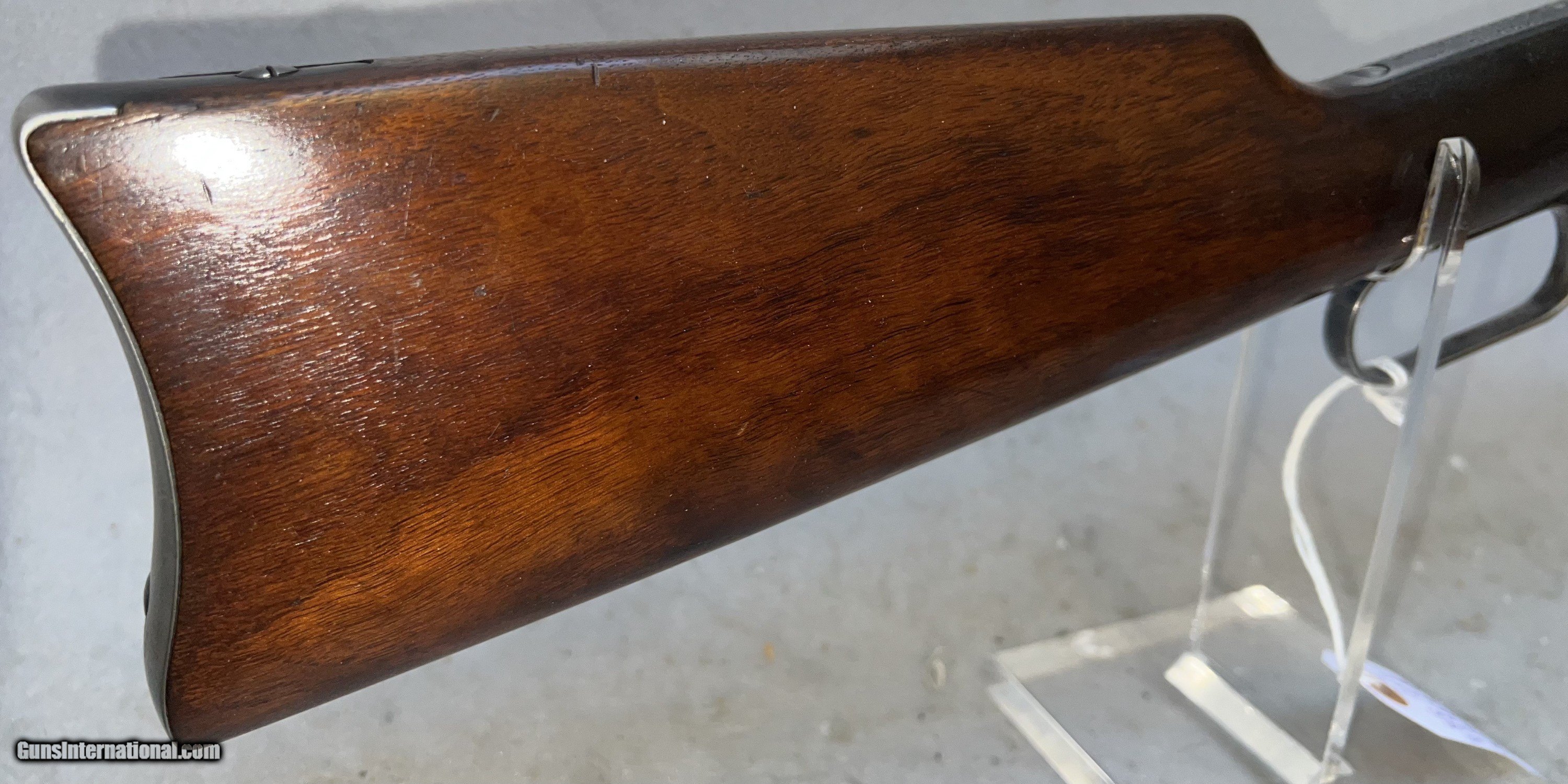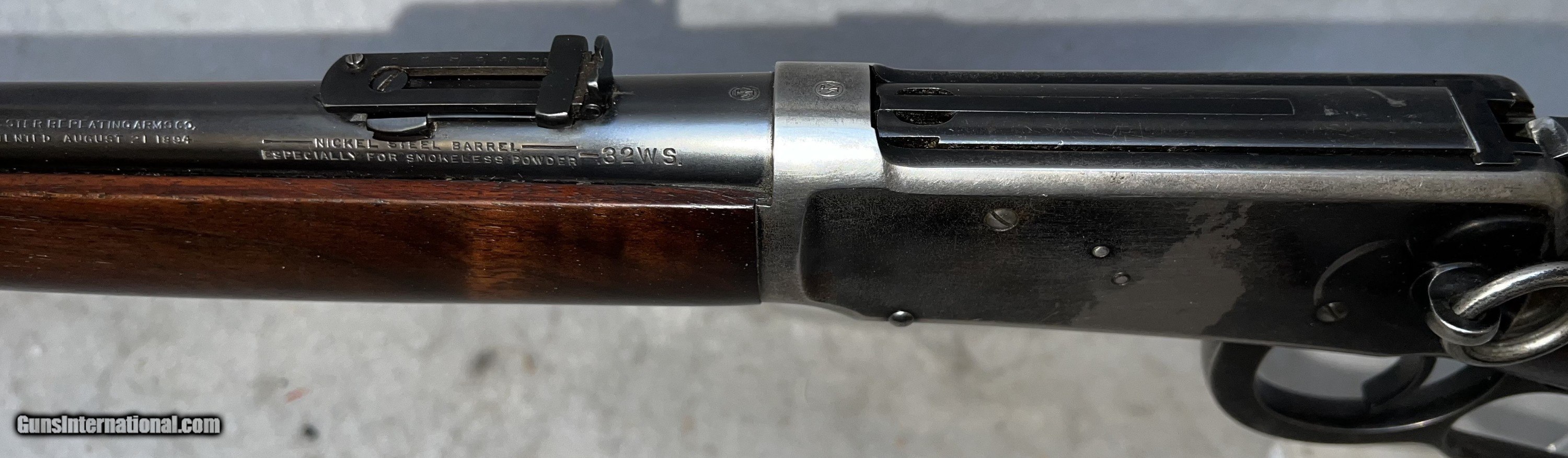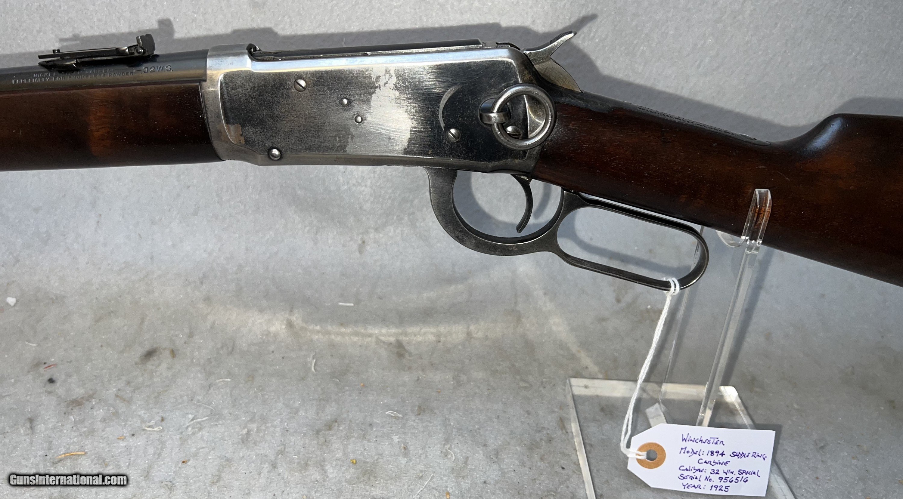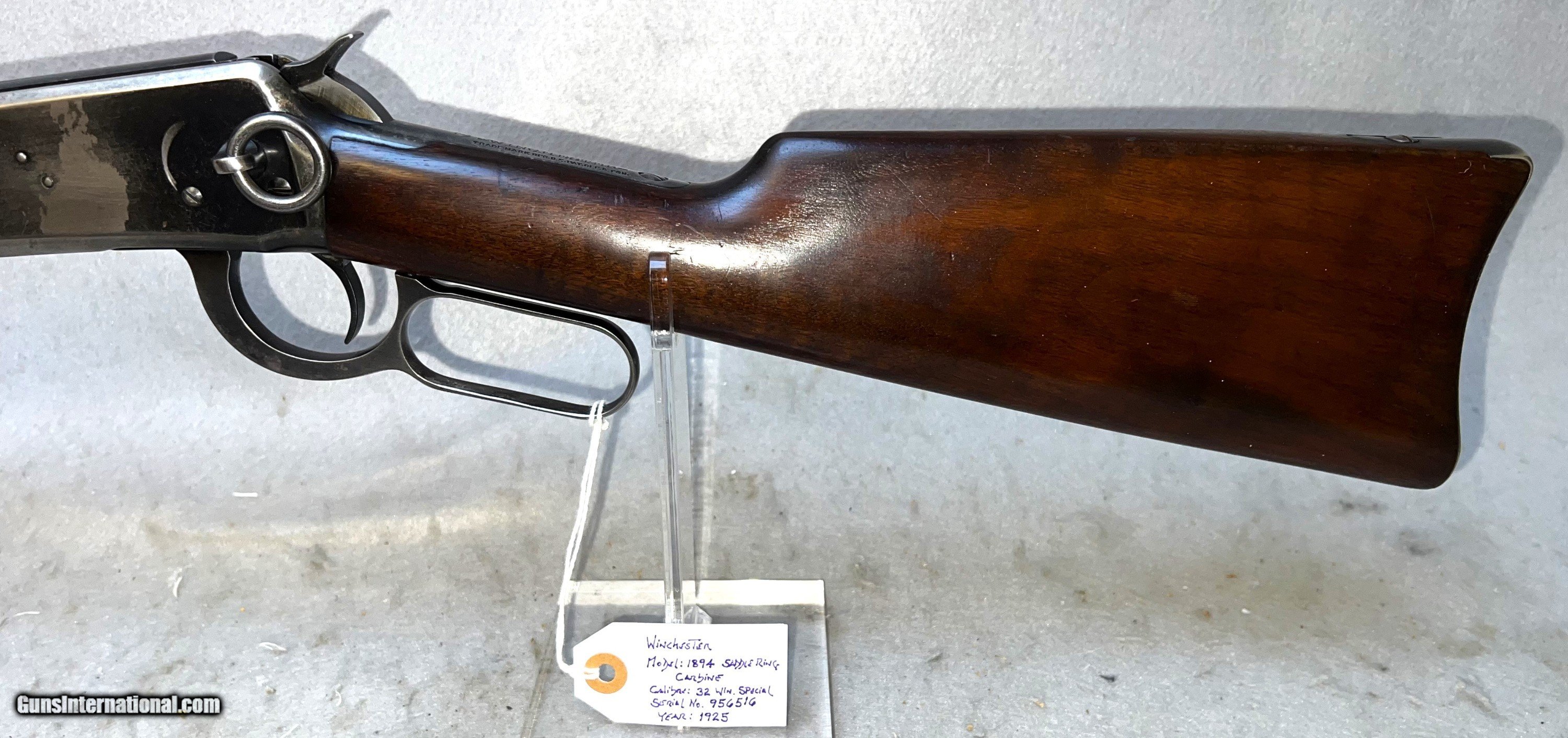 Description: Winchester 1894 Saddle ring carbine .32 WS - This is a very good example of the venerable 1894 carbine manufactured in 1925. It has the 20" nickel steel barell and magazine tube. It has an adjustable leaf rear series 44 sight and a Marble front sight with white bead. The receiver shows typical bluing wear as this is where most people would grap the gun. The bluing on the barell and magazine tube is excellent with a few handling scratches.The walnut stock and forearm are excellent with no deep scratches or marks. SOLD Rifle Caliber: .32 Winchester Special Manufacturer: Winchester Model: 1894 Serial Number: 956516 Barrel Length: 20 Condition: Excellent Metal Condition: Very good Wood Condition: Excellent with typical handling marks Bore Condition: Clear and shiny Action: lever Stock: walnut Manufacture Date: 1925 |