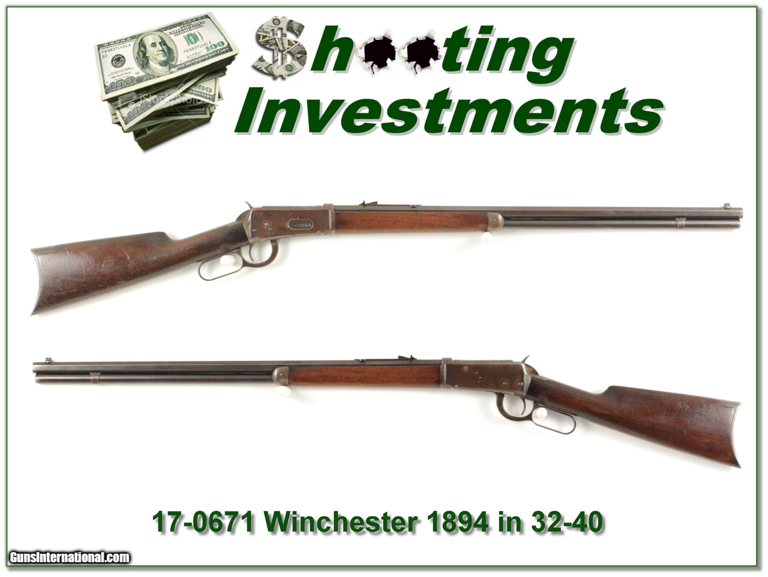Description: Collectors, this is an 1898 made Winchester 1894 in 32-40. It is in very good all-original condition. It has a 24in octagonal barrel. I am selling this one on consignment and as such, lay-a-way can’t be used. It does of course have the standard 3-day inspection. Shipping and insurance is $49 or $19 more if you want it shipped in a new Plano hard case. Please email me with any questions or larger pictures. (Consign your quality firearms with Shooting Investments for only 10%! Let me know if you have any you would like to sell!) 17-0671 Payment: Payment is by Money Order, Cashiers Check or Personal Check. I can now also accept MasterCard and Visa with a 3% convenience fee. PayPal can be used for some items but never firearms. Please let us know if you would like to pay via PayPal. Shipping: The shipping charge will be listed in each description. It is $39 for most long guns and $29 for most handguns. Some heavy guns or those insured for over $2000 will be higher. Shipments to Alaska and Hawaii are higher because air shipment is required. Most firearms are shipped on Tuesday and Thursday and usually in 5 days of receipt of payment. We package all shipments carefully and insure them. For long guns you can purchase a new Plano case for $19. They now cost us $22 when buying 100 at a time. Optics are shipped Priority Mail and most other non-firearm shipments are shipped First Class. Returns: Our return policy is simple. If for any reason you are not pleased with your purchase, you may return your item for a full refund of purchase price. Ammunition cannot be returned. It is important to us that you are happy. Guns cannot be fired or dissembled before returning them and they must be returned in the same condition as received. Notification of a return must occur with-in 3 days of receipt at your dealer. Shipping, convenience and dealer fees are not refundable and are the responsibility of the buyer. Lay-a-way: If needed, we offer a 60 day lay-a-way option on most firearms. It is 1/3 now, 1/3 in 30 days and 1/3 in 60 days. Lay-a-way firearm sales are final and if not completed the first payment cannot be returned. Consigning your firearms with Shooting Investments: We will help you get top dollar for your firearms. While most local guns shops charge 20% or more, our fee is only 12% with a minimum of $75. At your local gun shop it might take months to sell. Selling on-line provides instant access to thousands of interested buyers. You won’t find any other on-line dealer willing to sell your firearms for only 12% or listing every gun on 3 separate s. Selling through an House typically costs the seller 15% and the buyer an addition 15% (so 30%) and you have to wait several months to sell and longer to receive funds. If properly priced, we will sell your firearms in a few weeks. Send us an email or give us a call and we’ll explain how easy it is for you to get top dollar. Trading: Trading for use is really just buying your gun to re-sell. If you have a gun you want to trade, please email a picture and we will let you know what we can give or it. You will always get more if we sell it for you on consignment. Help for California Buyers: We are happy to ship to California. It is the buyer’s responsibility to make sure any item you buy is legal in your state. We are also happy to help with your purchase of a firearm from someone other than us. If you see a gun you would like to buy but the seller can’t or won’t ship to California they can ship to use and we’ll then ship it to your California dealer. The cost for this service is only $30 + shipping. Let us know if we can help! SOLD |