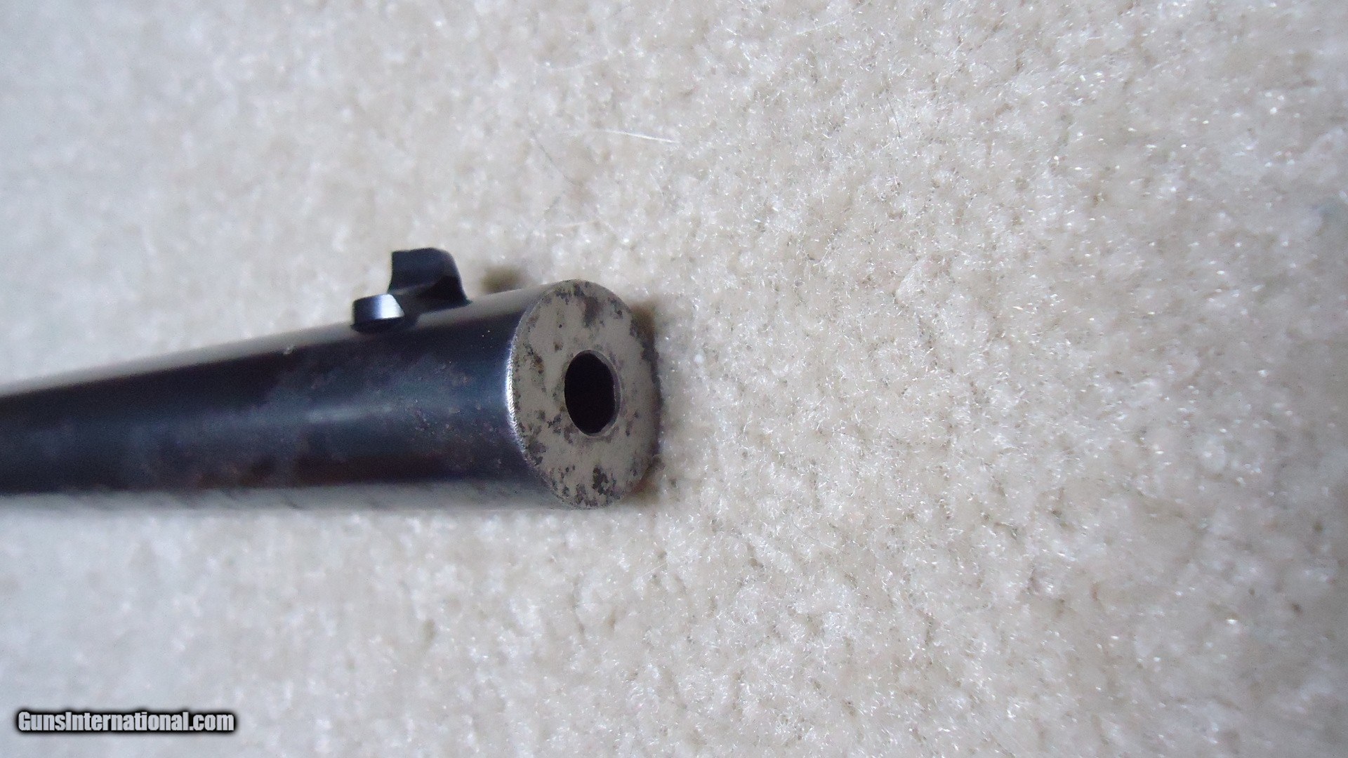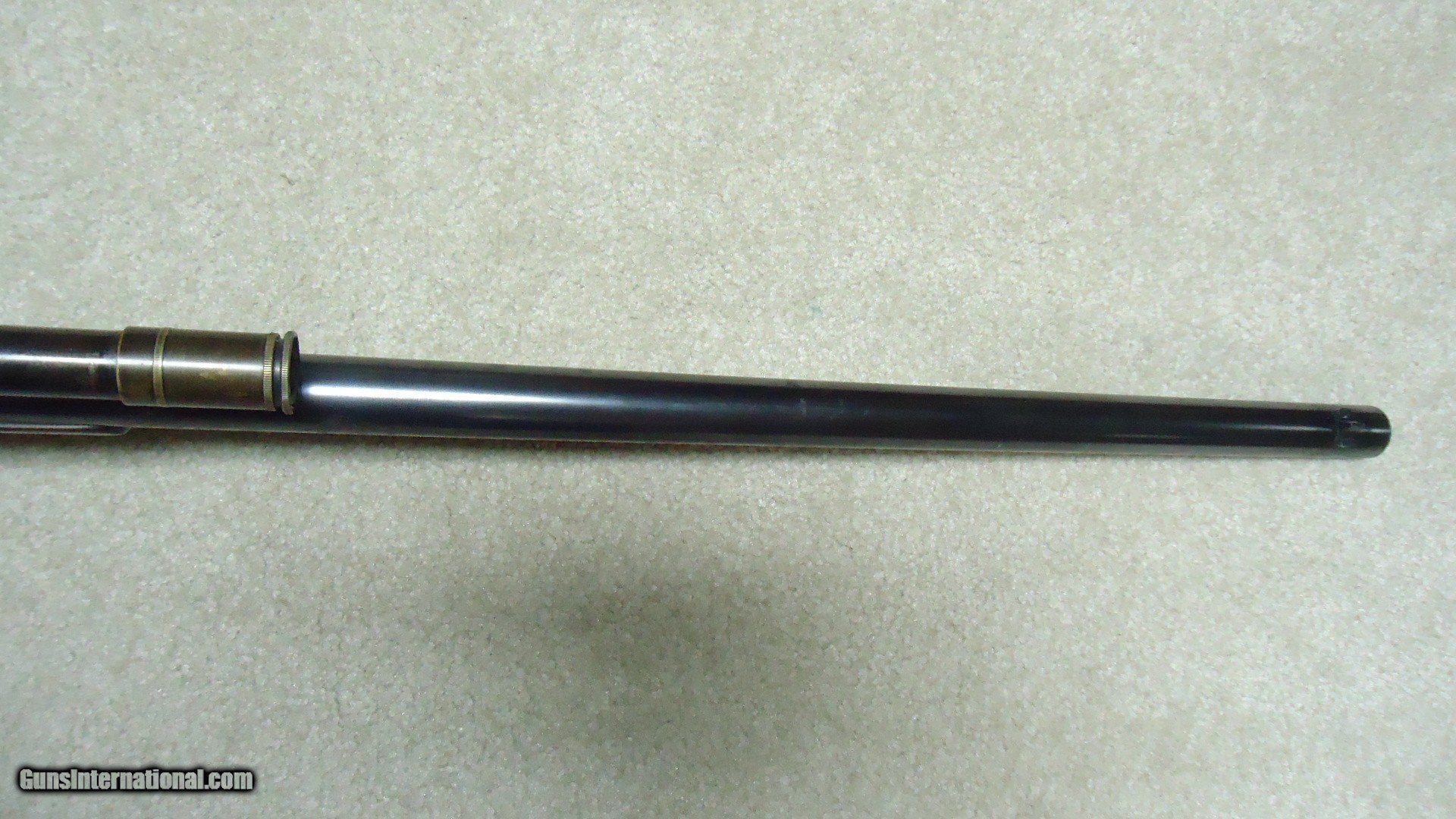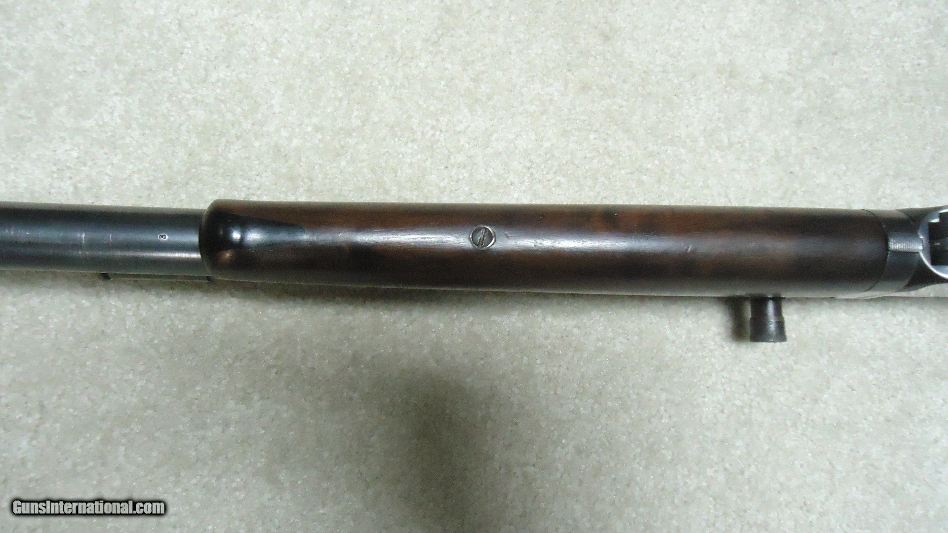 Description: VERY UNUSUAL 1885 TAKEDOWN HIGHWALL RIFLE IN .30-40 KRAG (.30 U.S.) CALIBER, CODY CALL-IN SHEET, #108XXX, MADE 1909. This one is also fitted with a period 18" black enameled brass scope. the scope appears unmarked except for "50 ft" and "200 YDS and Over" "X-8" stampings behind the front adjustable lens. It has a post reticle and has fair clarity- needs a good cleaning. The Cody info. lists this one as having a No.3 weight 30" round barrel, takedown and plain trigger and 30 Gov't caliber. It further states that the serial number was applied October 1, 1909. This rifle was received in the warehouse June 6, 1910 and not shipped until January 27, 1912! It has a fully functioning single set trigger that may have been factory fitted and just not mentioned in the records. It has a blade front sight and a filler in the rear sight dovetail. Stock and forend are excellent and show light handling only. The forend has the correct ebony wedge inlay in the top. Fine barrel blue shows some light scuffs and has sharp makings. The receive similarly show fine blue with light wear/scuffs. Still some case color on the upper portion of the lever, tight action and excellent bore. A really interesting and nice condition smokeless era Takedown Highwall! SOLD Curio/Relic: Yes Rifle Caliber: .30-40 Krag Manufacturer: Winchester Model: 1885 HIGHWALL T/D Serial Number: 108XXX Barrel Length: 30 Condition: FINE+ Bore Condition: EXCELLENT |