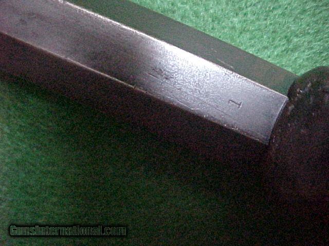 Description: Serial # 46xxx, circa 1890. A survivor. A nice unmolested example of an early Winchester H/W in 38/40 caliber. A chambering usually found in a low wall configured rifle. The receiver shows some silvered CC with the balance a gray/ brown. Action is tight, and mechanically excellent. The oct. 28” number 1 weight barrel retains 80% blue turning plum, original barrel sights and has a shiny, very shootable bore with VG rifling with some minor spots of corrosion. The standard straight grip, crescent buttplate stock & forend is solid with good color, nice grain and NO cracks with some small to moderate hunting blemishes. Screws and wood to metal fit are excellent SOLD Antique: Yes |