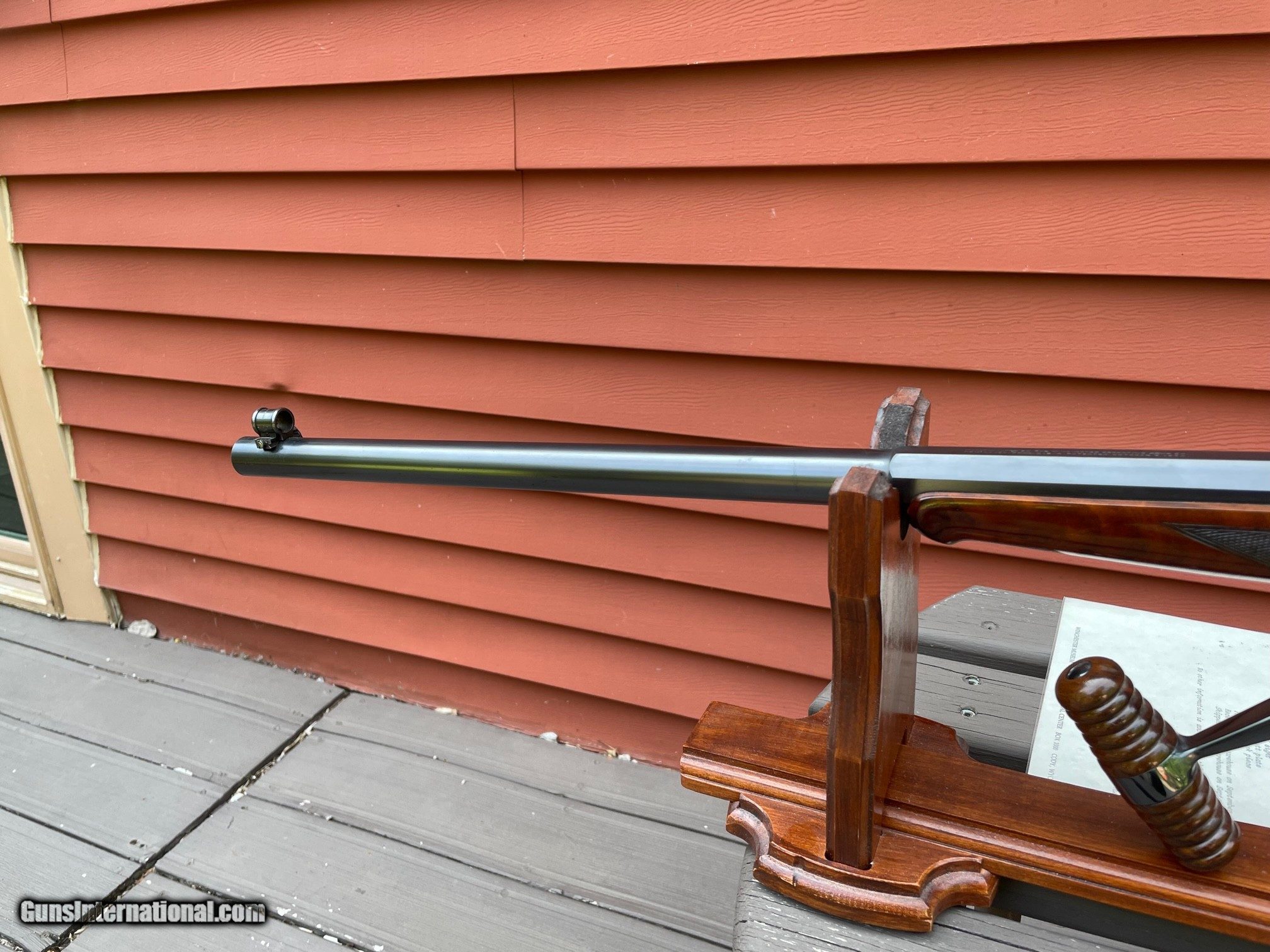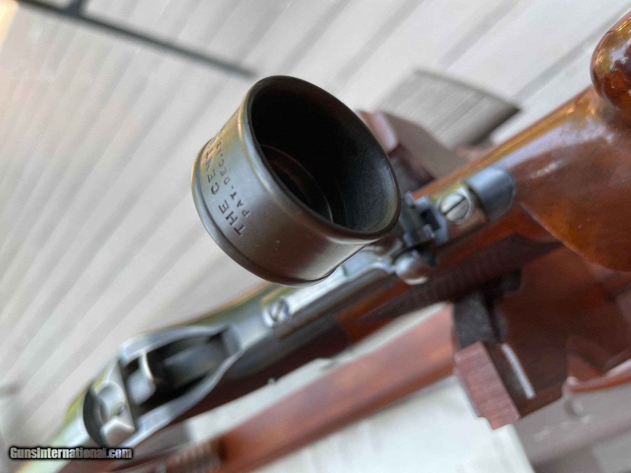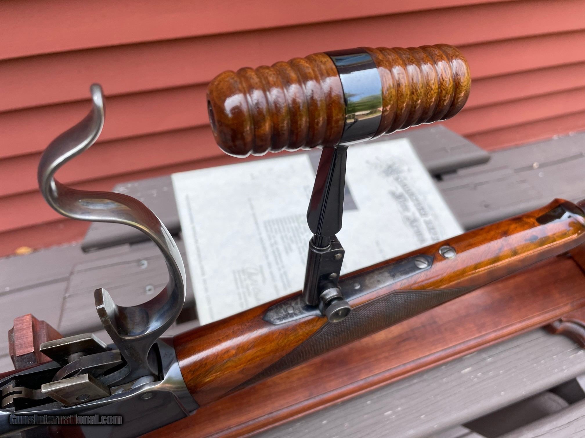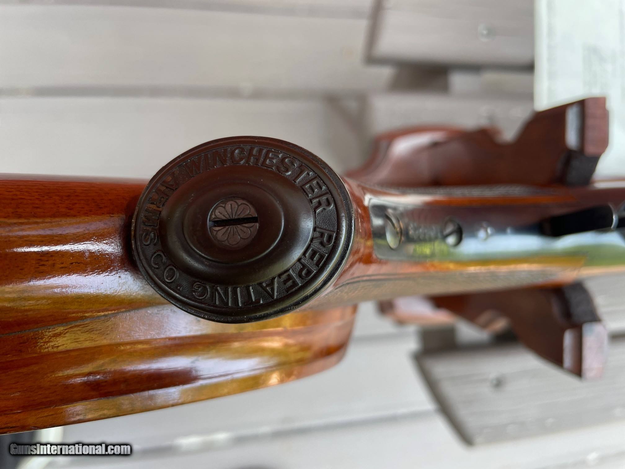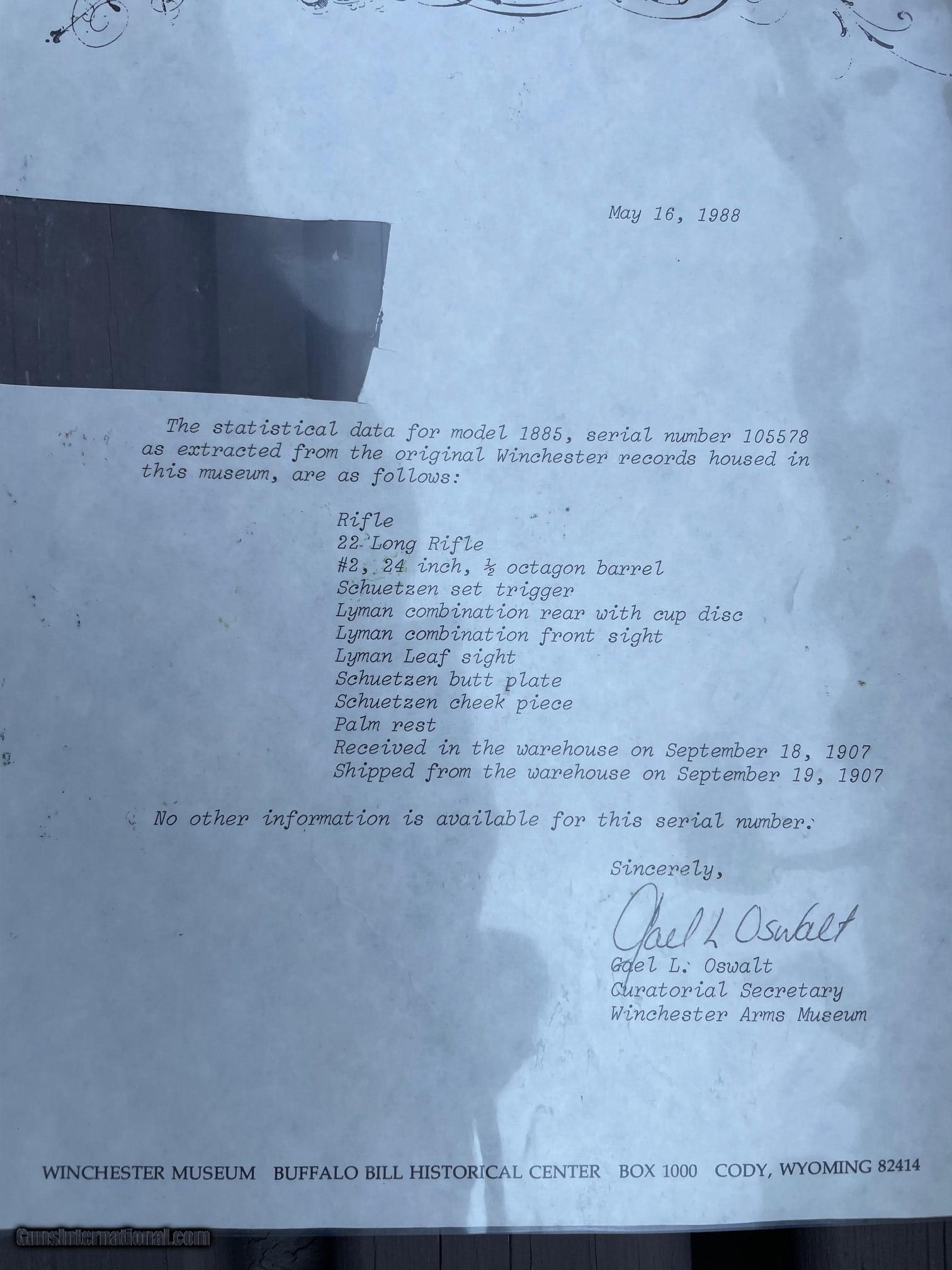 Description: PENDING THIS IS A DELUXE SCHUETZEN DOUBLE SET TRIGGER 1885 WINCHESTER RIFLE. Gun features fancy deluxe burl wood with a cheek piece and Swiss style butt plate. Stocks retain about 98% of the varnish. 24 inch half octagon #2 barrel in caliber 22 Long Rifle. Bore is very good. Original front globe sight with both folding rear sight and folding tang sight. Correct Schuetzen double set triggers. Receiver retains about 98% of the glossy blue. The trigger pull is the best I ever felt. This Winchester would be the center piece of any Winchester collection. Manufacture date 1907. FFL IS REQUIRED. I ship insured to the lower 47 states only, Sorry no California sales $100 SHIPPING. MERRY CHRISTMAS SOLD |