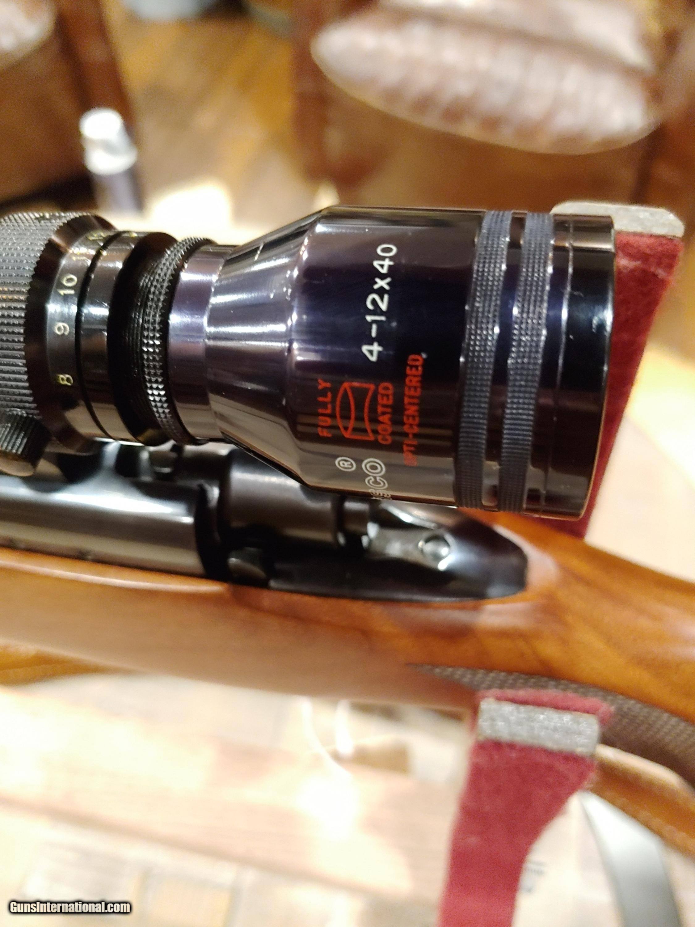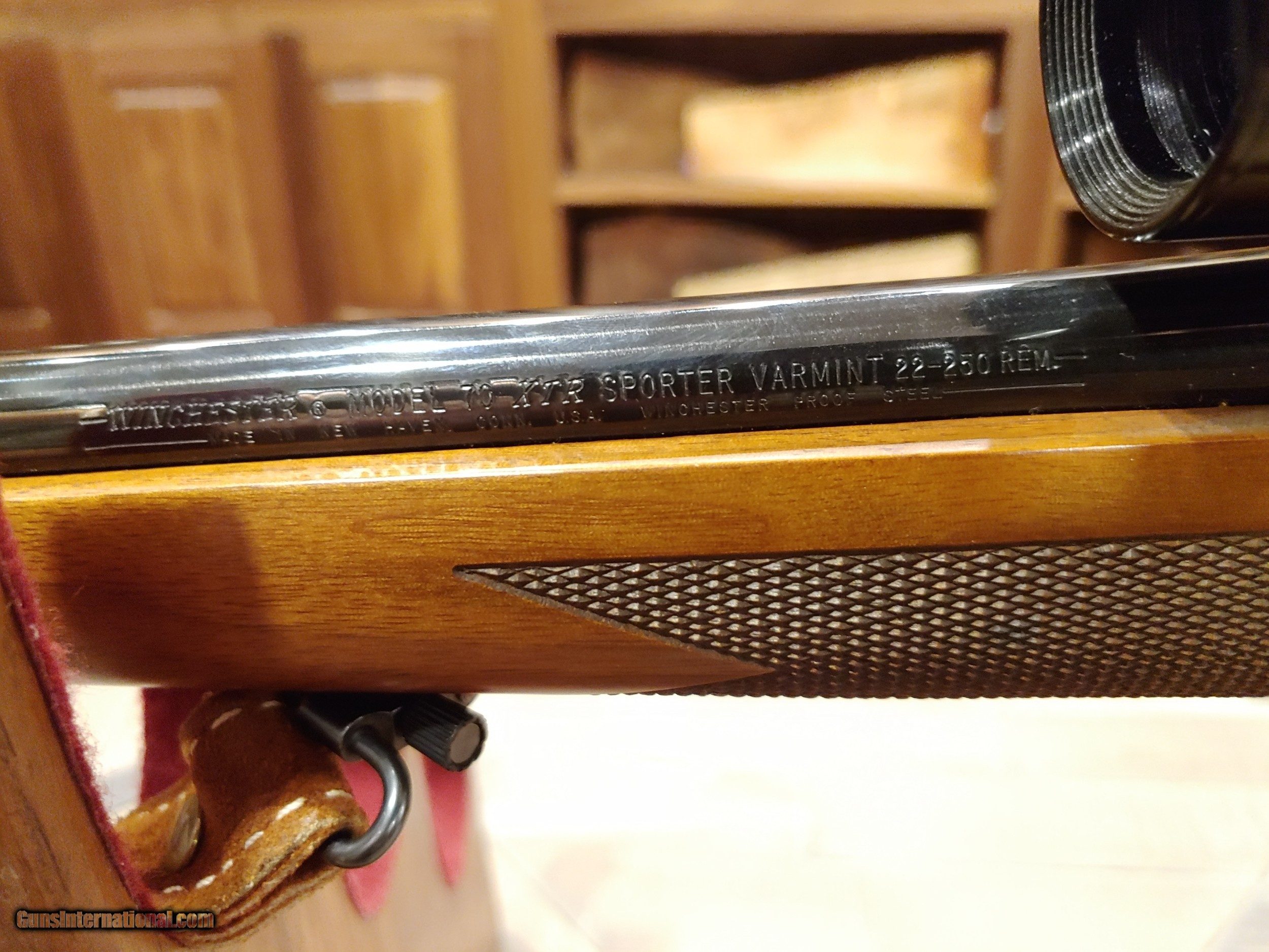 Description: This Winchester M70 XTR is a 23" blued-barrel bolt-action rifle using 22-250 Rem rounds. It has a 44.5" overall length and an LOP of 13.5". The gun features a wooden stock with a checkered grip & forearm. Comes with a Tasco 4-12x40 Waterproof Scope and a cowhide sling. This gun is in excellent condition and could be considered "like new".
